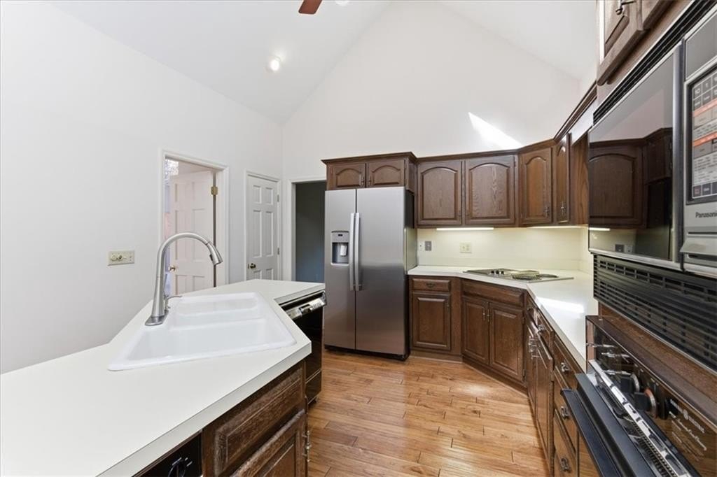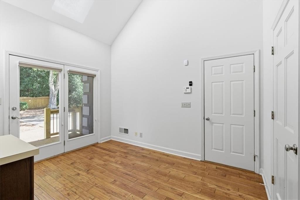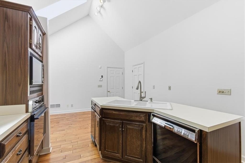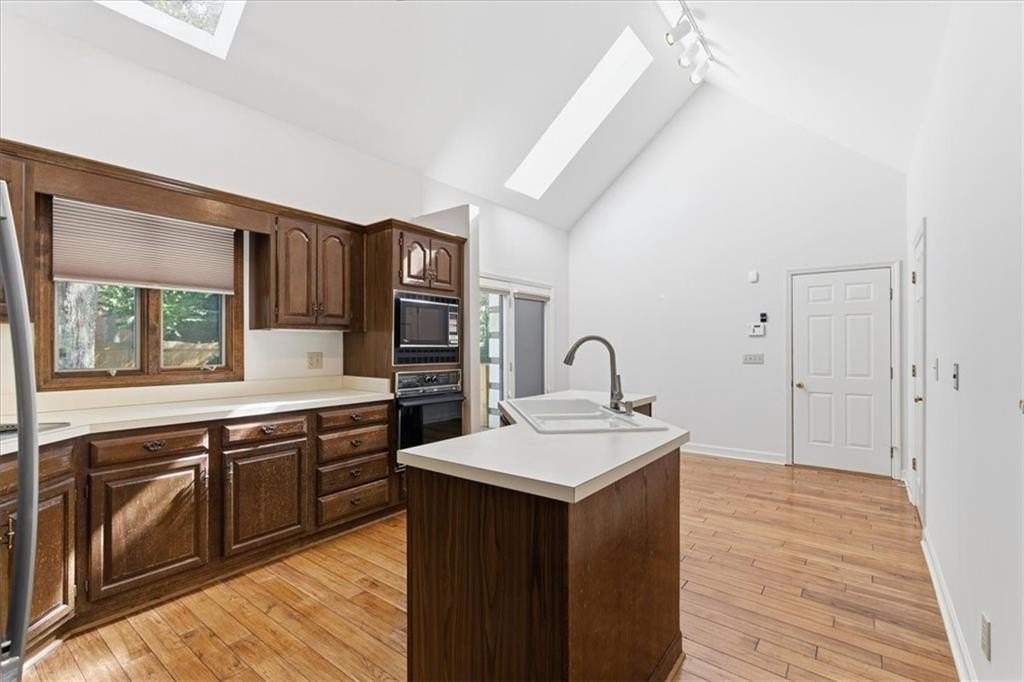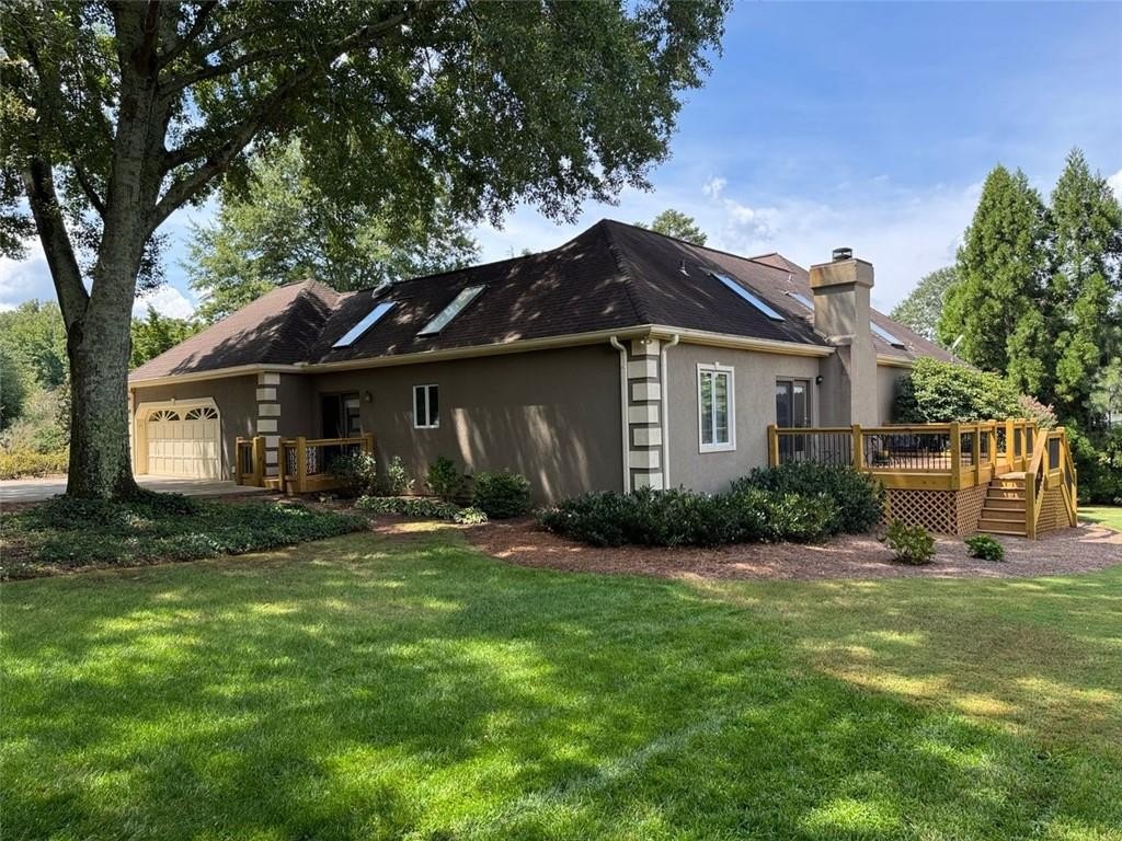 Inside, cathedral ceilings, skylights, and elegant arched transom windows fill the home with natural light, creating a bright and inviting atmosphere. The great room centers around a beautiful fireplace and features two full-glass double doors that open to a spectacular deck — perfect for outdoor entertaining or quiet relaxation.