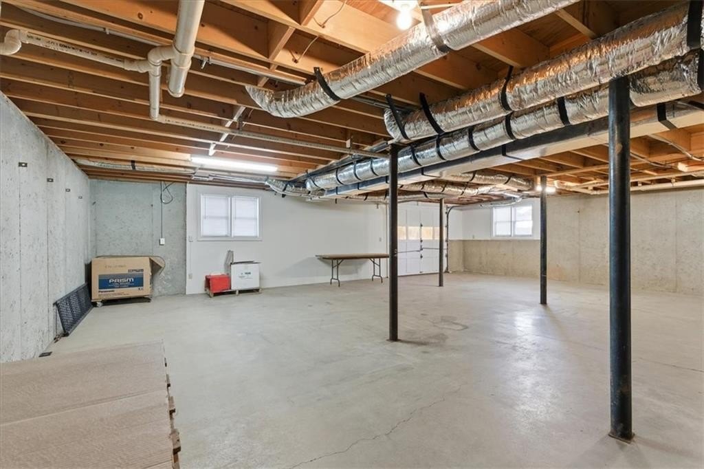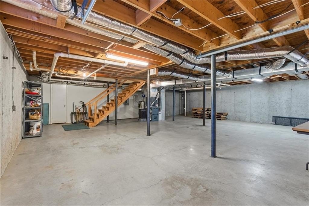 Downstairs, the partial basement includes a large unfinished area with a boat door — perfect for a workshop, hobby space, or finishing into a media room.