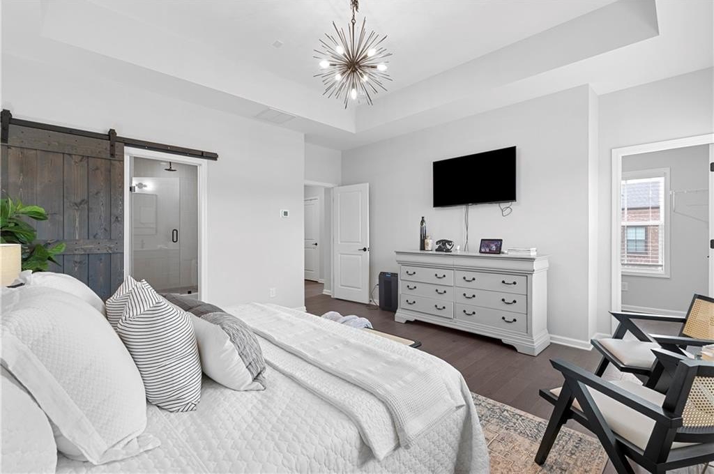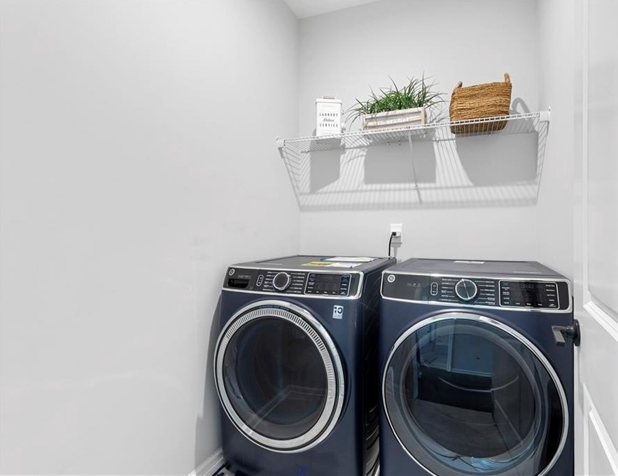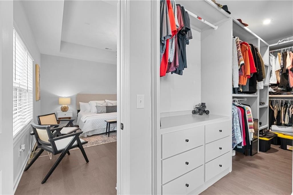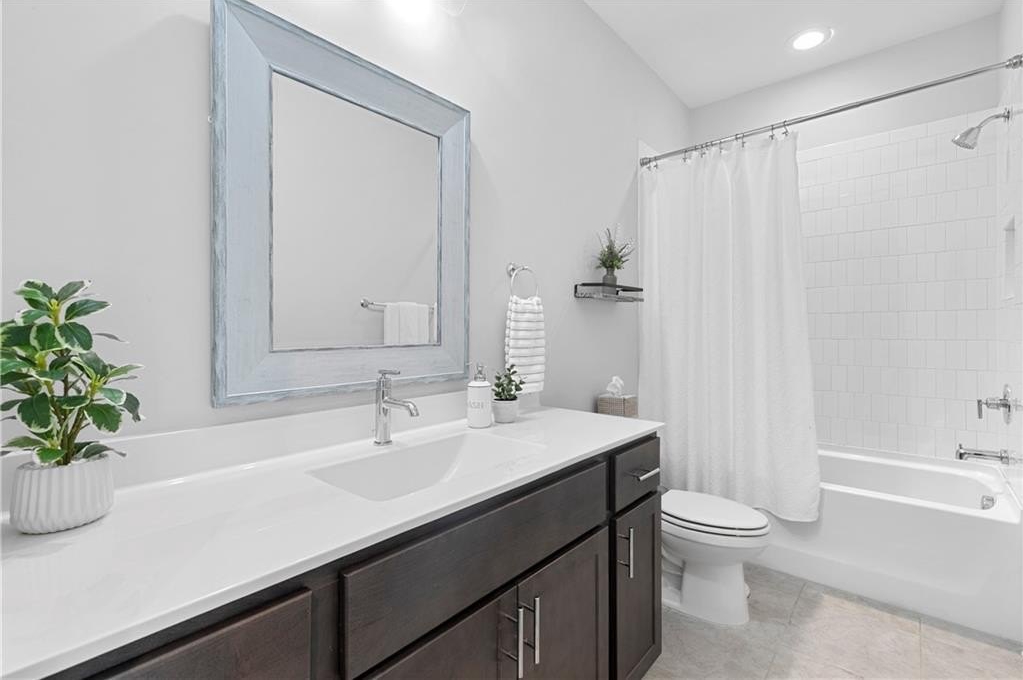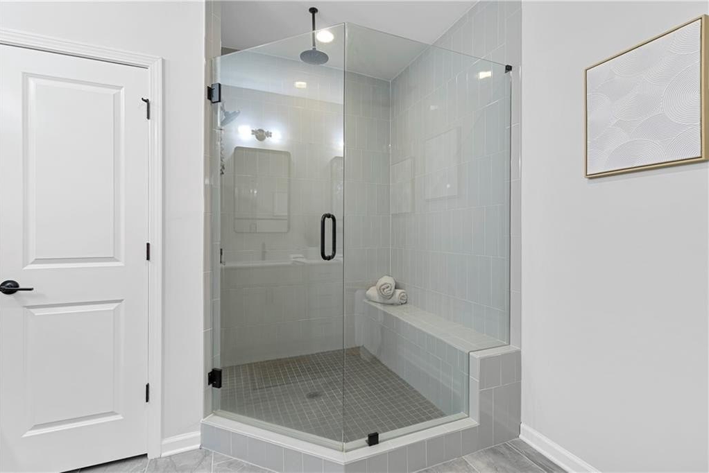 Upstairs, you’ll find the owner’s suite featuring tray ceilings, a spa-inspired bathroom with double vanities, a glass-enclosed walk-in shower, a private water closet, and a generous walk-in closet with built-ins and natural light. Two additional guest bedrooms share a full bathroom with a stone countertops vanity and shower/tub combo. A laundry room with washer and dryer and a large linen closet provide extra convenience.