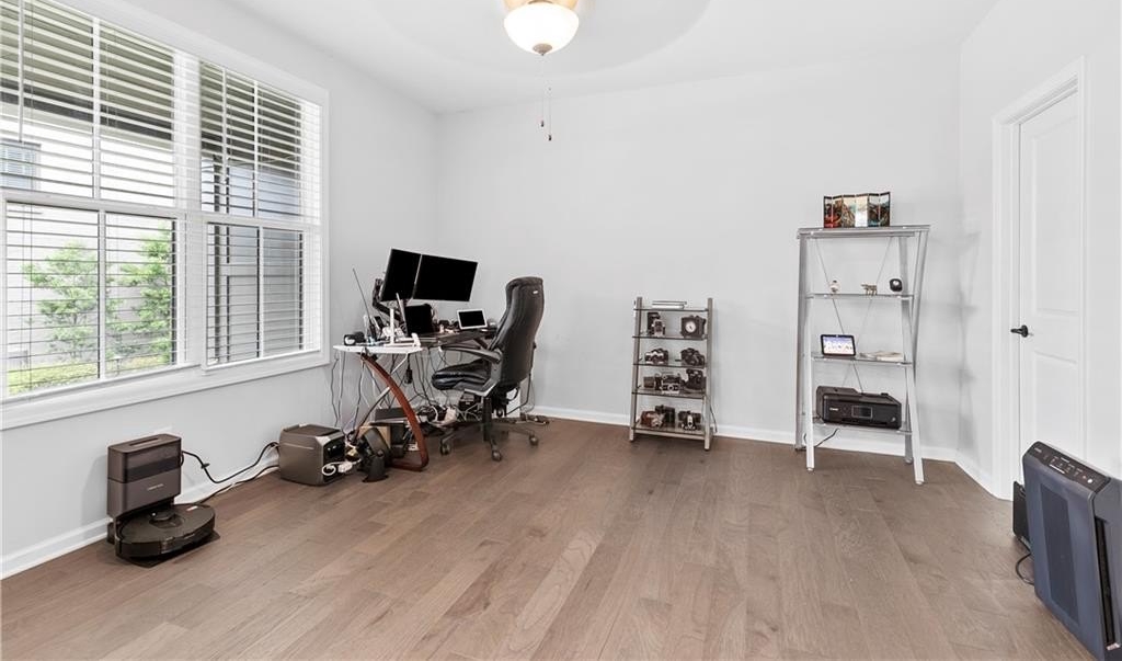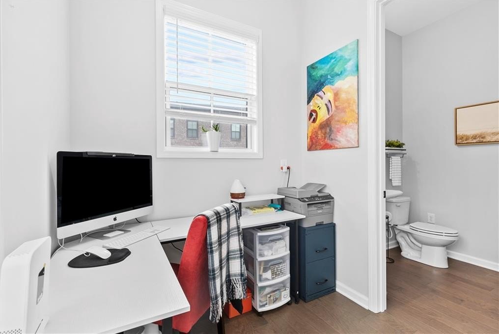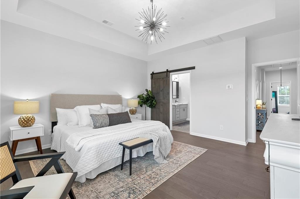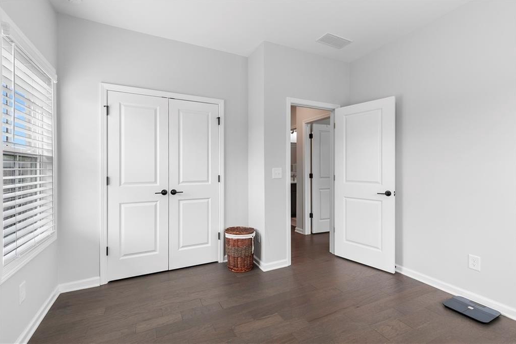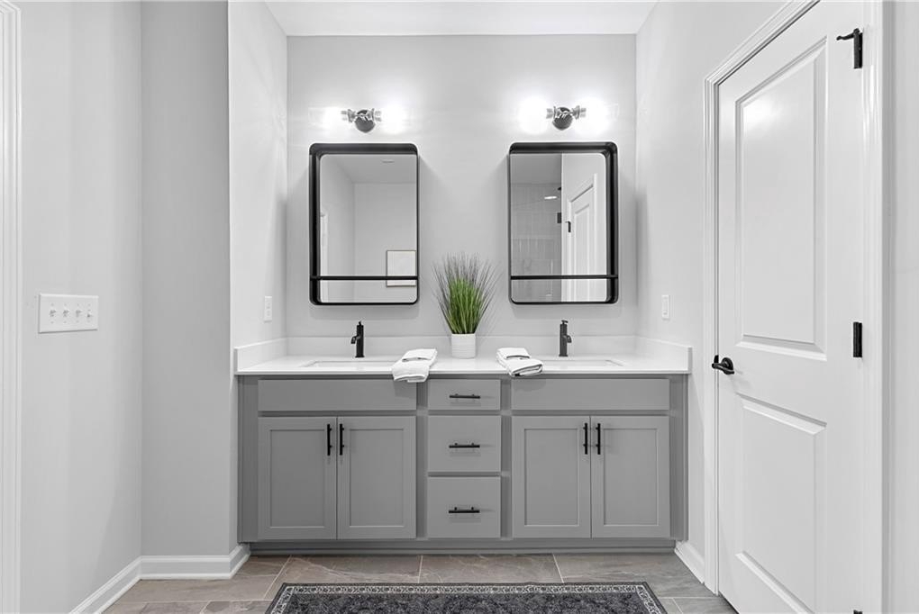 Upstairs, you’ll find the owner’s suite featuring tray ceilings, a spa-inspired bathroom with double vanities, a glass-enclosed walk-in shower, a private water closet, and a generous walk-in closet with built-ins and natural light. Two additional guest bedrooms share a full bathroom with a stone countertops vanity and shower/tub combo. A laundry room with washer and dryer and a large linen closet provide extra convenience.