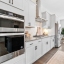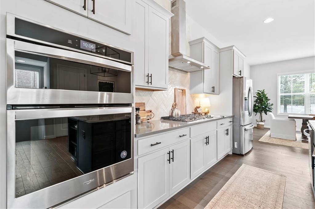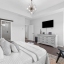 The main level is designed for everyday comfort and entertaining. The gourmet kitchen boasts quartz countertops, a large island with sink and seating, a gas cooktop with vent hood, built-in oven and microwave, 3-door stainless steel fridge, tile backsplash, and a large walk-in pantry. Across the kitchen, a bar nook with wine cooler and stone counters offers a stylish touch. The dining area is located near a tucked-away desk nook, ideal for a home office setup. The cozy living room, complete with a gas fireplace, opens up to a private deck, perfect for indoor-outdoor living.
