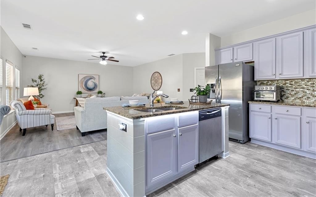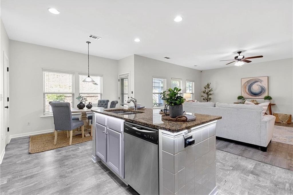 The main level features a bedroom and full bath, ideal for guests or multi-generational living, along with a separate dining room for gatherings. The kitchen is a true centerpiece, showcasing a large granite island, stainless steel appliances, and an open layout that flows easily into the living area.