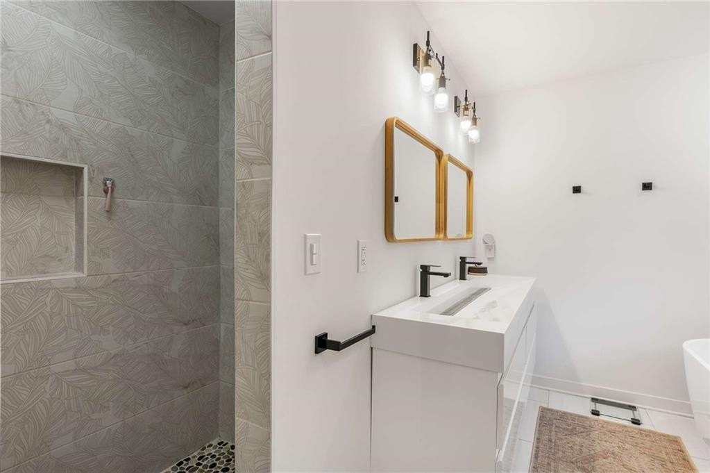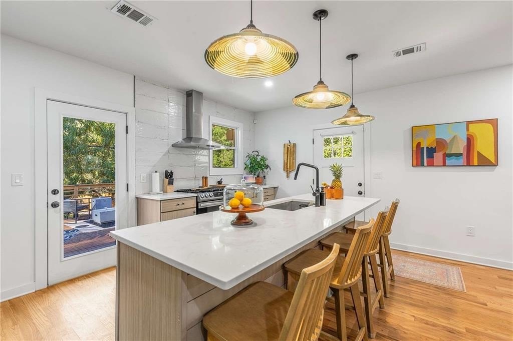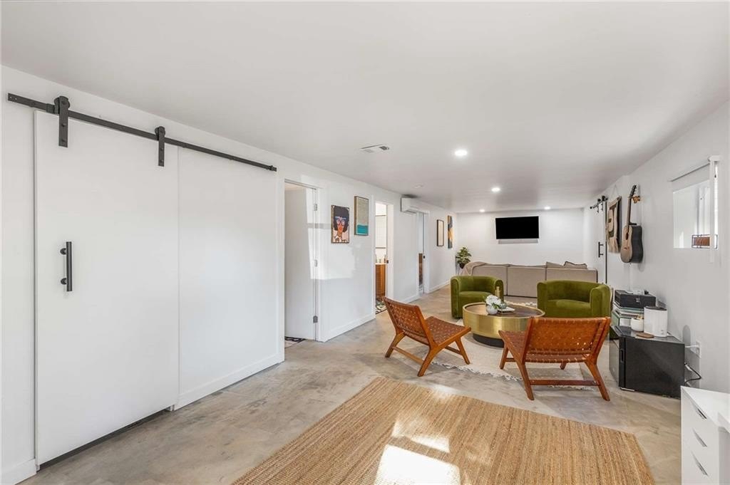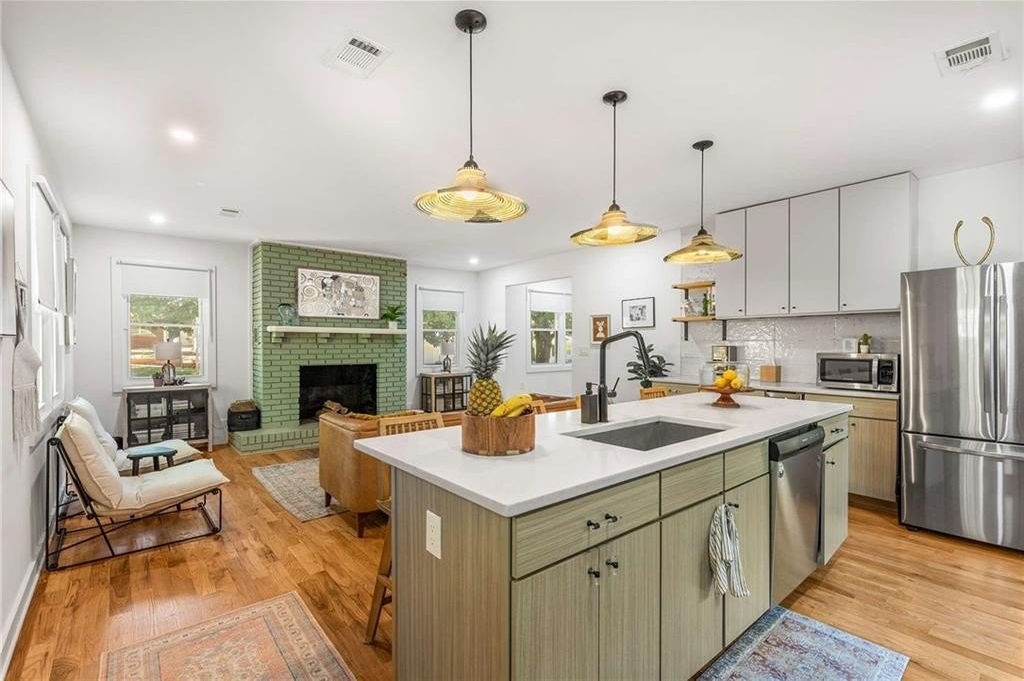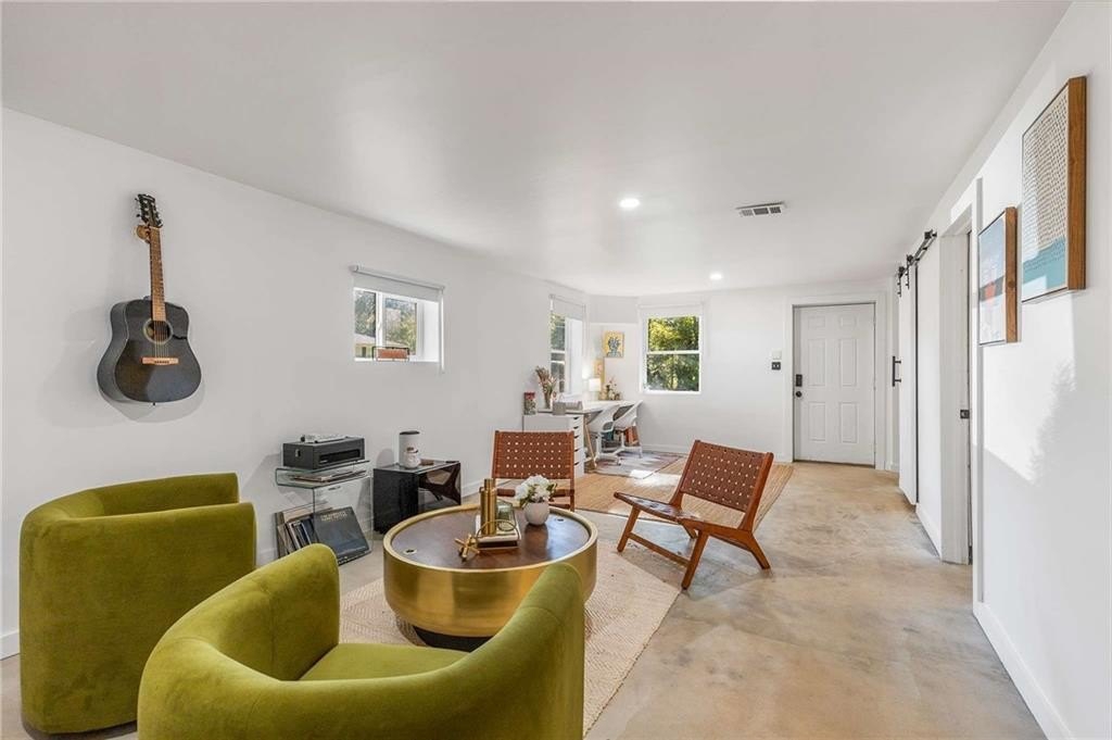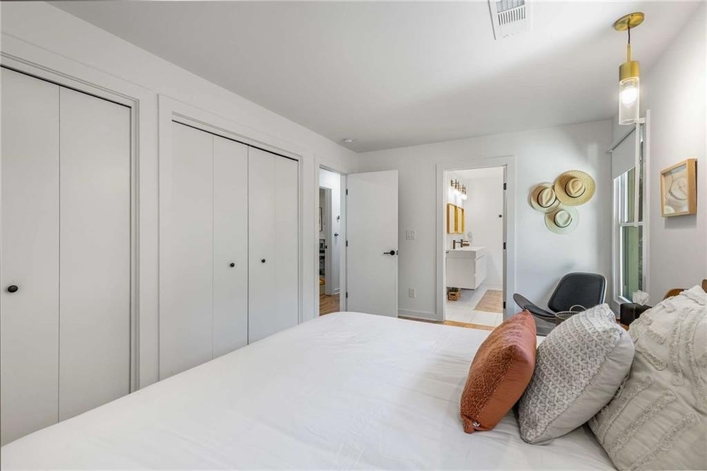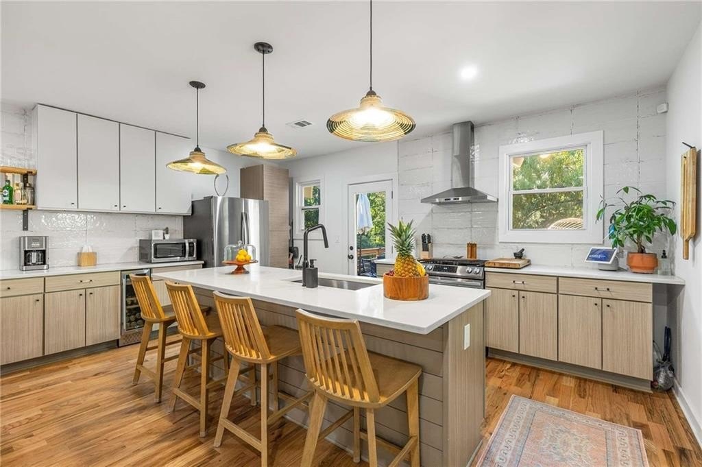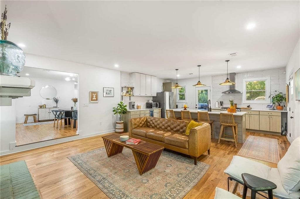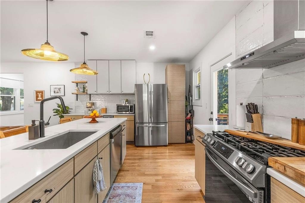 An architectural-modern showpiece on an expansive double lot, this residence marries relaxed sophistication with luminous, open-concept living and a floor plan made for gathering. A dramatic central core showcases a sunken living room anchored by clean lines and generous glazing, flowing seamlessly into a designer kitchen with statement island, premium finishes, and purposeful storage. Multiple doors open to outdoor living—including a treehouse-style deck nestled in the canopy creating effortless indoor–outdoor continuity for morning coffee, weeknight dinners, and weekend entertaining. The luxury-inspired owner’s suite is a private retreat, appointed with a beautifully tiled bath featuring a soaking tub, oversized walk-in shower, and a sleek floating double vanity. Throughout the main level, hardwood floors and curated lighting elevate the ambiance, while sightlines extend to the grounds, emphasizing space and serenity. Down a wide, elegant staircase, the finished terrace level functions as a true second living zone—perfect for multi-gen living, guests, or an epic media/game area—with two additional bedrooms, a full bath, and a large living/rec room with flexible zones for work and play. A second driveway simplifies access and parking, and a bonus garage offers limitless potential for a studio, gym, she-shed, or workshop. Thoughtful design, abundant natural light, and versatile spaces culminate in a rare, refined retreat crafted for elevated everyday living and unforgettable gatherings. Located in the highly desired King Springs School District. Close to Silver Comet Trail, Food Trucks, Smyrna Market Village and The Battery.