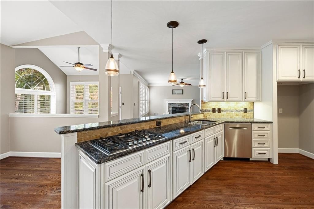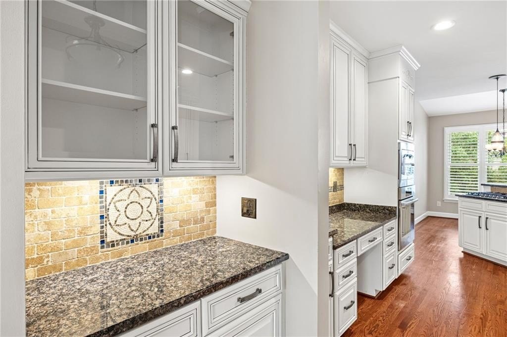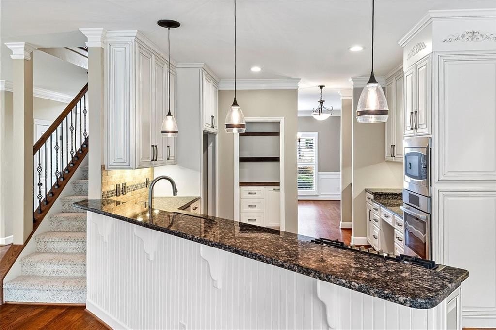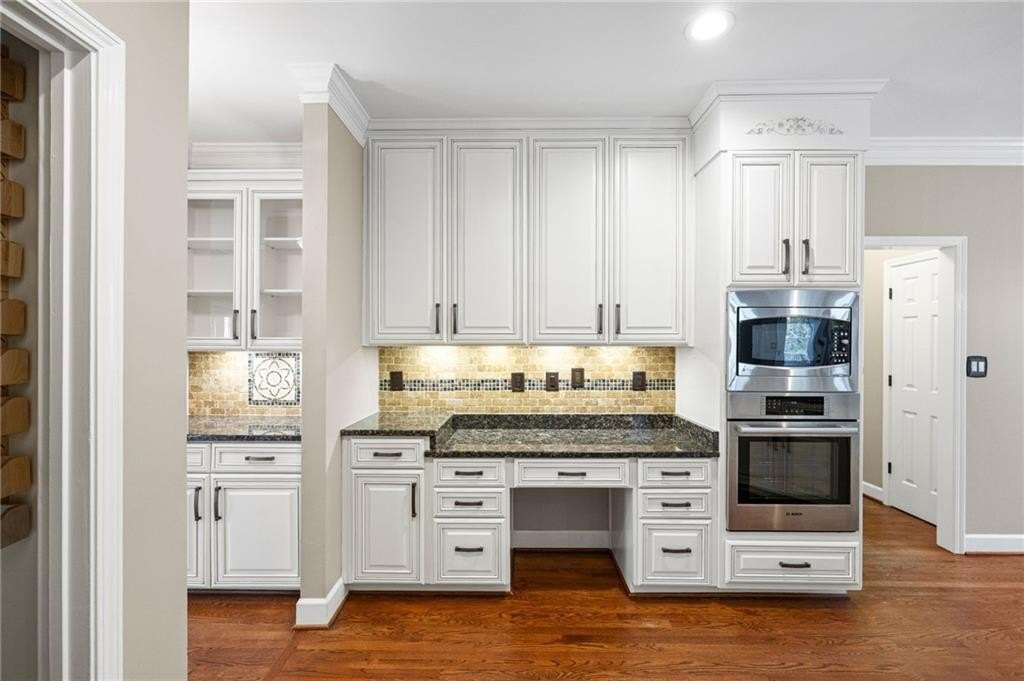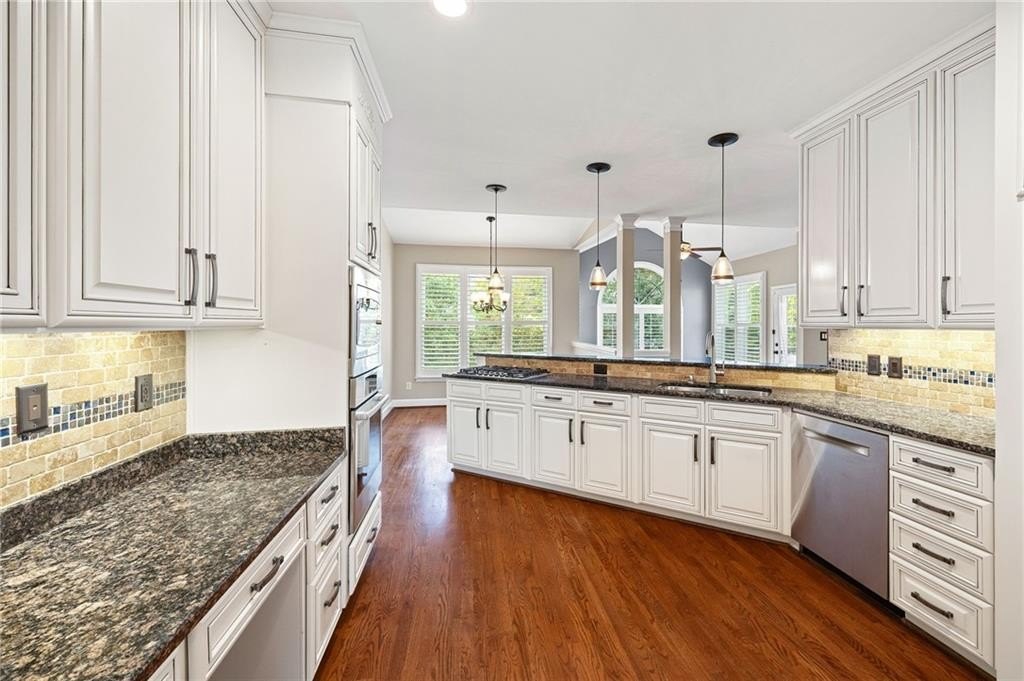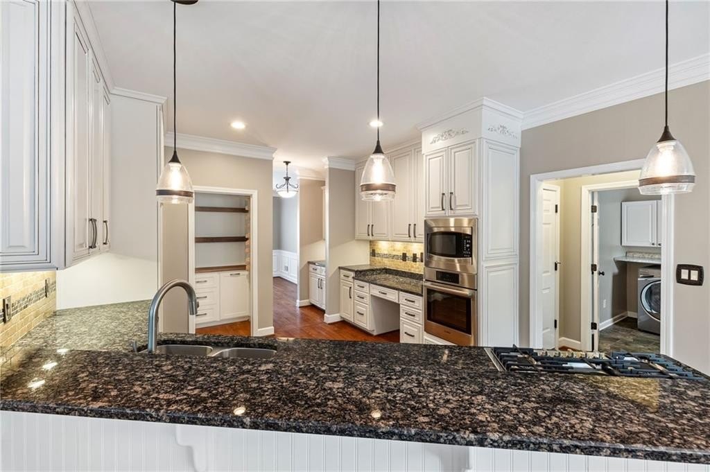 Cozy Family Room with Brick Gas Log Fireplace and attached Keeping Room for all your Family Gatherings! Completely Renovated Kitchen with Country White Custom Cabinets, Bosch Gas Stainless Steel Appliances, Granite Counters, Tile Backsplash, Under Cabinet Lighting & Custom
