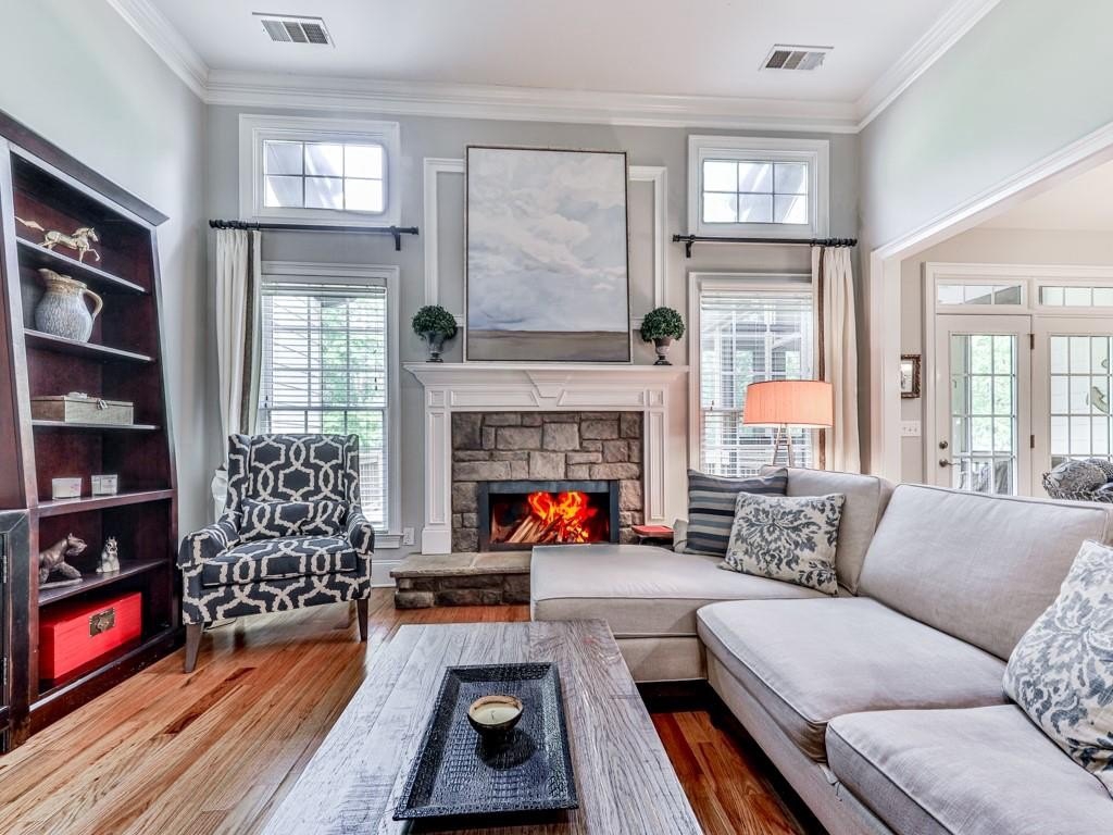 The heart of the home is the expansive kitchen, complete with abundant cabinetry and a large eat-in breakfast area, perfect for casual dining or entertaining. It opens seamlessly into an oversized family room highlighted by a striking stone fireplace, ideal for cozy evenings at home.