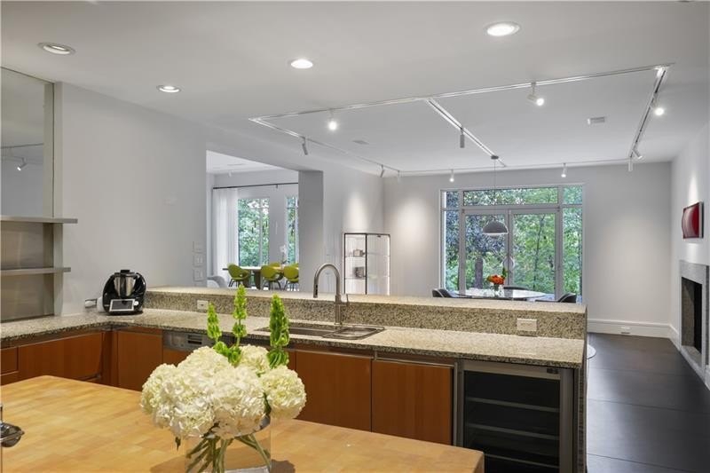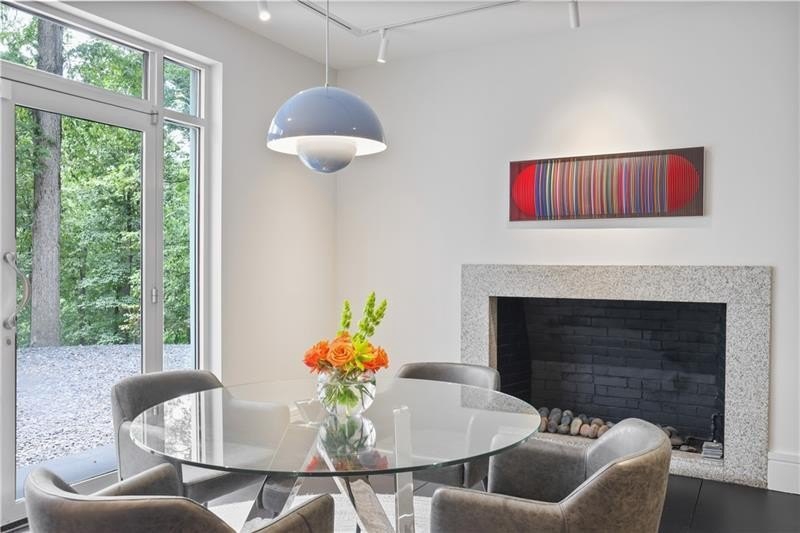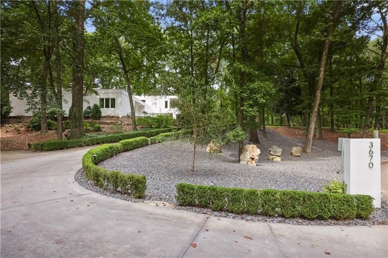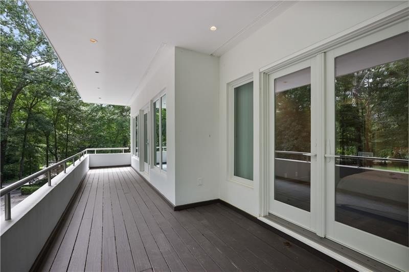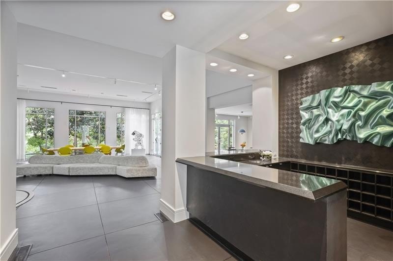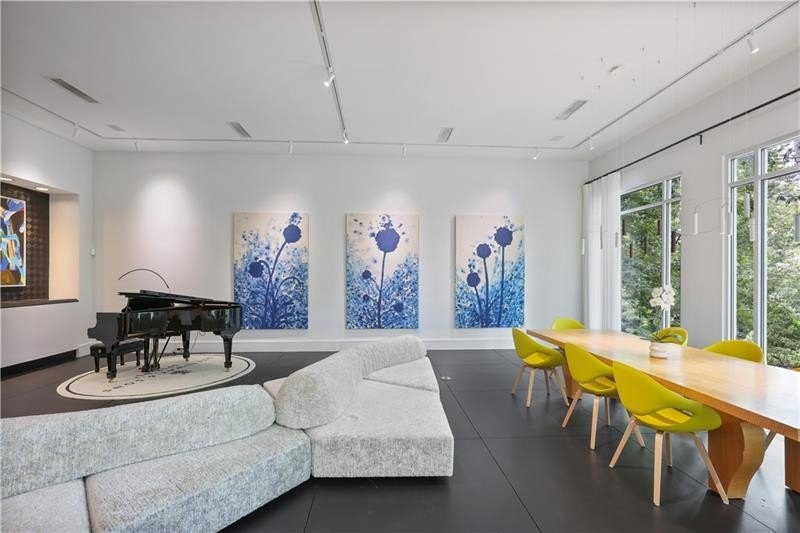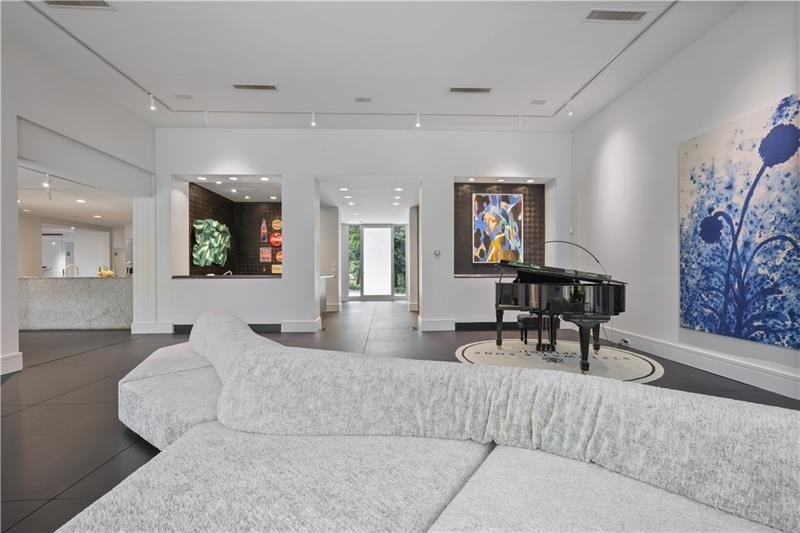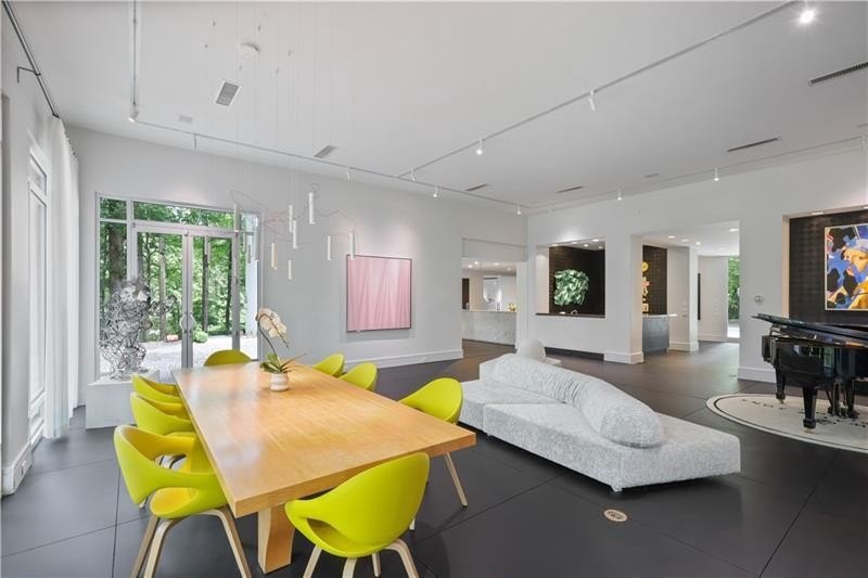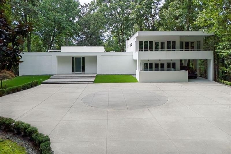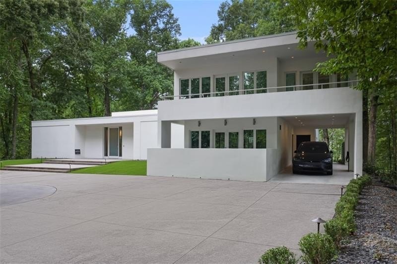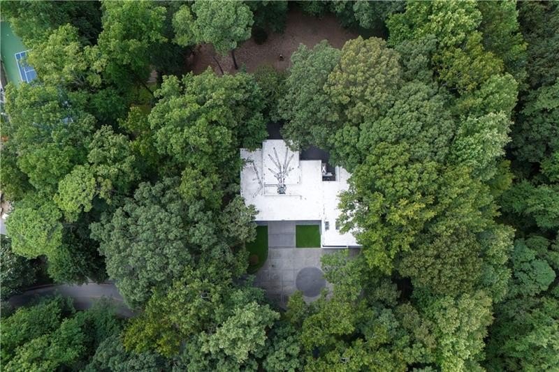 This spectacular contemporary estate on 2.5 private acres stands as a true landmark in Buckhead's prestigious Paces neighborhood. Sophisticated in design yet warm and livable, the property offers a rare balance of modern architecture and everyday comfort. A private drive leads to an expansive motor court, mature landscaping, and a turfed front lawn, setting the stage for the home's striking entrance. Inside, a dramatic foyer with 12-foot ceilings introduces sun-drenched interiors framed by walls of windows, soaring ceilings, and sleek contemporary details. The main-level primary suite boasts a newly renovated bath and an oversized custom closet. Designed for both everyday living and grand entertaining, the main level showcases a vast living room that also functions as a formal dining space for 12+, anchored by a large wet bar ideal for gatherings. Additional highlights include a private office, stylish powder room, and a comfortable family room. The chef's kitchen features stone counters, SieMatic cabinetry, Gaggenau ovens, an 8-burner Russell gas range, and a wine refrigerator, and flows seamlessly into a fireside breakfast room overlooking the lush, private backyard-complete with ample space for a future pool. Upstairs, two bedrooms and two bathrooms are complemented by a spacious bonus room that opens to a covered deck, perfect for year-round outdoor enjoyment. A possible fourth bedroom, currently serving as an office, enhances the home's flexibility. New windows throughout fill the interiors with natural light and frame views of the surrounding greenery. Outdoor living is equally impressive, with porches on both levels, expansive lawns, and multiple areas designed for recreation, relaxation, and entertaining. Located in the sought-after Jackson Elementary district and close to Buckhead's premier dining, shopping, and schools, this remarkable estate offers an unparalleled lifestyle in one of Atlanta's most coveted neighborhoods.