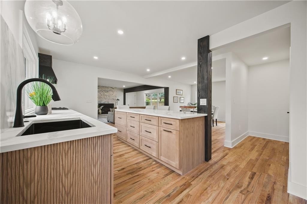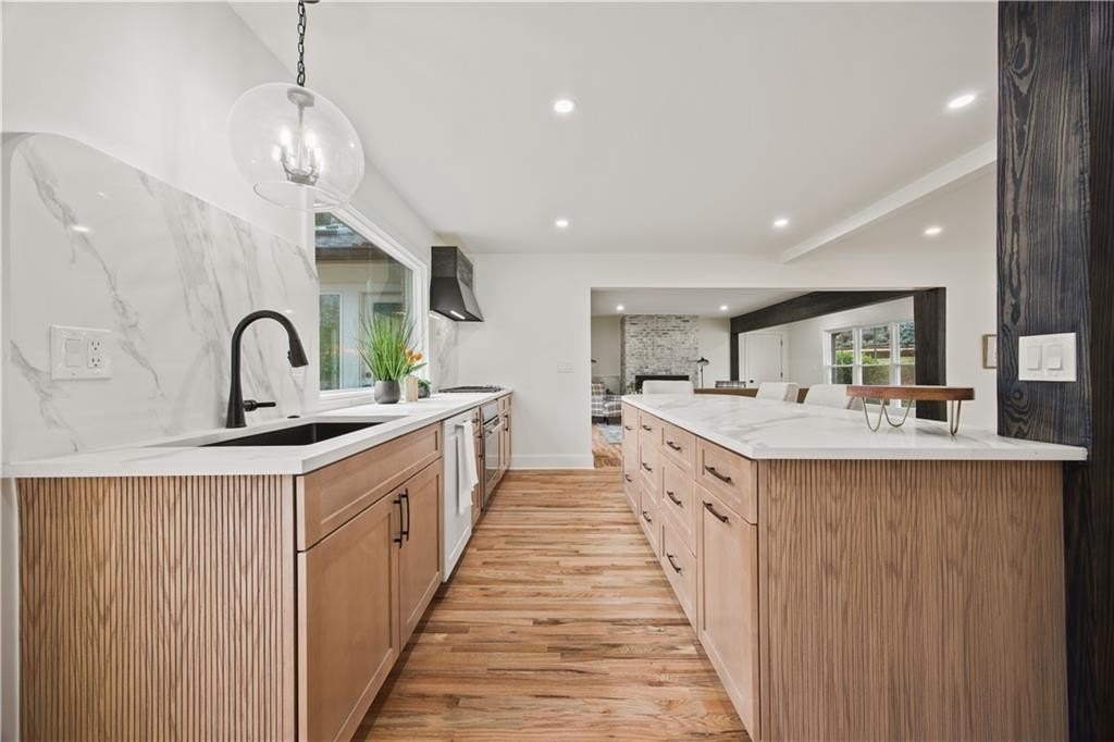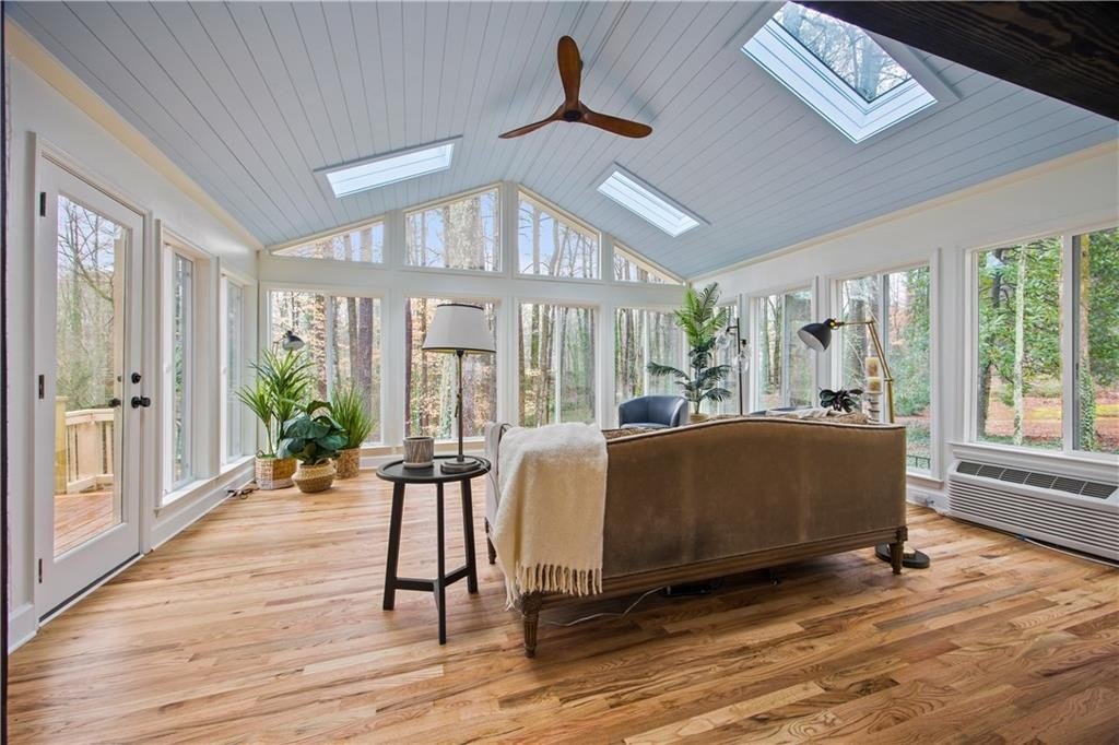 Fully Renovated 6BR/4.5BA with Terrace-Level In-Law Suite & Stunning Sunroom Inside the Perimeter. This beautifully reimagined home offers nearly 3,700 sq ft of stylish, move-in-ready living across three finished levels. The main level features a designer kitchen with premium finishes that opens to an inviting living room with a gas brick fireplace. From there, step into the expansive sunroom—lined with windows on all sides and four skylights—a light-filled space perfect for entertaining or relaxing as you overlook the wooded backyard.