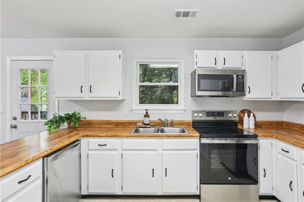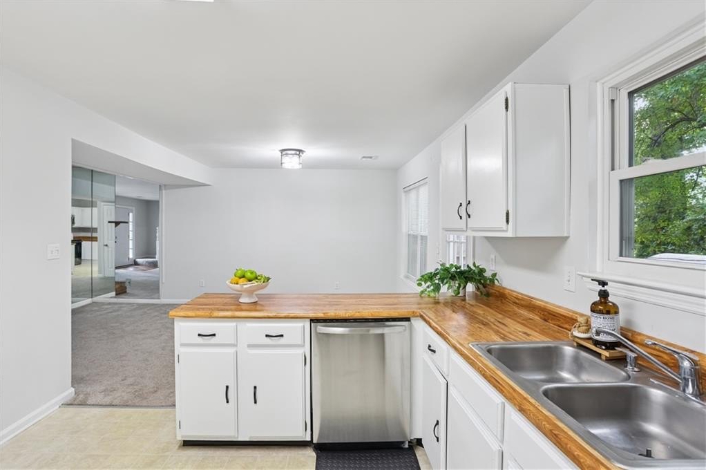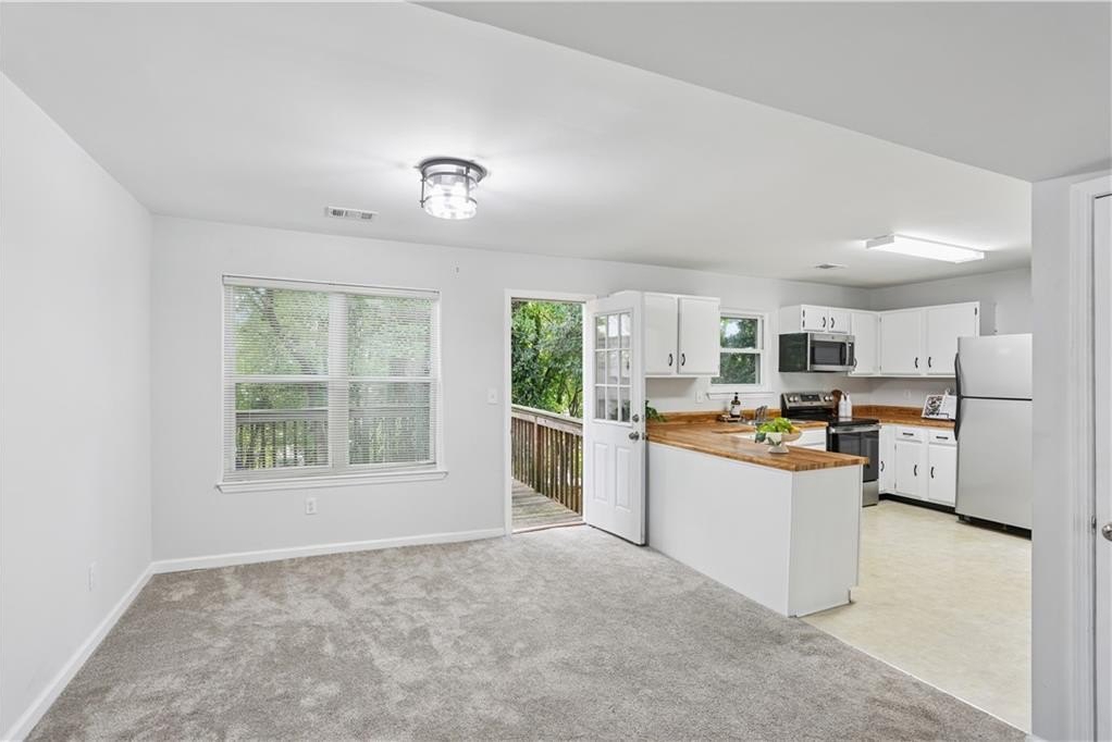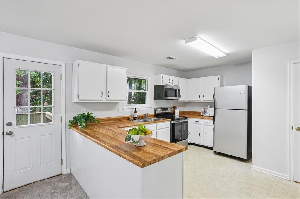Inside, you’ll find a welcoming layout featuring a spacious garage with additional storage, a beautiful kitchen with butcher block countertops, white cabinetry, and stainless steel appliances, and an open living area ideal for relaxing or entertaining. Upstairs, there are two primary suites, each with a full bathroom and ample closet space, including one that has been recently renovated with modern updates.