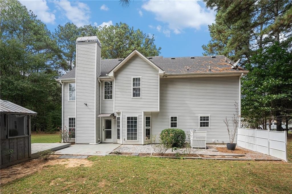 bar, stylish tiled backsplash, and plenty of cabinet space, creating the perfect spot for everyday meals and entertaining. Upstairs, the primary suite features a tray ceiling, a walk-in closet, and an ensuite bath with a double vanity, separate soaking tub, and shower. Two additional guest bedrooms share a full bath, with one offering direct access, providing flexibility for guests or family. Enjoy the outdoors on your private patio overlooking the large, level backyard. The property also includes an outbuilding and an additional storage shed, ideal for tools, hobbies, or extra storage. A 2-car garage completes this move-in-ready home. Located in a quiet, established neighborhood yet close to local shopping, dining, and top-rated schools, this home offers the perfect balance of serenity and convenience.