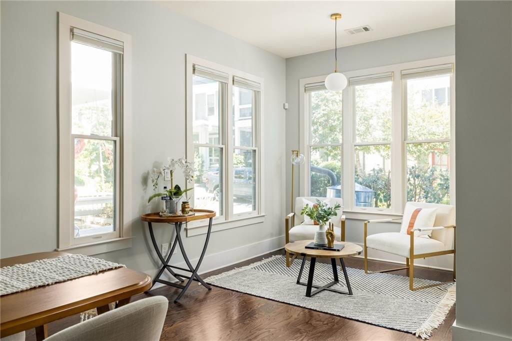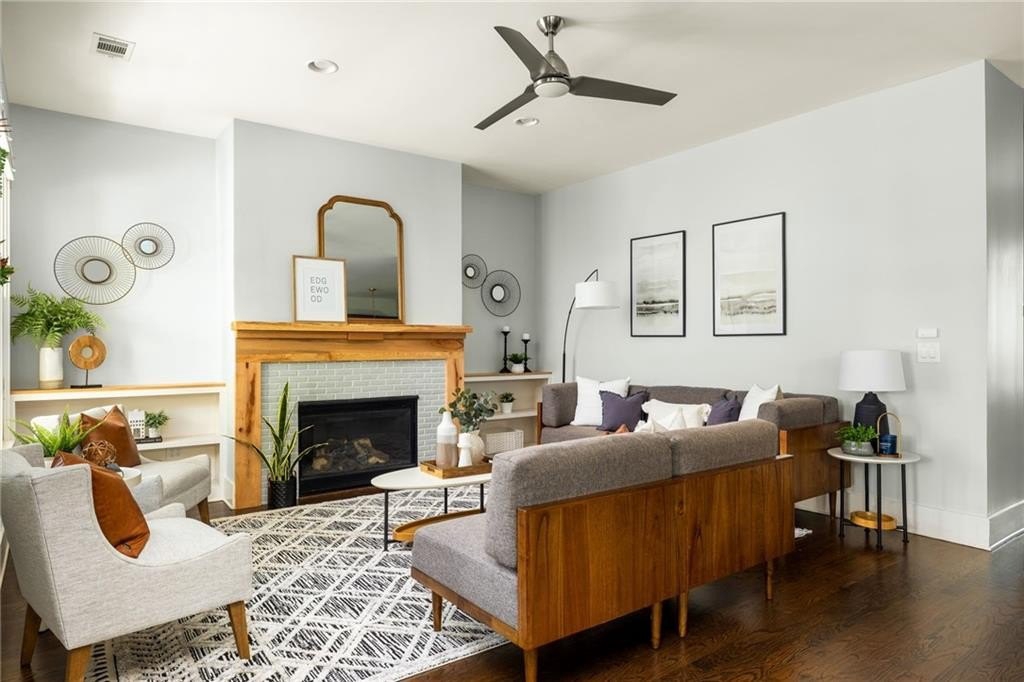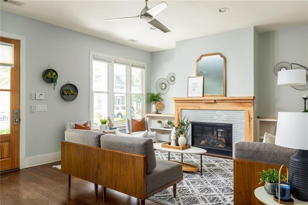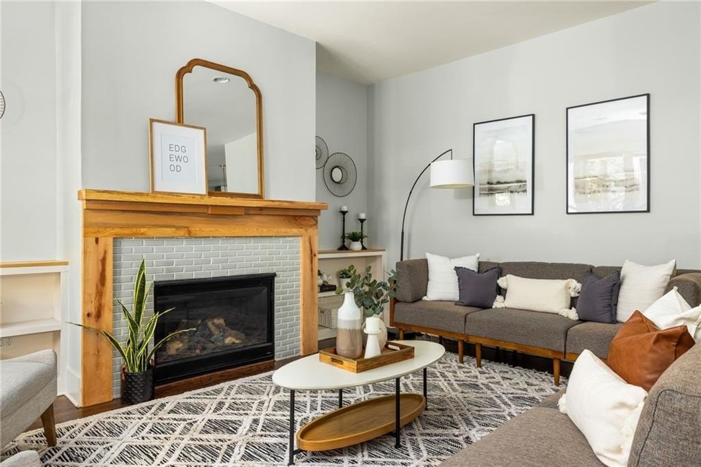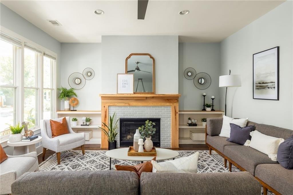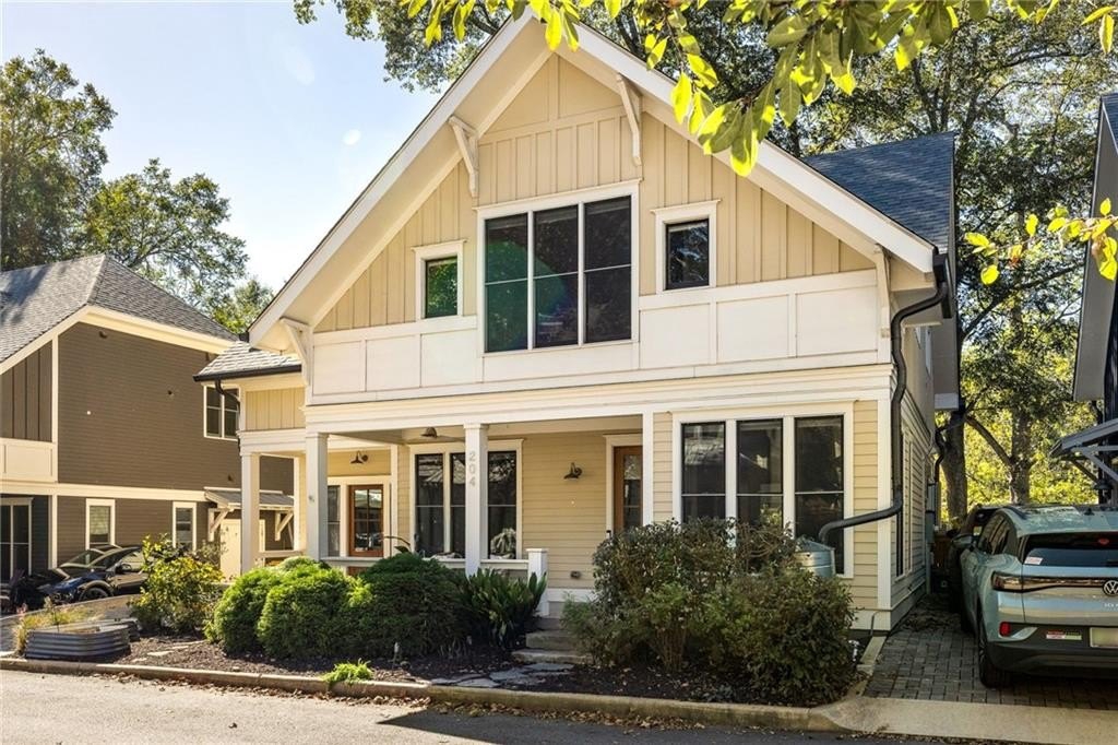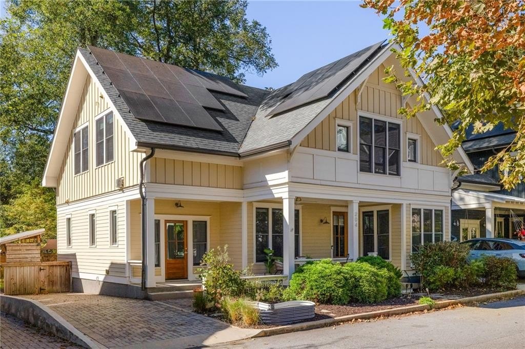 Welcome to La France Walk, a private neighborhood intentionally created to foster connection, sustainability, and a true sense of community. From the charming exterior, walk in to find soaring ceilings, abundant natural light, and an open floorplan with gas fireplace, custom built-ins, fresh paint and refreshed hardwood floors throughout. Chef’s kitchen features a professional style JennAir gas range, quartz countertops, and a breakfast bar for casual dining. Designed with flexibility in mind, the first-floor suite features a private entrance and updated bathroom, easily serving as a guest suite, home office or income-generating ADU. Upstairs, you’ll find a spacious loft perfect for a home office, den, or playroom. The oversized primary suite provides a serene retreat with newly updated bathroom including a spa-like shower system. Bonus space within the suite offers room for a Peloton to be tucked out of sight, reading nook, or second walk-in closet. Two additional bedrooms and another full bathroom complete the upper level. Built with energy efficiency in mind, this home includes solar panels, spray foam insulation, zoned HVAC, custom rain barrels, and a 220V outlet ready for your electric vehicle. The low-maintenance yard is beautifully landscaped with native plants. Outdoors, enjoy a spacious front porch for morning coffee or evening chats with neighbors, a rear patio for al fresco dining, and a private fenced yard for pets or play. You’ll also find an outdoor storage closet and side shed. Within La France Walk, residents enjoy a shared gathering space with porch swings, a firepit, and a bike pump station, all designed to encourage deep community and connection among neighbors. Located just two blocks from MARTA, minutes to the BeltLine, and surrounded by shops, parks, and restaurants, this home offers a perfect blend of location, design, and intentional community right in the heart of Edgewood.