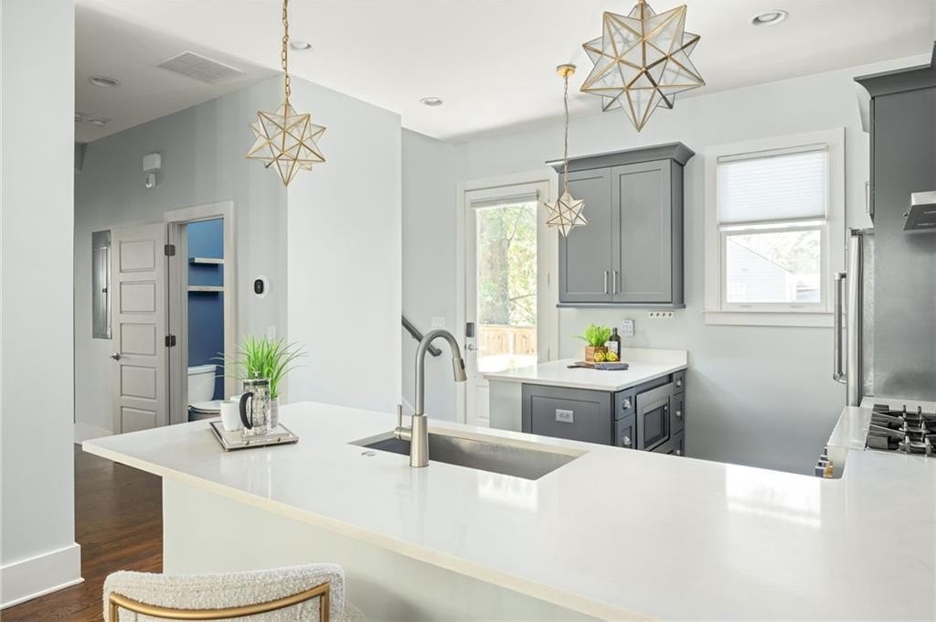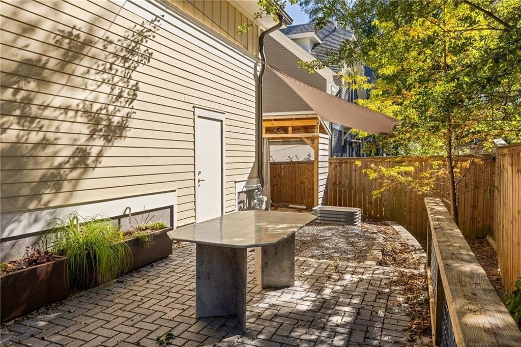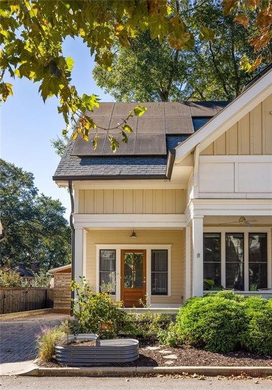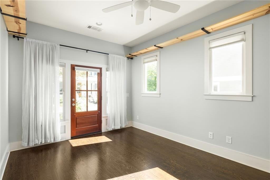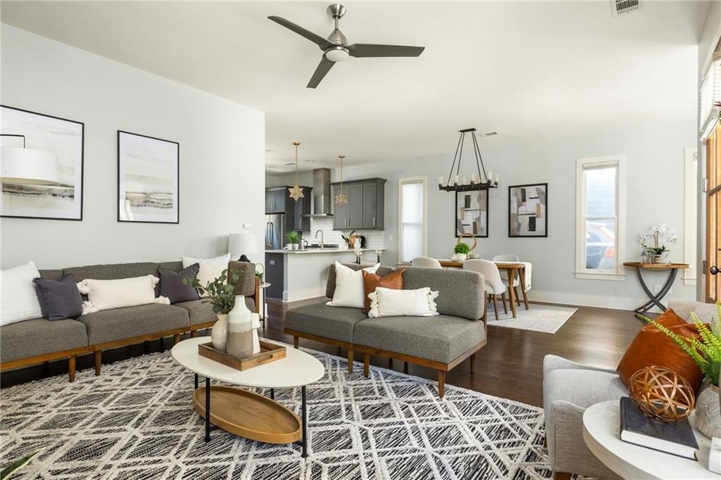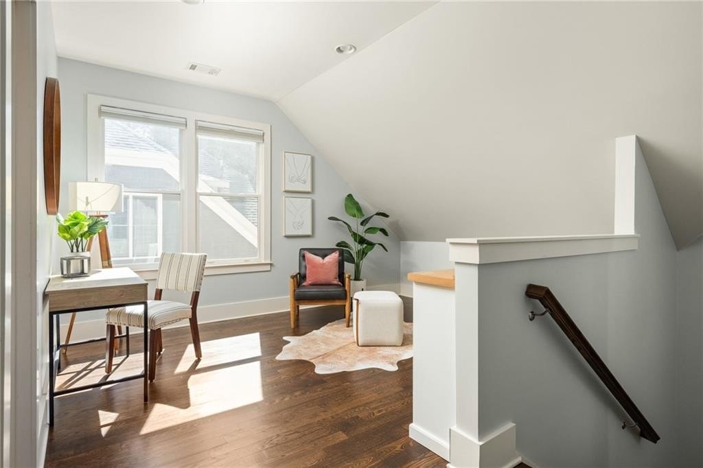 Welcome to La France Walk, a private neighborhood intentionally created to foster connection, sustainability, and a true sense of community. From the charming exterior, walk in to find soaring ceilings, abundant natural light, and an open floorplan with gas fireplace, custom built-ins, fresh paint and refreshed hardwood floors throughout. Chef’s kitchen features a professional style JennAir gas range, quartz countertops, and a breakfast bar for casual dining. Designed with flexibility in mind, the first-floor suite features a private entrance and updated bathroom, easily serving as a guest suite, home office or income-generating ADU. Upstairs, you’ll find a spacious loft perfect for a home office, den, or playroom. The oversized primary suite provides a serene retreat with newly updated bathroom including a spa-like shower system. Bonus space within the suite offers room for a Peloton to be tucked out of sight, reading nook, or second walk-in closet. Two additional bedrooms and another full bathroom complete the upper level. Built with energy efficiency in mind, this home includes solar panels, spray foam insulation, zoned HVAC, custom rain barrels, and a 220V outlet ready for your electric vehicle. The low-maintenance yard is beautifully landscaped with native plants. Outdoors, enjoy a spacious front porch for morning coffee or evening chats with neighbors, a rear patio for al fresco dining, and a private fenced yard for pets or play. You’ll also find an outdoor storage closet and side shed. Within La France Walk, residents enjoy a shared gathering space with porch swings, a firepit, and a bike pump station, all designed to encourage deep community and connection among neighbors. Located just two blocks from MARTA, minutes to the BeltLine, and surrounded by shops, parks, and restaurants, this home offers a perfect blend of location, design, and intentional community right in the heart of Edgewood.