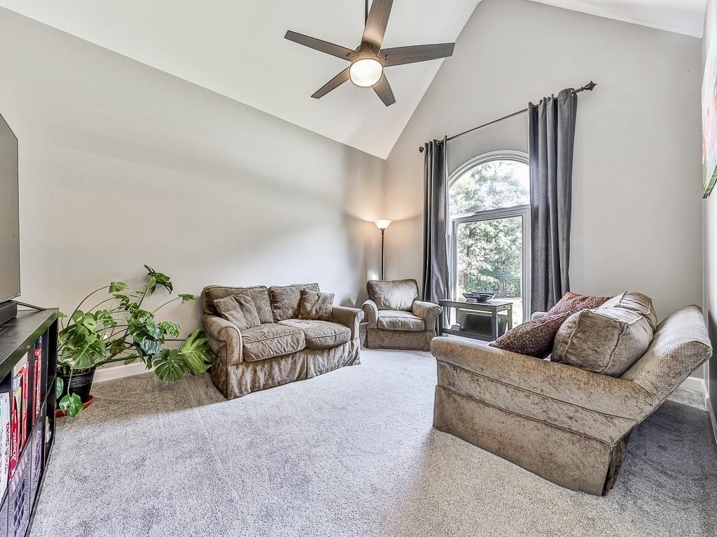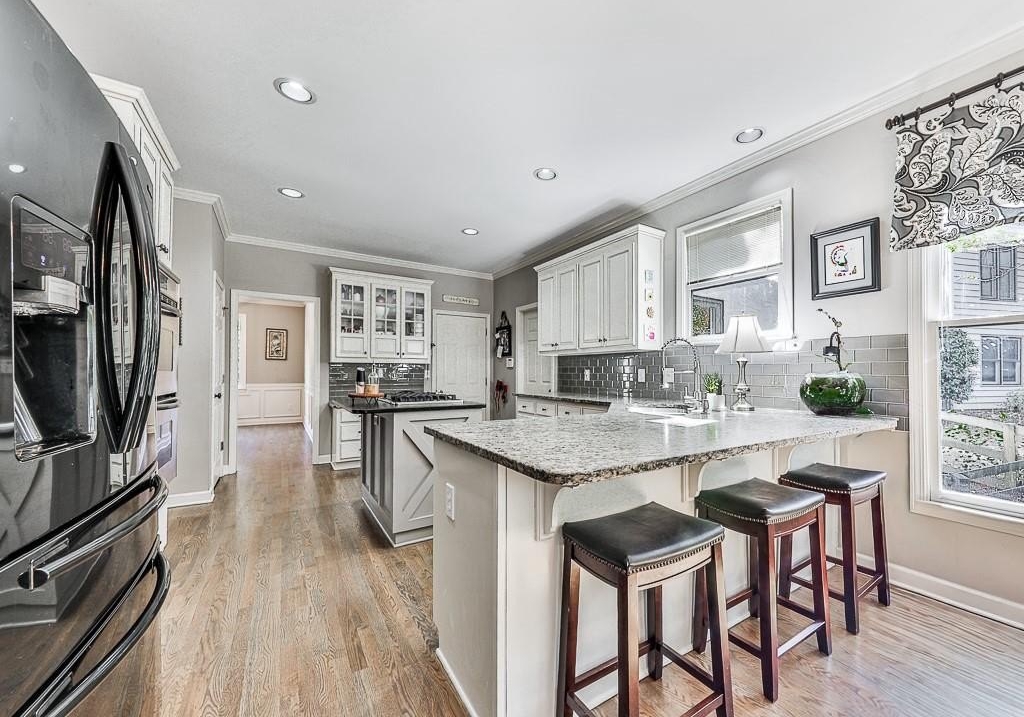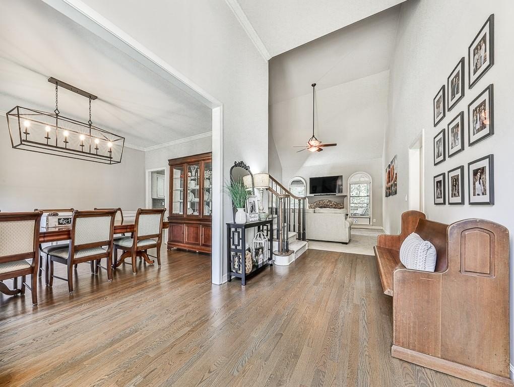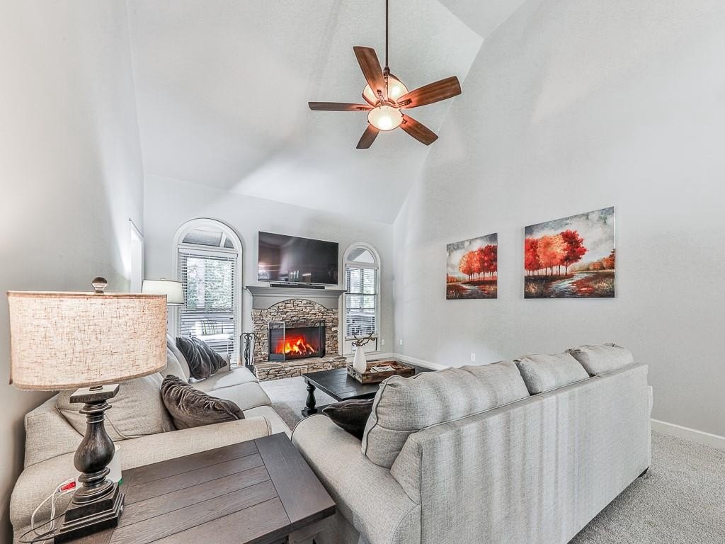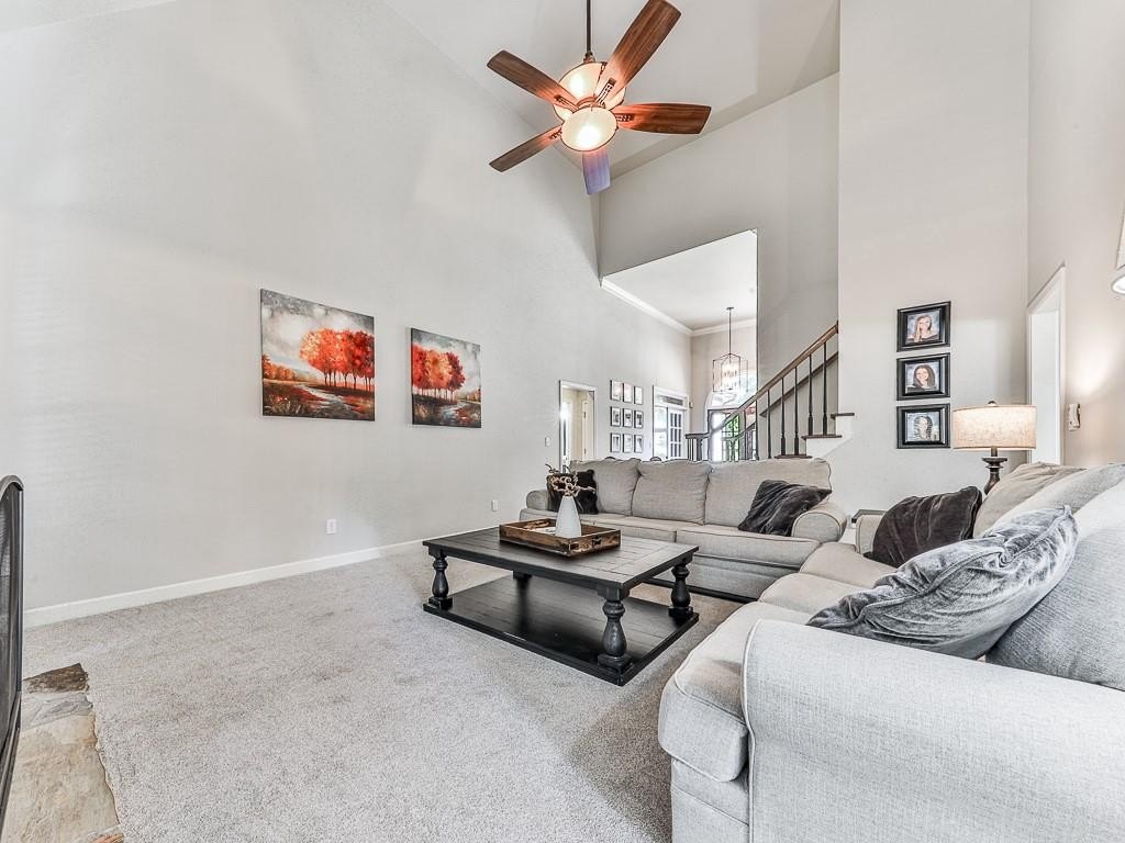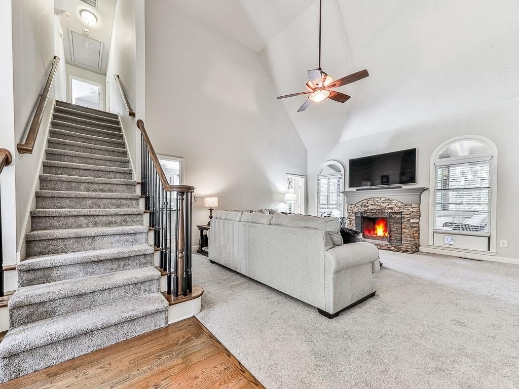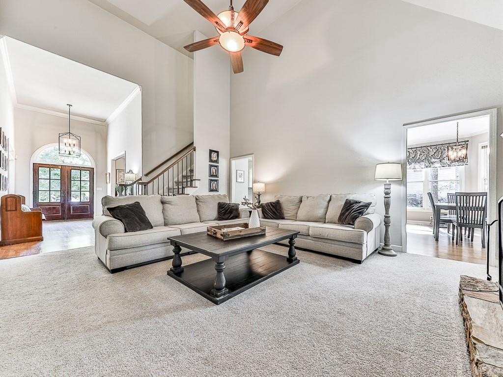Entertain in style with a formal living room and dining room, ideal for hosting gatherings. The two-story family room, featuring a striking stacked stone fireplace, creates a warm and inviting atmosphere. The gourmet kitchen boasts white cabinetry, granite countertops, a built-in counter-level bar, a pantry, and a cozy eat-in area, perfect for casual meals.