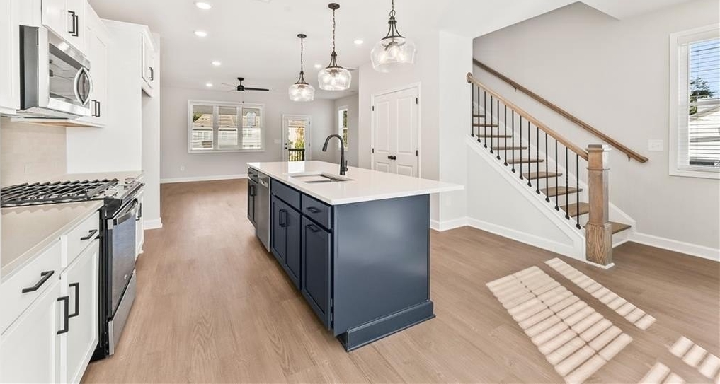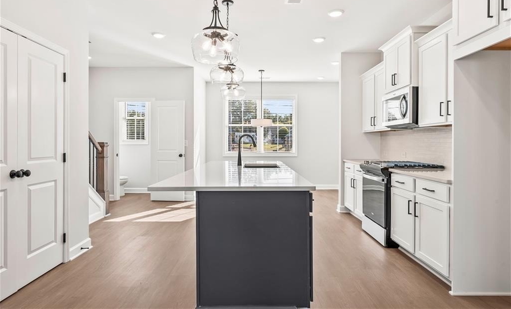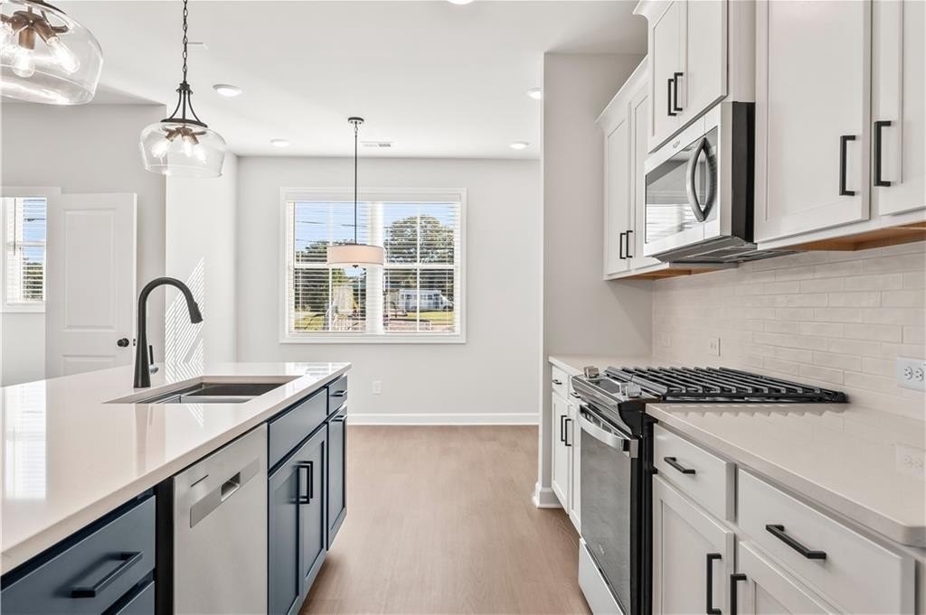 ($5141 value) and UP to $10,000 closing costs with one of our Traton approved lenders. This beautiful three-story END unit features a rear-entry two-car garage, a large ground-floor bedroom/flex room with full bath—ideal for a peaceful workspace or accommodating guests. Hardwood stairs lead to the main level, where you'll find a spacious open-concept layout. The kitchen offers shaker cabinets, quartz countertops, gas cooking, a large island that comfortably seats four, and a generous pantry. The expansive family room includes a sleek, modern electric fireplace that can provide heat or simply create a cozy ambiance. You'll also find a separate dining area and half bath on this level. Your family room opens to a 10'x18' covered deck, perfect for entertaining or simply relaxing. Hardwood stairs lead to the upper level where you'll discover the king-sized owner's suite with an amazing CUSTOM closet! The primary bathroom offers a large vanity with dual sinks, drawers and large shower with a bench. A secondary bedroom suite on the opposite end of the primary bedroom. The laundry closet is between these 2 bedrooms and offers privacy and convenience. East Park Village checks all the boxes! Its prime location is approximately 1.5 miles to I-75 and 1.2 miles downtown Kennesaw. East Park Village was voted the best neighborhood in Cobb County by Cobb Life Magazine 2024, and USA Today recognized Kennesaw as the best place to live in Georgia. Great amenities include a pool, cabana with fireplace and restrooms and a dog park. Some photos are REPRESENTATIVE of this home, same Kaufman floor plan. DECORATED photos are of the model. All applicants must prequalify with a Traton Homes preferred lender regardless of who you choose for your loan.