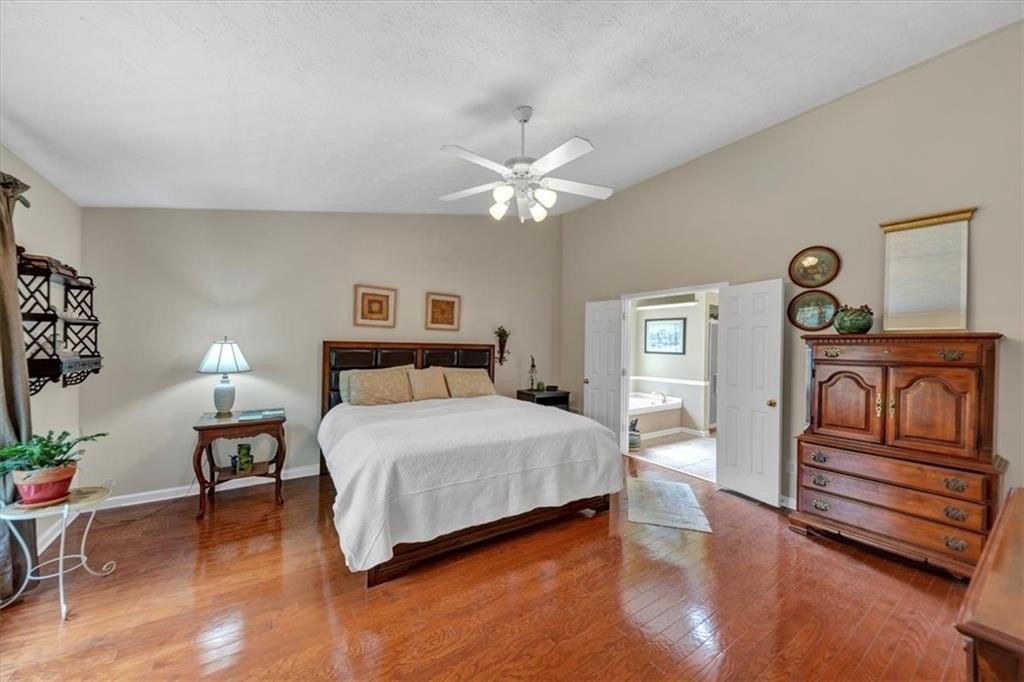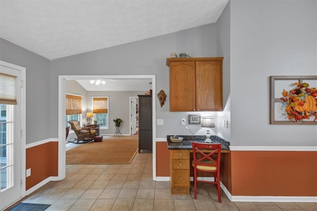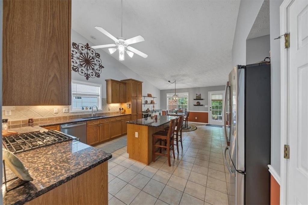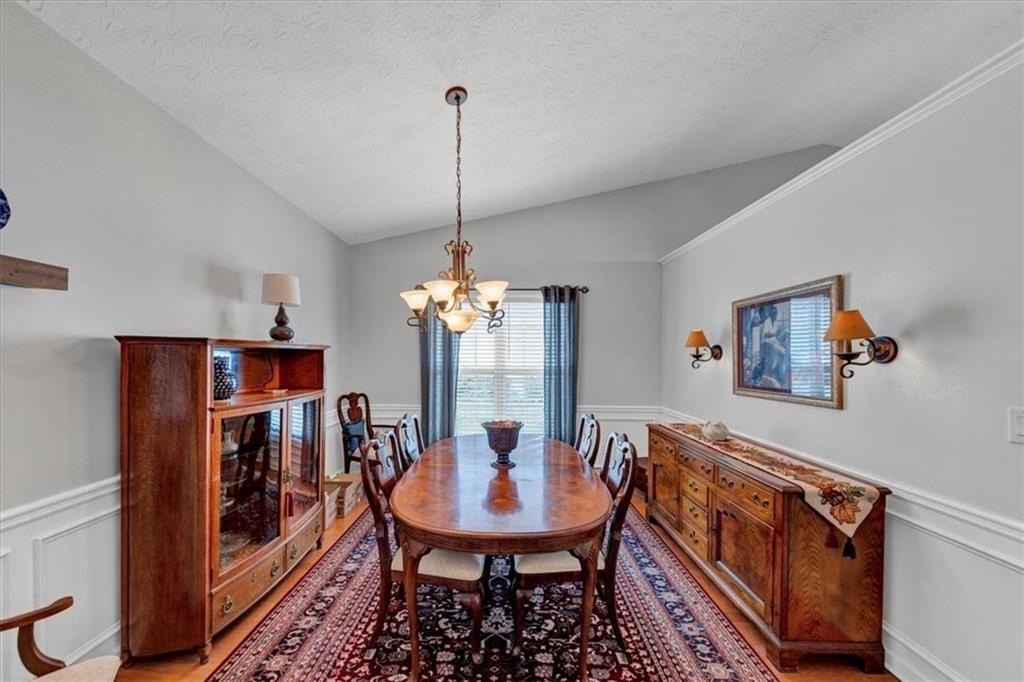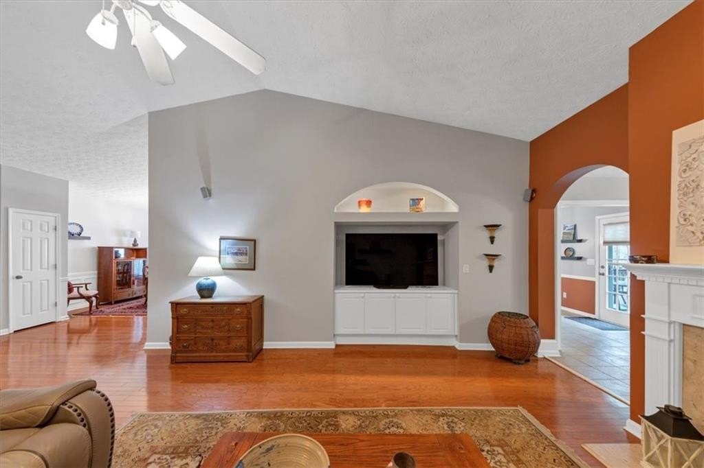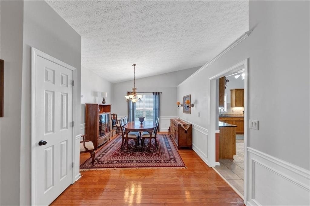Step inside to discover gleaming hardwood floors throughout the main living areas. The home features a spacious dining room, a vaulted family room with a cozy fireplace, and a bright sitting room filled with natural light. The large kitchen includes an island, pantry, built-in desk, breakfast area, and abundant cabinet space—ideal for everyday living and entertaining.