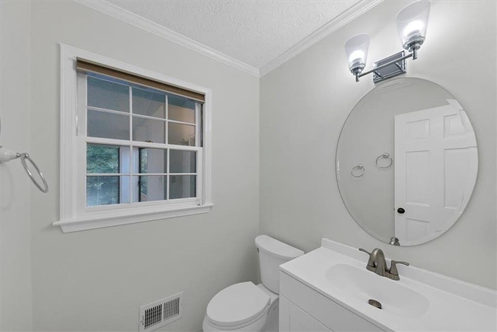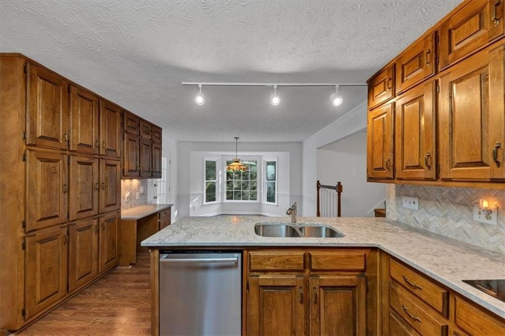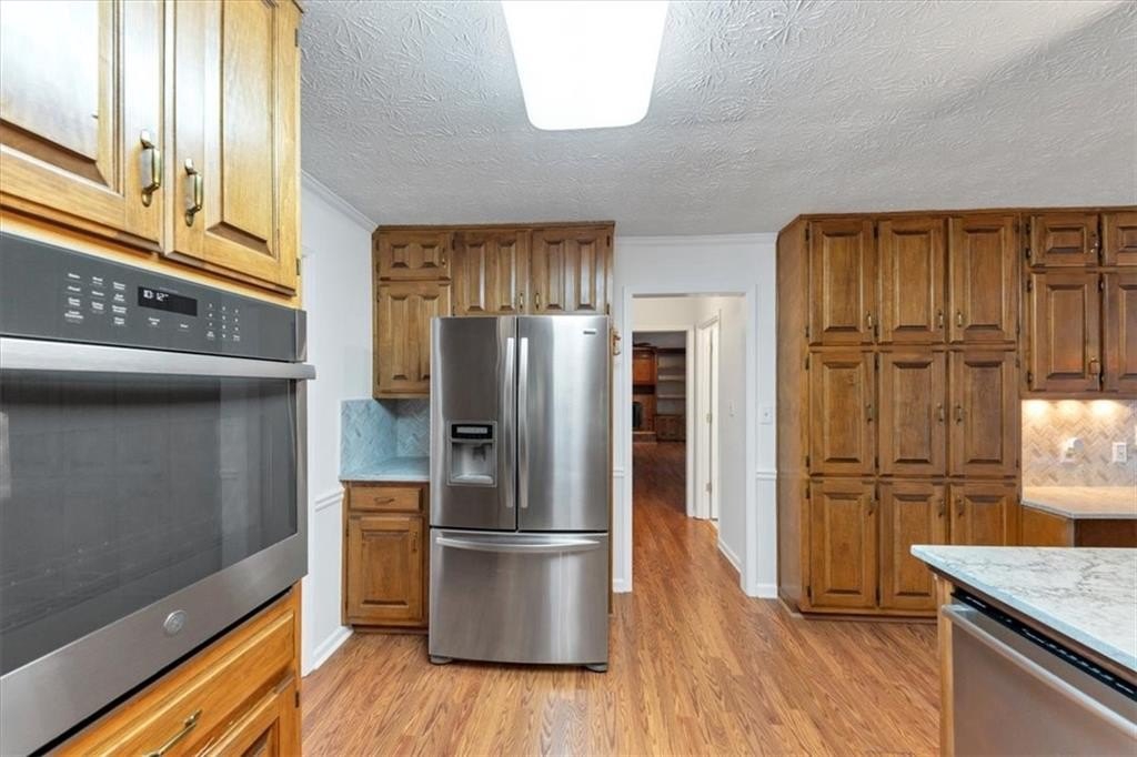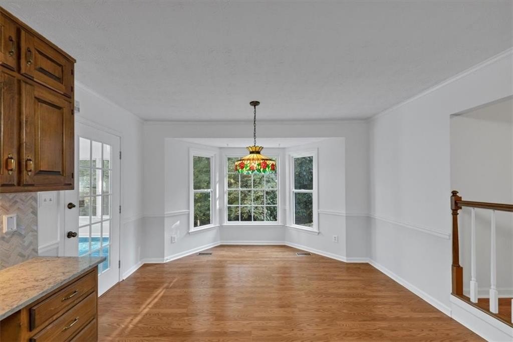 The bright kitchen with all-new appliances features granite countertops, a tiled backsplash, abundant cabinet space, and a casual eat-in area. The layout flows beautifully, with front and back staircases connecting each level with ease.