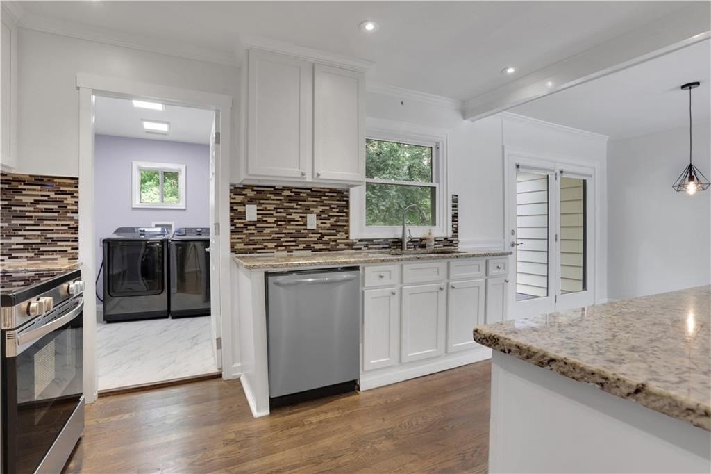 The timeless white kitchen boasts generous granite countertops, stainless steel appliances with a walk-in pantry and laundry room - full sized washer/dryer included. The adjacent dining area flows effortlessly onto a private back deck overlooking a serene, fenced backyard complete with a fire pit — perfect for everyday relaxation or weekend entertaining.