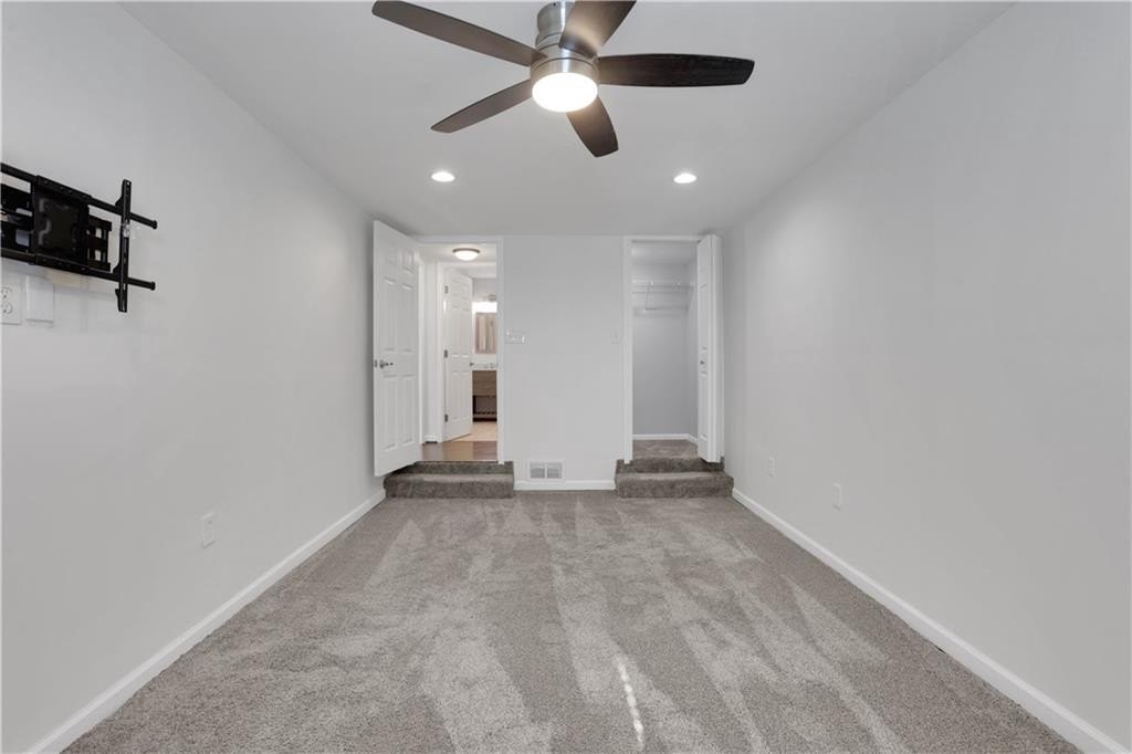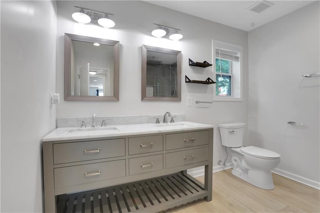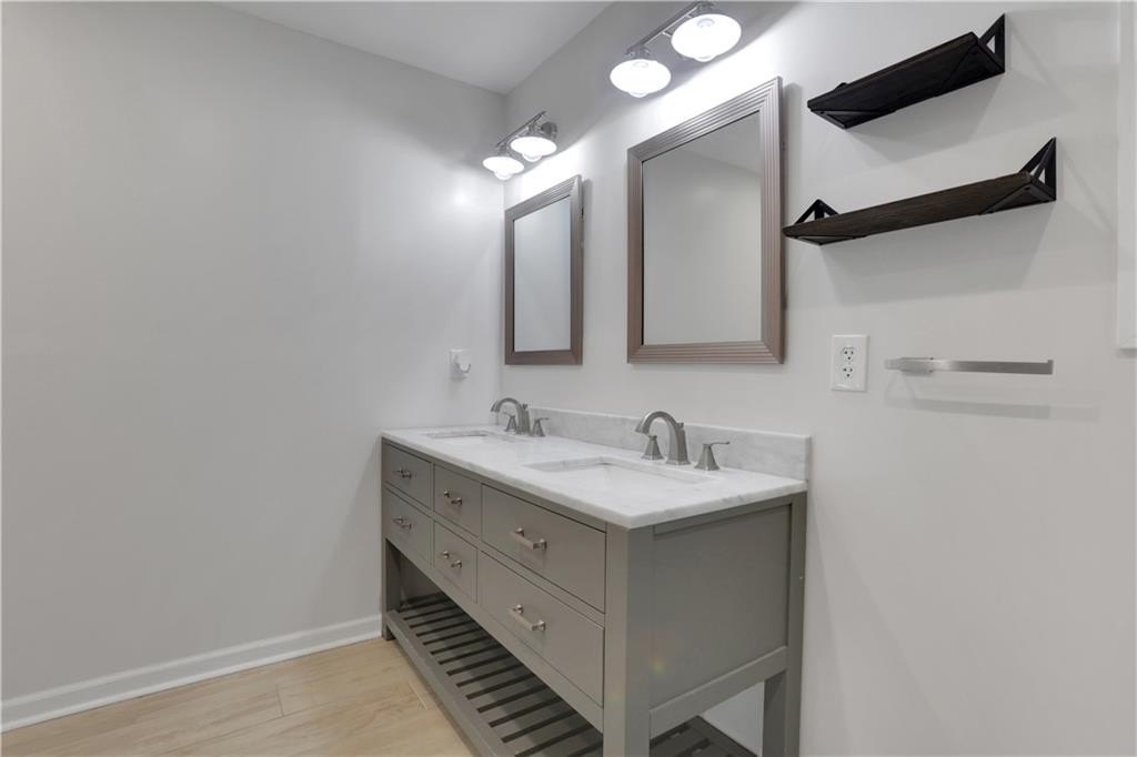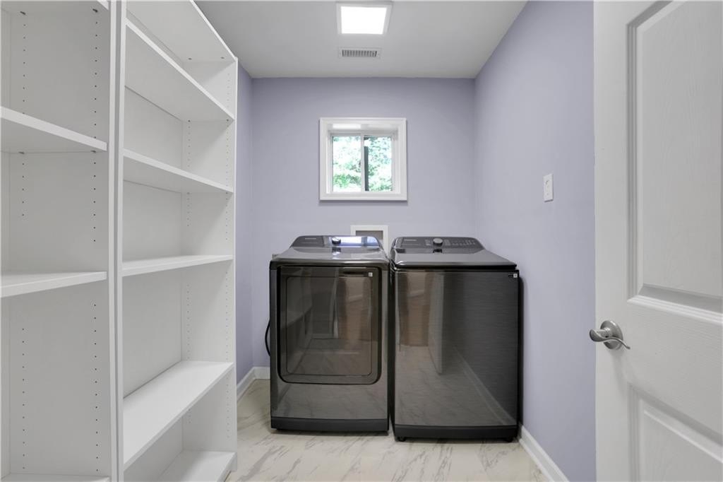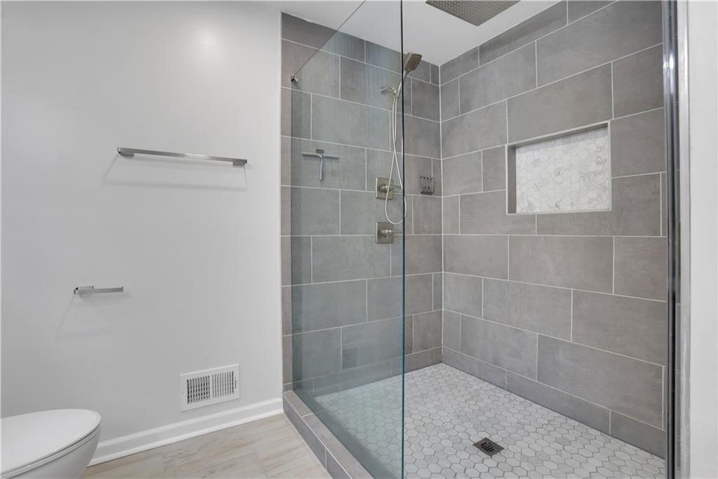 Retreat to the luxurious primary suite, where the spa-inspired bathroom features a marble double vanity, an oversized walk-in rainfall shower, and elegant porcelain tile throughout. The secondary bath is equally stylish, with a new vanity, modern tile surround, and updated tile flooring.