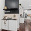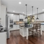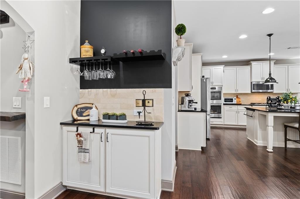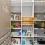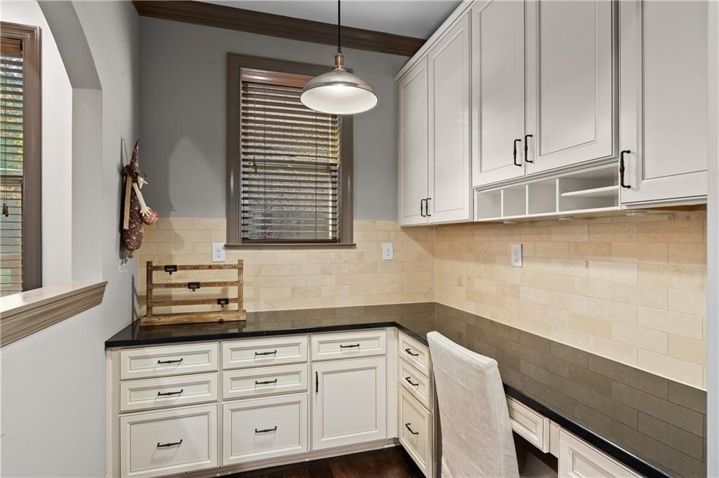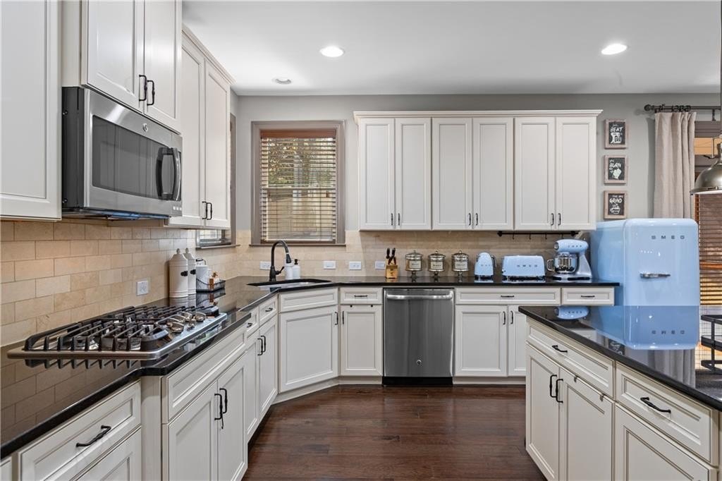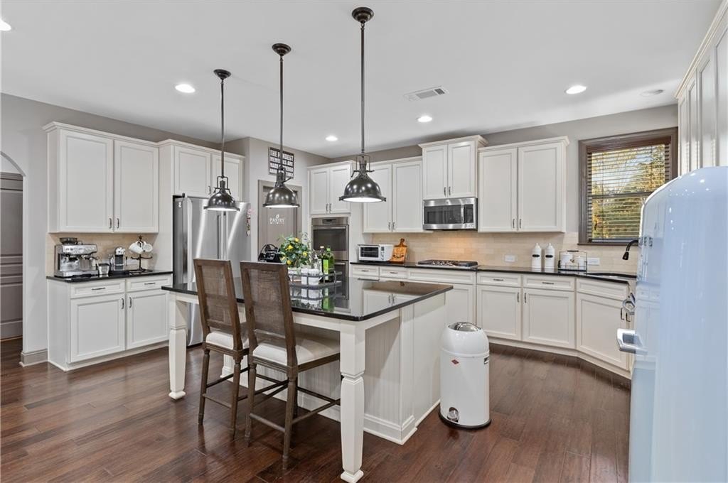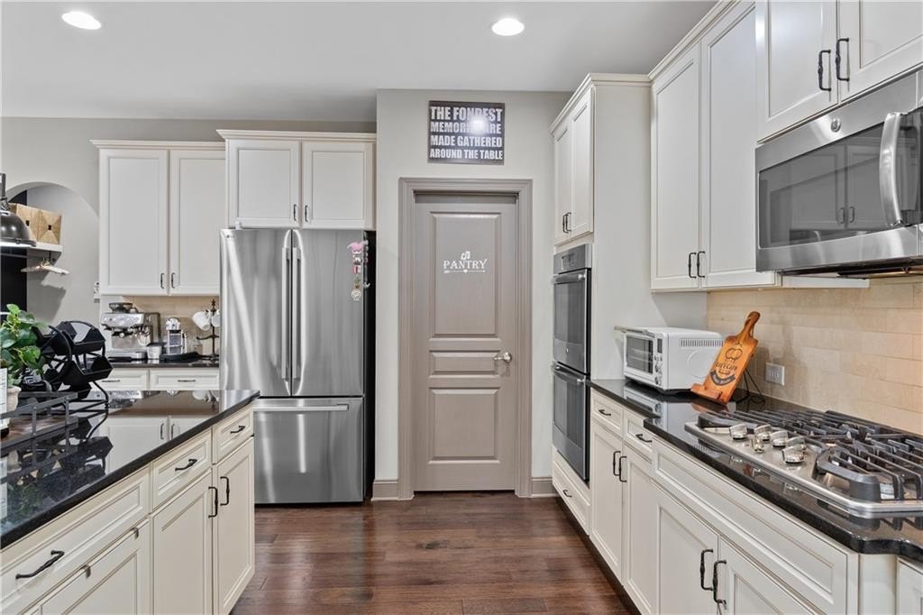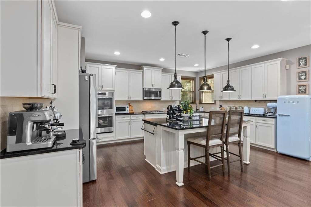 The kitchen is stylish and functional, offering ample counter space, a cheerful breakfast nook, and a built-in pantry with custom shelving for effortless organization.