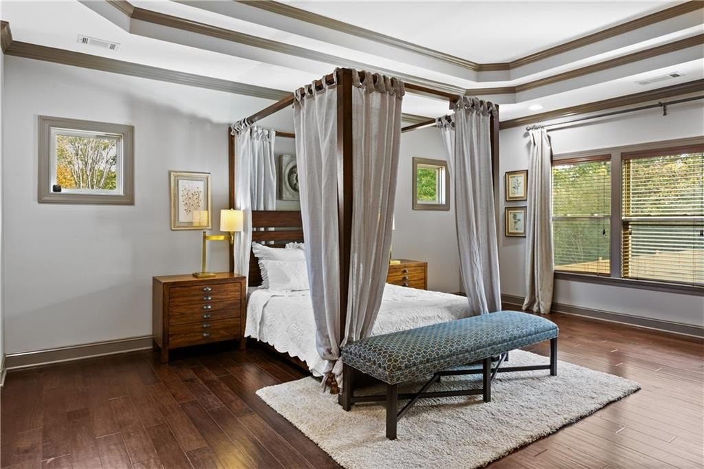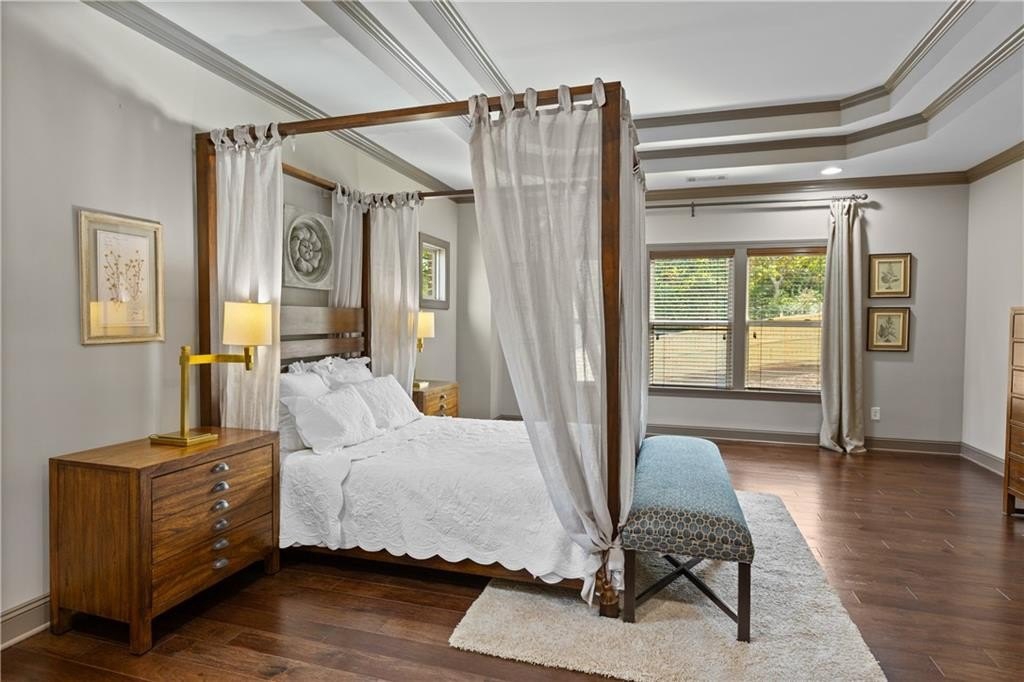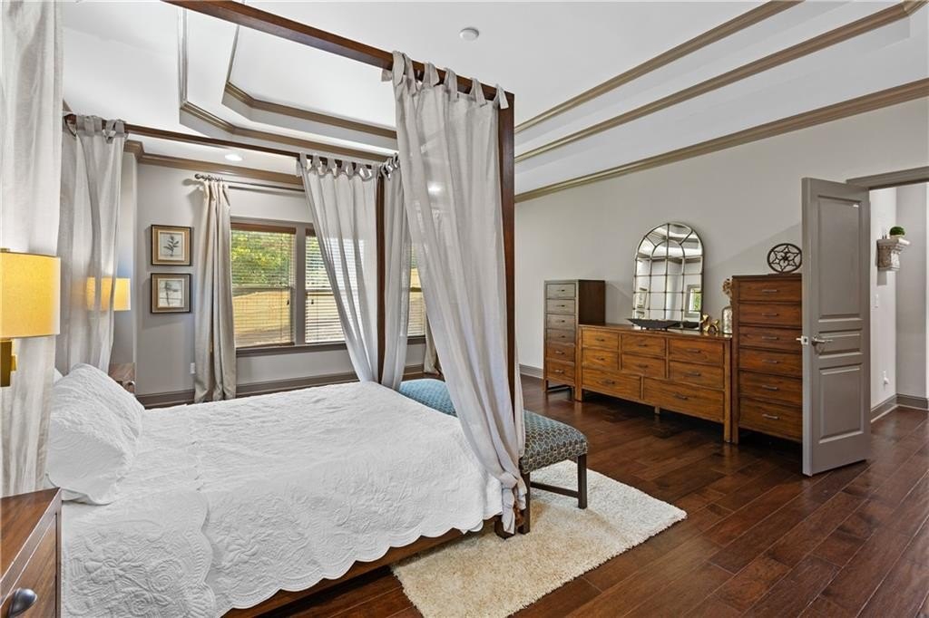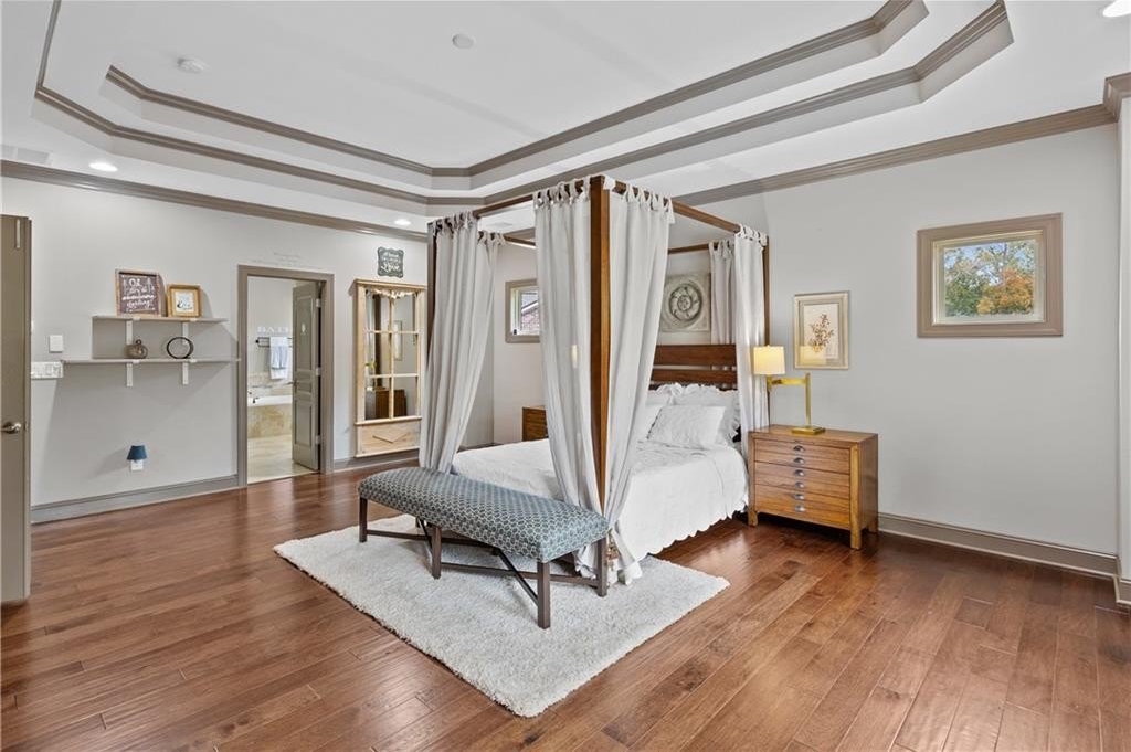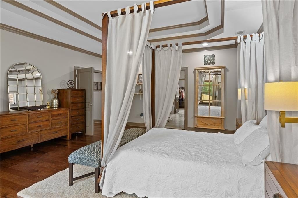 Through the double French doors, the master suite welcomes you with elegant triple tray ceilings and a peaceful backyard view that invites rest and relaxation.