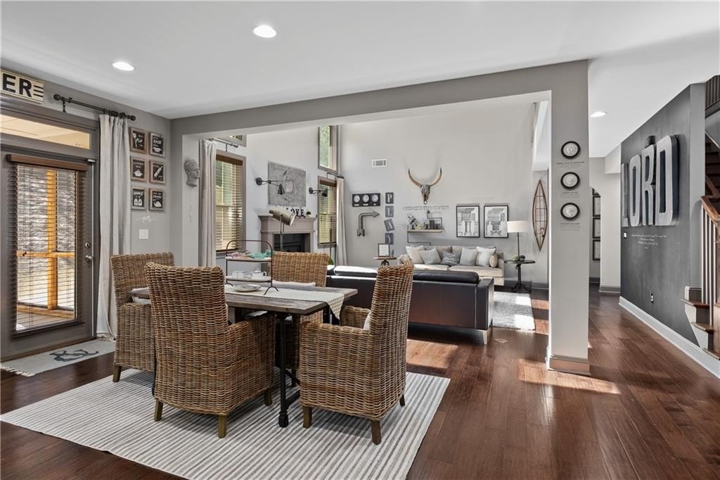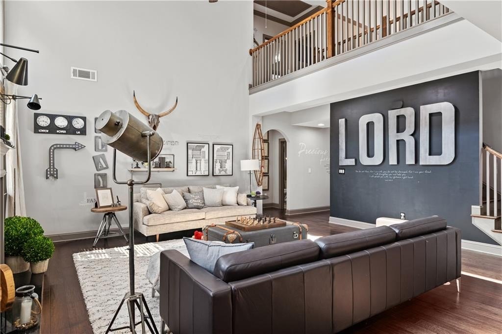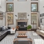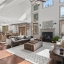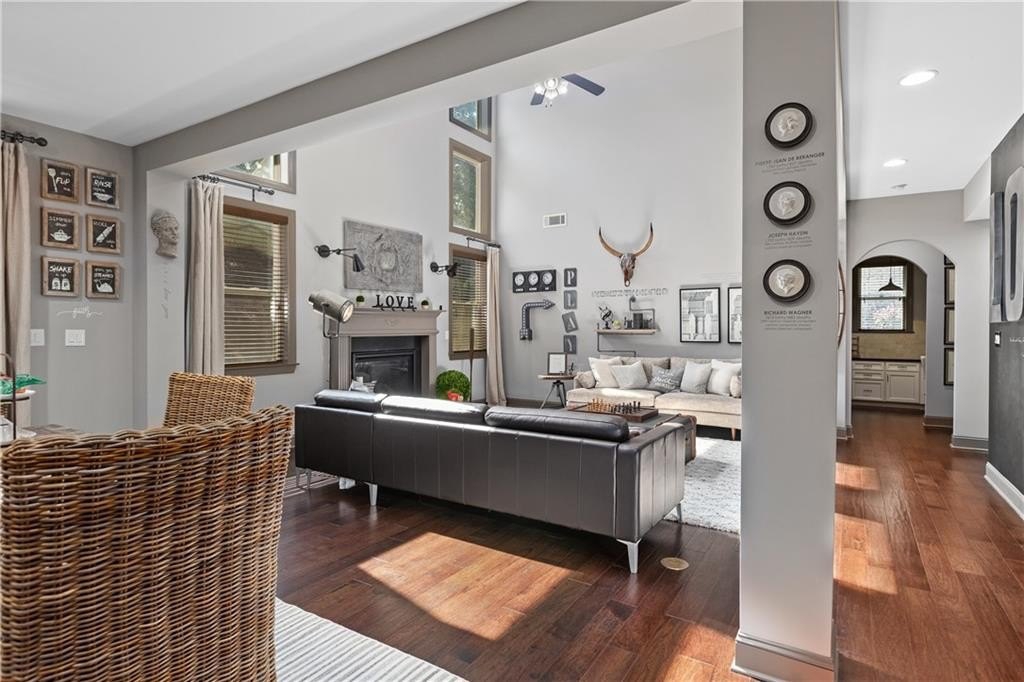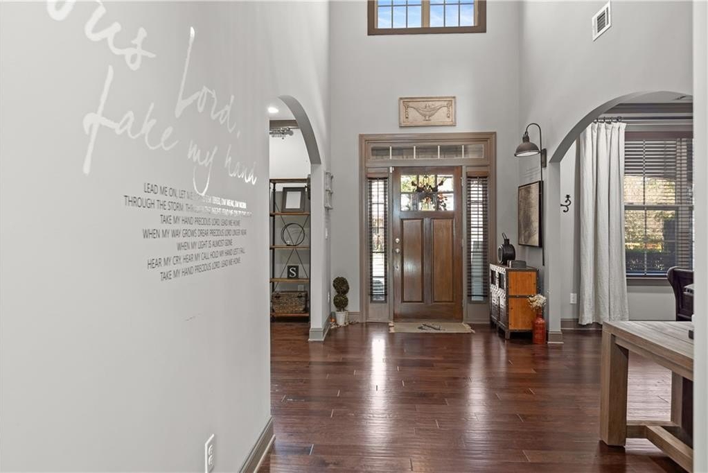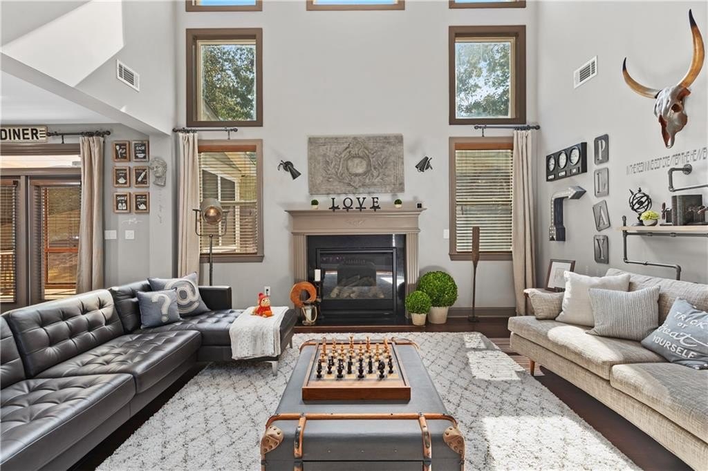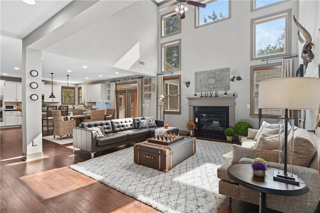 Beyond the foyer, the family room features soaring two-story ceilings and expansive windows that fill the space with abundant natural light, creating a warm and welcoming atmosphere.