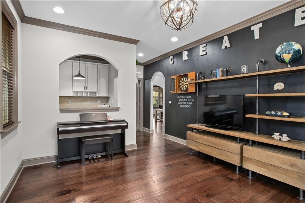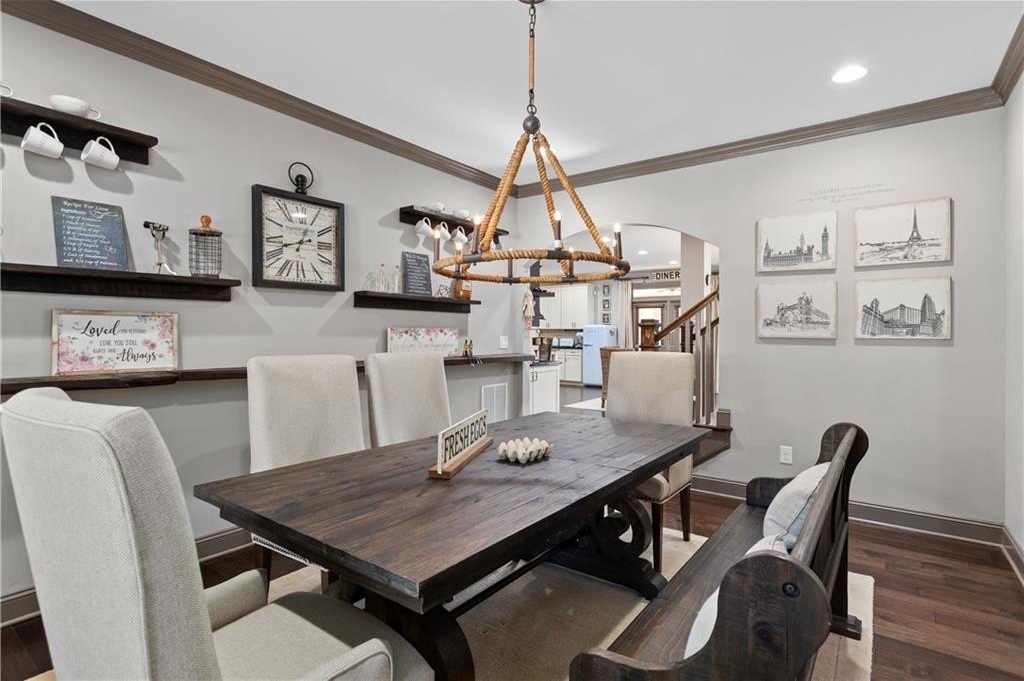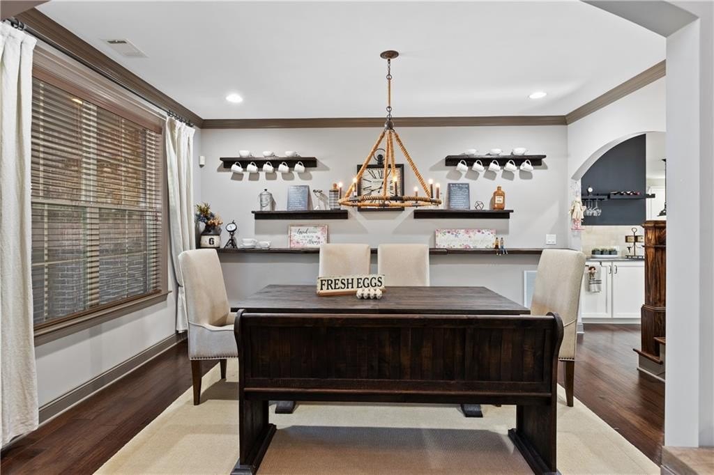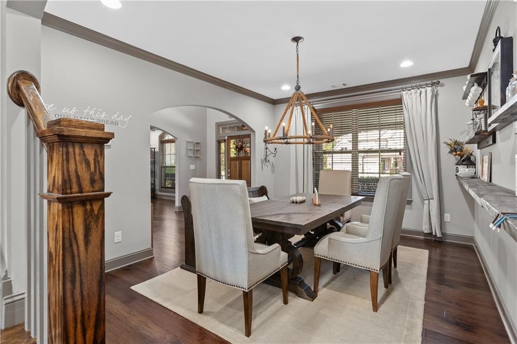 To the left, the formal dining room is both cozy and spacious, ideal for hosting gatherings with friends and family.