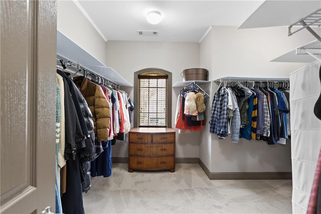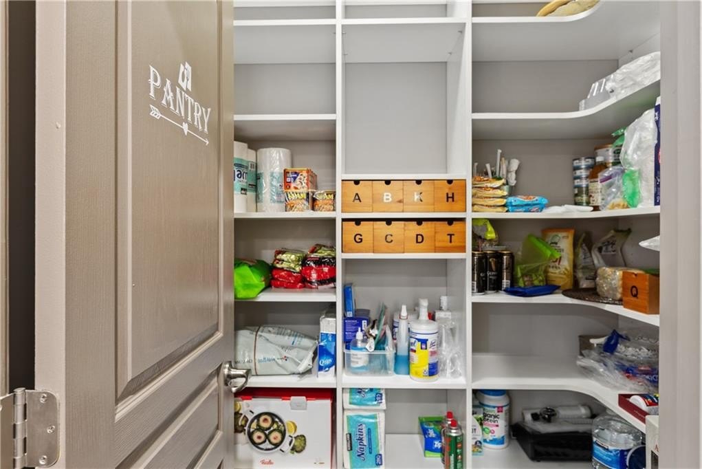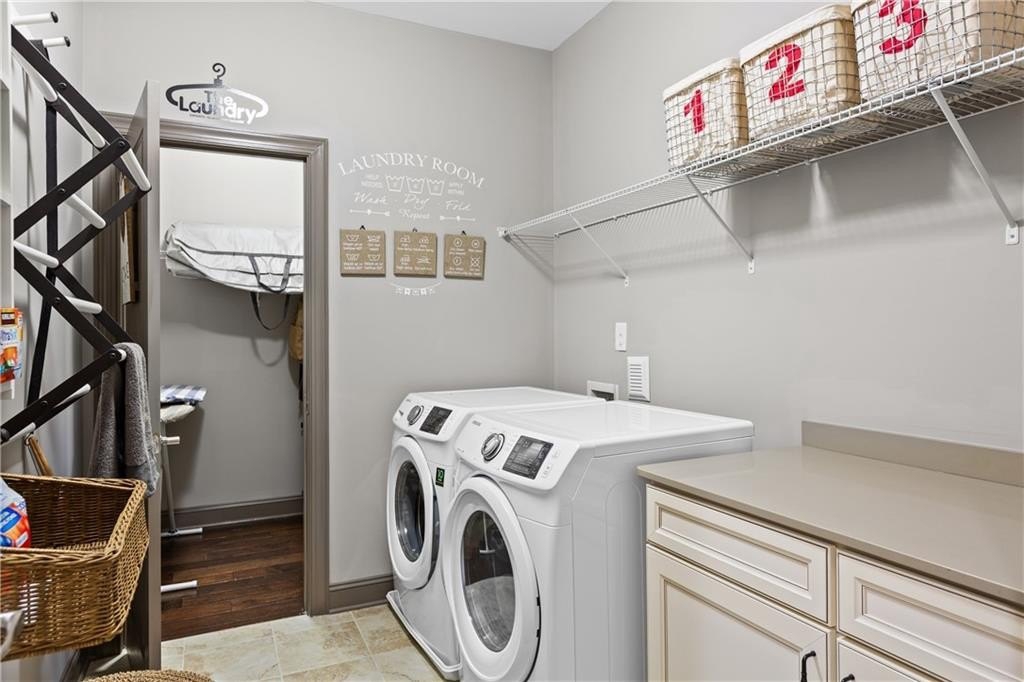 The laundry room is generously sized, featuring built-in cabinetry and an additional storage area for maximum convenience.
