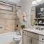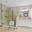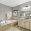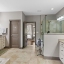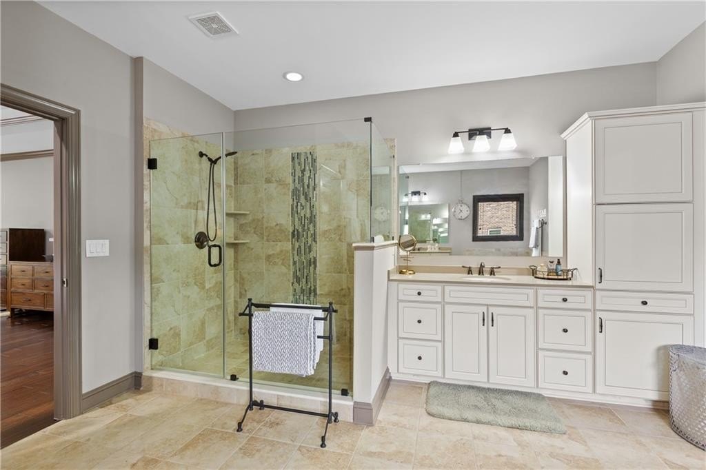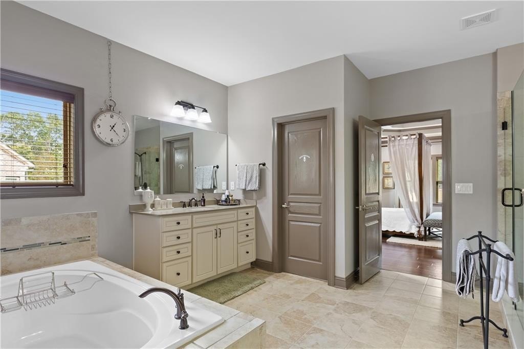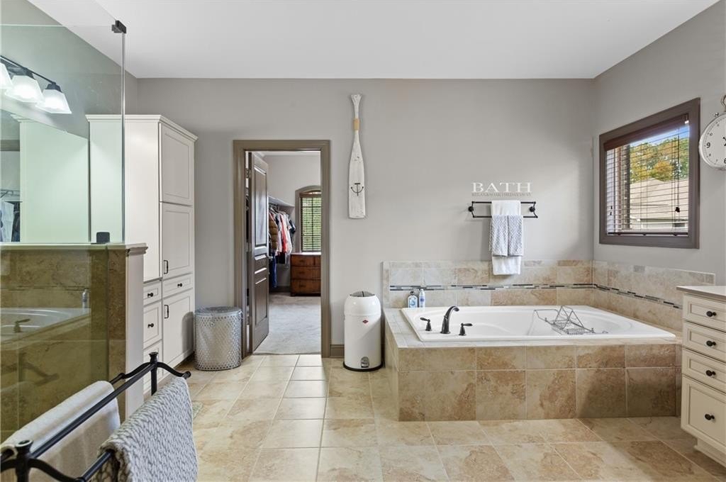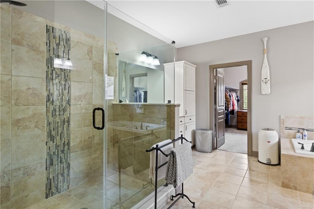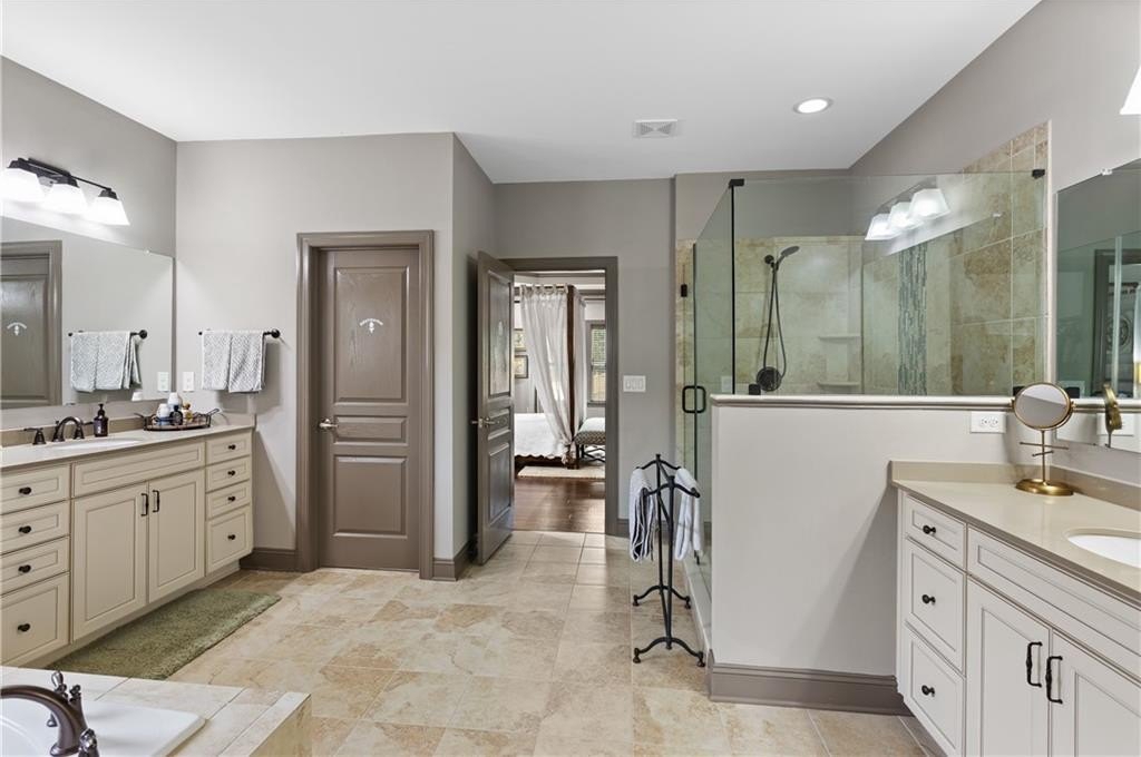 The luxurious master bath showcases tile floors, a large seamless glass shower, a soaking tub, and his-and-hers vanities, offering both style and comfort.