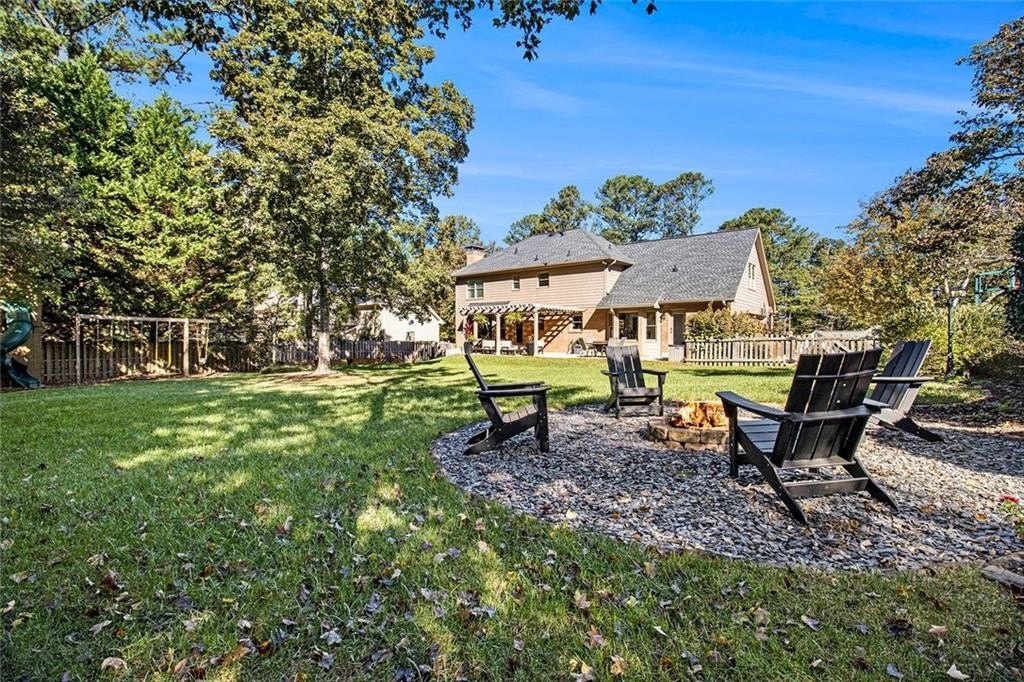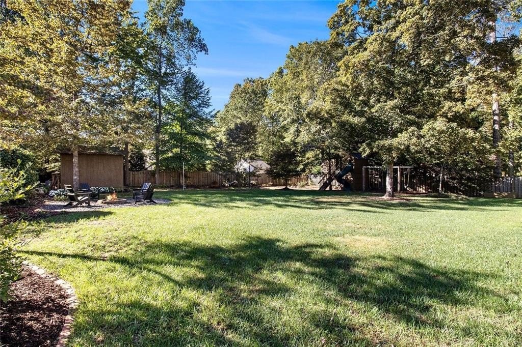 Set on a flat half-acre lot, the backyard is ideal for kids, pets & gatherings. Enjoy a fire pit area, custom 2 story play fort w swings and a sandbox, and a spacious patio surrounded by lush trees. A shed provides storage, and an irrigation system keeps the lawn green.