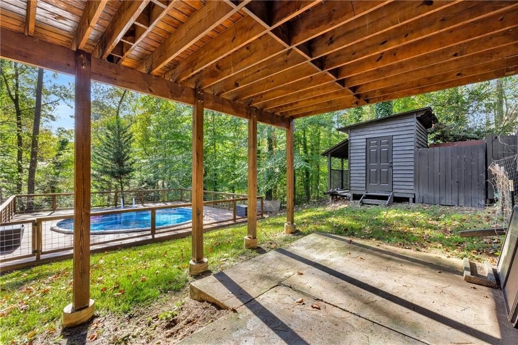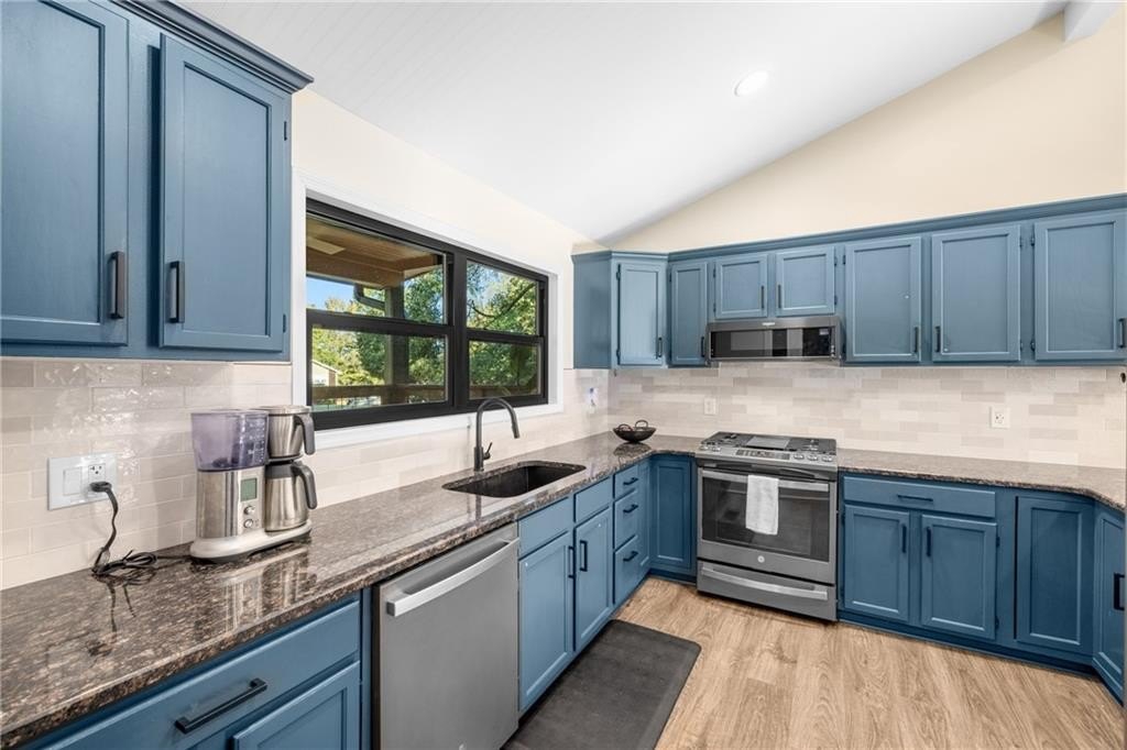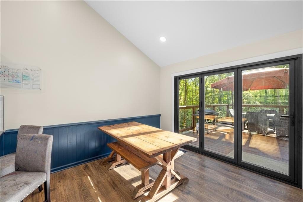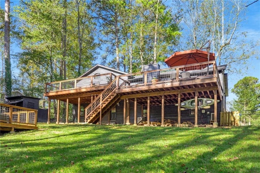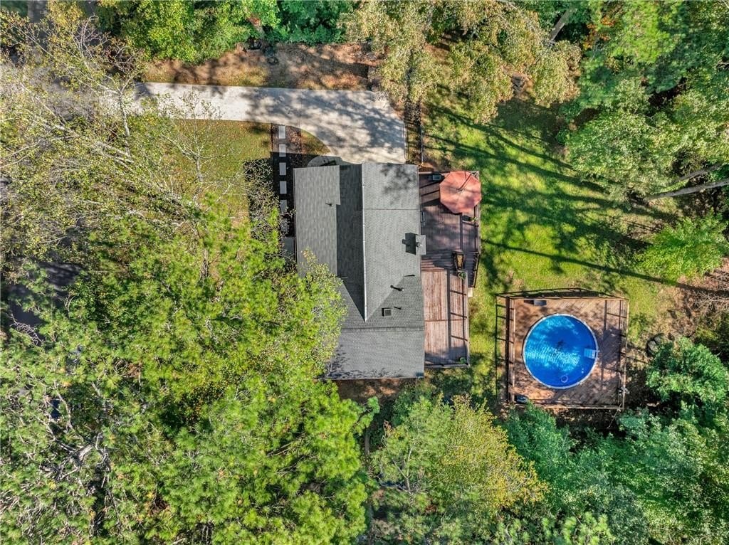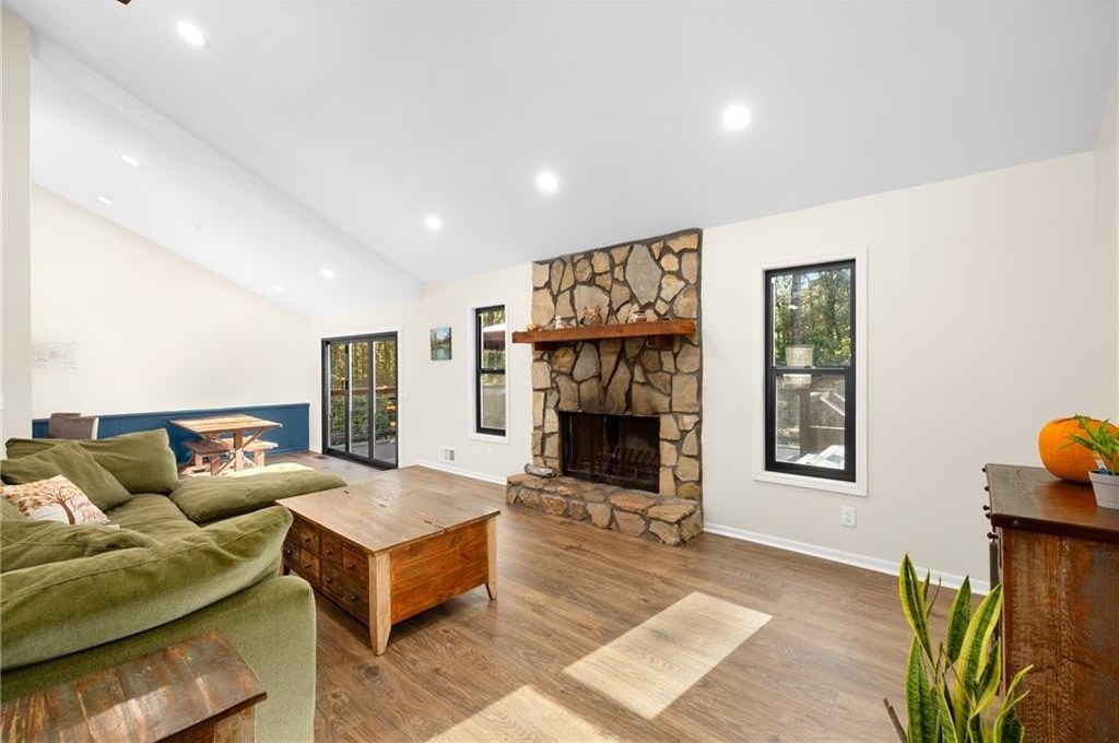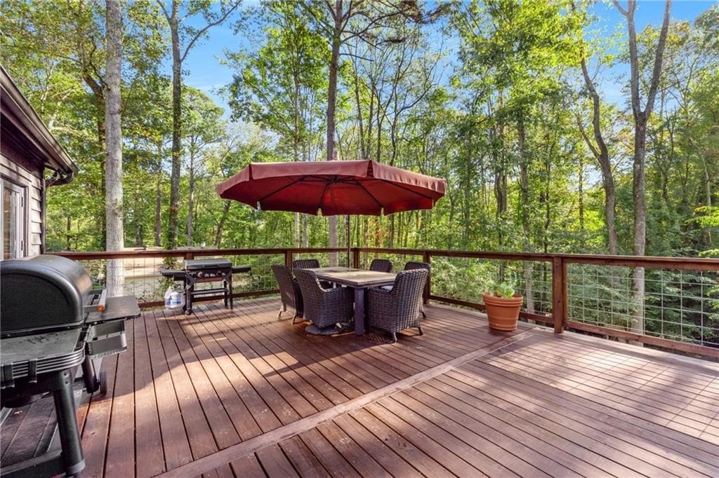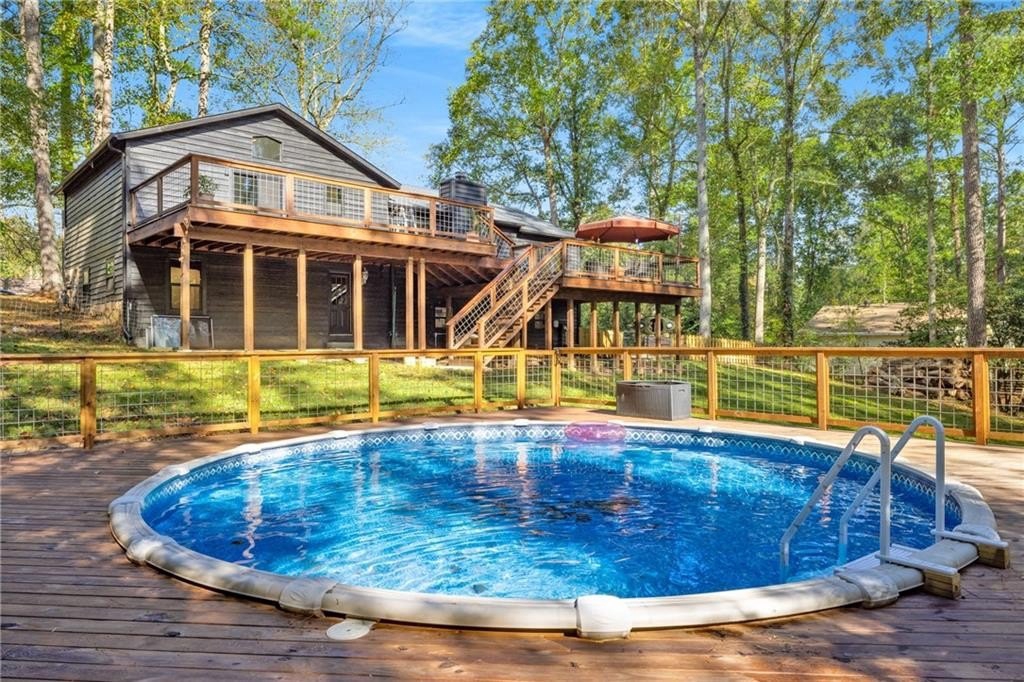 A private mountain-style retreat right in the heart of Woodstock. Tucked away on a quiet street, feels like an escape to the mountains, yet it sits right in Woodstock close to shops, restaurants, and top-rated schools. This is the kind of home that makes you breathe easier the moment you arrive. Surrounded by trees and peaceful views, it feels like a weekend getaway that never ends. Inside is a completely renovated home that blends rustic charm with modern luxury. Every inch has been reimagined, starting with a brand-new roof, new paint, and new windows. High vaulted ceilings fill the home with natural light, and new flooring ties everything together with warmth and style. The kitchen is the centerpiece of the home. Stainless steel appliances, sleek recessed lighting, and an accordion-style sliding glass door create a space that feels open and inviting. That door leads to a massive custom-built deck that stretches across the entire back of the home. Nearly seventy thousand dollars were invested into this outdoor space, which connects directly to the primary suite and offers the perfect setting for quiet mornings or evening gatherings under the stars. The primary suite feels like your own lodge-inspired retreat. It has vaulted ceilings and a spa-style stepless shower with luxury tile, double shower heads, and a new vanity. The two secondary bedrooms include a fun connecting door between their closets, perfect for kids who love secret hideouts. The hallway bathroom is completely renovated with fluted wood-look tile, stylish fixtures, and a skylight that fills the space with natural light. The finished basement is designed for relaxation and entertainment. It features a large open area perfect for a movie room, a fourth bedroom, and a storage room that could easily be converted into a future bathroom. The two-car garage has been insulated, heated, and air-conditioned for year-round comfort. It includes brand-new garage doors, a built-in doggie door that opens to the fenced backyard, making life easy for your four-legged friend. Outdoors, the updates continue with a rebuilt front porch with a cozy swing that invites you to slow down, relax, and enjoy the peaceful surroundings, an above-ground pool surrounded by decking, and a storage shed. The property sits on more than half an acre with a beautifully maintained lawn and no HOA, giving you the freedom to enjoy it your way. Every detail in this home was thoughtfully designed, from the lighting to the finishes. It feels like a peaceful mountain getaway, yet it is fully modern, move-in ready, and located right here in Woodstock.