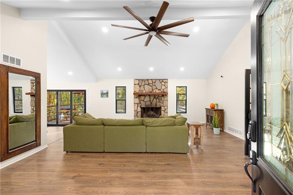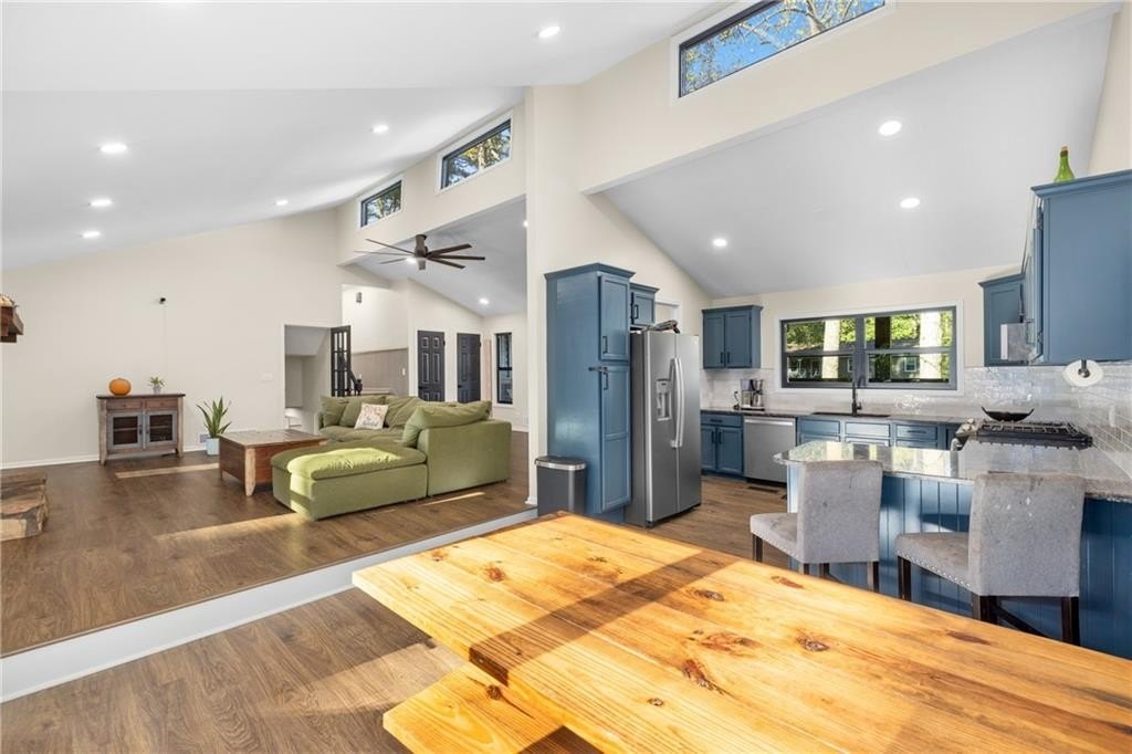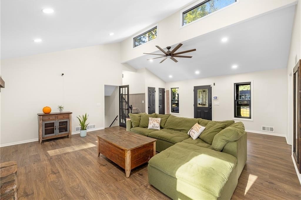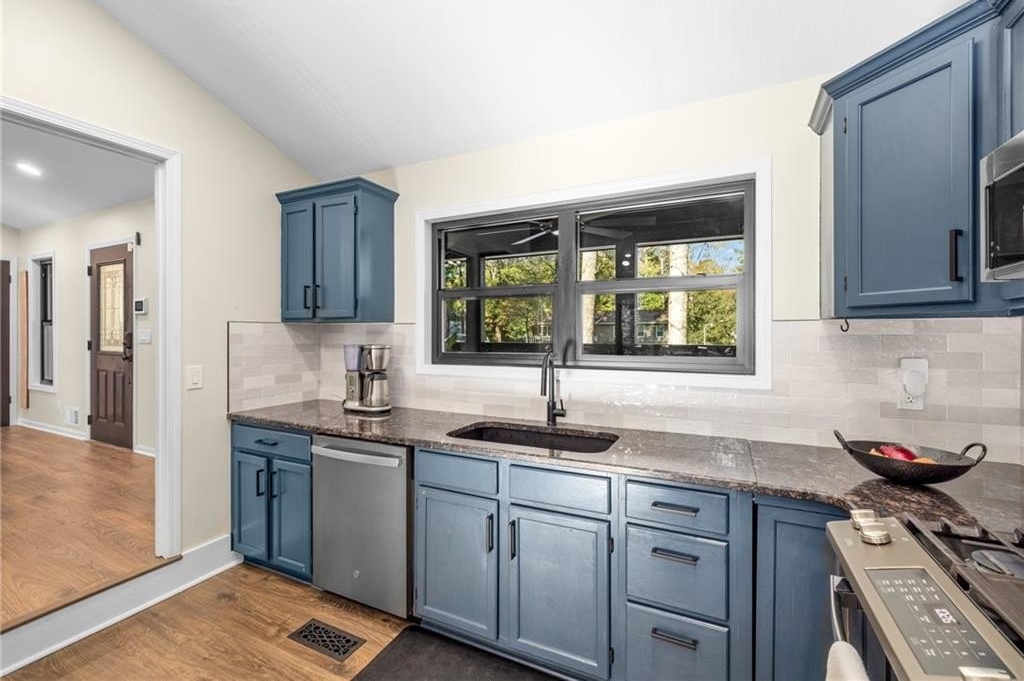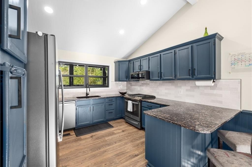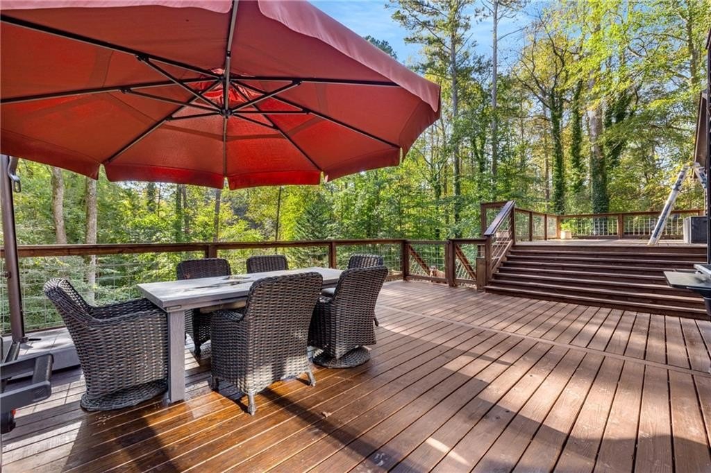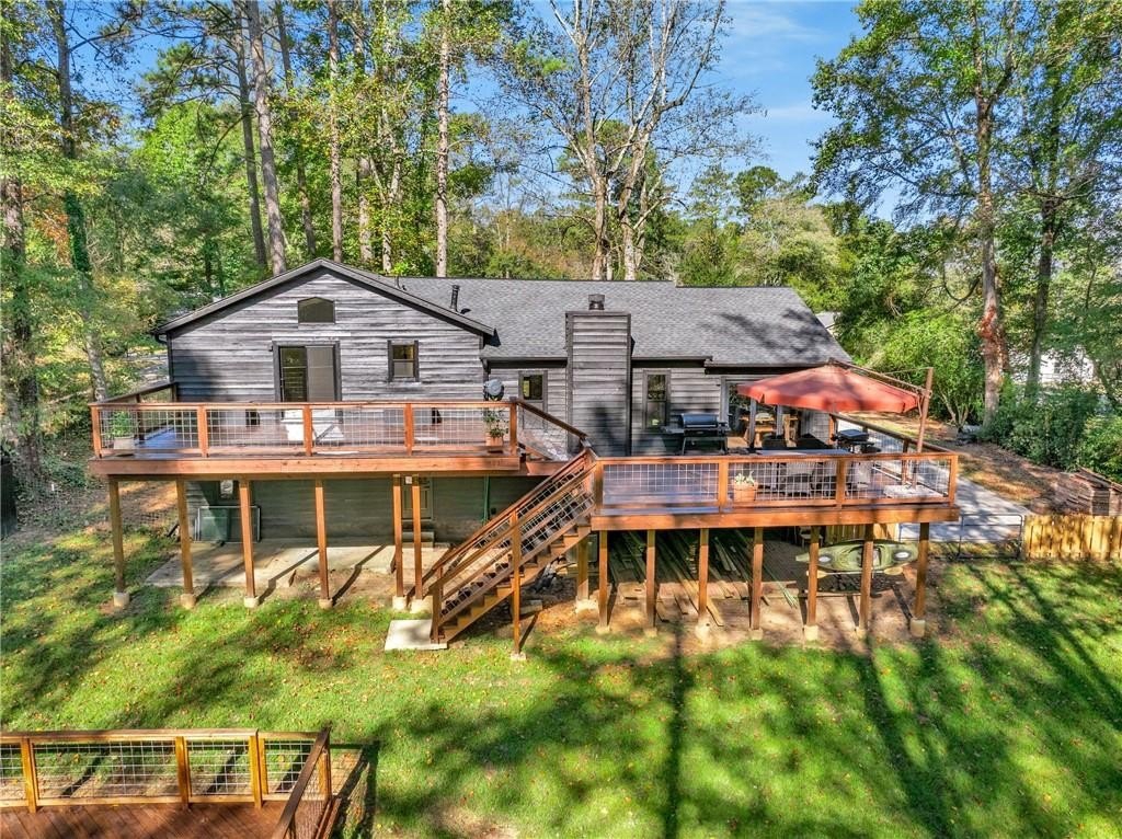 A private mountain-style retreat right in the heart of Woodstock. Tucked away on a quiet street, feels like an escape to the mountains, yet it sits right in Woodstock close to shops, restaurants, and top-rated schools. This is the kind of home that makes you breathe easier the moment you arrive. Surrounded by trees and peaceful views, it feels like a weekend getaway that never ends. Inside is a completely renovated home that blends rustic charm with modern luxury. Every inch has been reimagined, starting with a brand-new roof, new paint, and new windows. High vaulted ceilings fill the home with natural light, and new flooring ties everything together with warmth and style. The kitchen is the centerpiece of the home. Stainless steel appliances, sleek recessed lighting, and an accordion-style sliding glass door create a space that feels open and inviting. That door leads to a massive custom-built deck that stretches across the entire back of the home. Nearly seventy thousand dollars were invested into this outdoor space, which connects directly to the primary suite and offers the perfect setting for quiet mornings or evening gatherings under the stars. The primary suite feels like your own lodge-inspired retreat. It has vaulted ceilings and a spa-style stepless shower with luxury tile, double shower heads, and a new vanity. The two secondary bedrooms include a fun connecting door between their closets, perfect for kids who love secret hideouts. The hallway bathroom is completely renovated with fluted wood-look tile, stylish fixtures, and a skylight that fills the space with natural light. The finished basement is designed for relaxation and entertainment. It features a large open area perfect for a movie room, a fourth bedroom, and a storage room that could easily be converted into a future bathroom. The two-car garage has been insulated, heated, and air-conditioned for year-round comfort. It includes brand-new garage doors, a built-in doggie door that opens to the fenced backyard, making life easy for your four-legged friend. Outdoors, the updates continue with a rebuilt front porch with a cozy swing that invites you to slow down, relax, and enjoy the peaceful surroundings, an above-ground pool surrounded by decking, and a storage shed. The property sits on more than half an acre with a beautifully maintained lawn and no HOA, giving you the freedom to enjoy it your way. Every detail in this home was thoughtfully designed, from the lighting to the finishes. It feels like a peaceful mountain getaway, yet it is fully modern, move-in ready, and located right here in Woodstock.