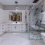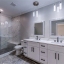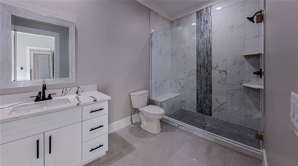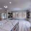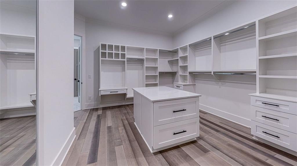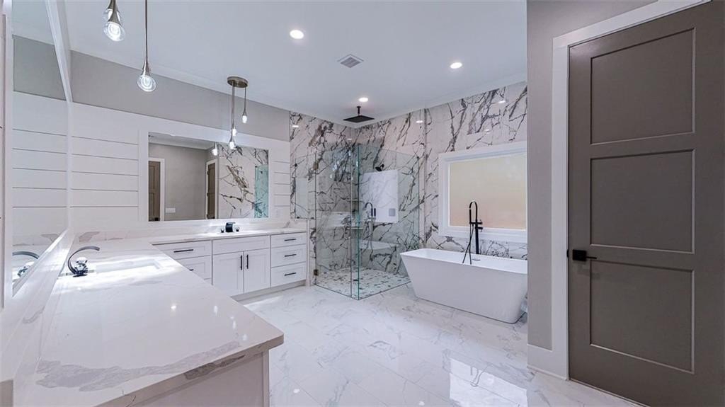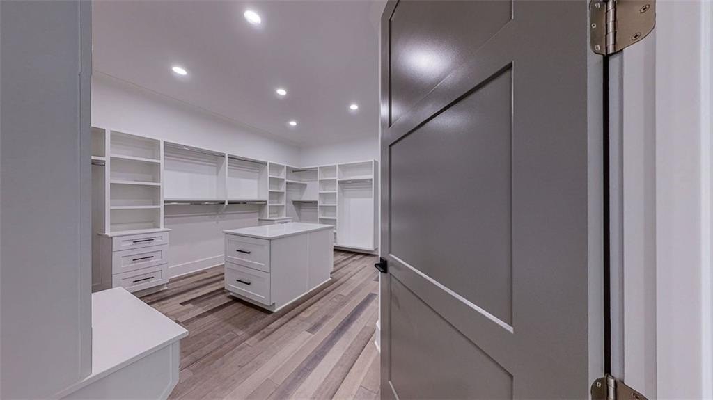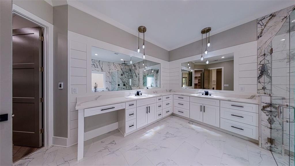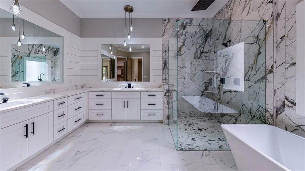 The owner’s retreat on the main level is conceived as a sanctuary of indulgence. With soaring ceilings, an expansive boutique-style modern closet system, and a spa-inspired en-suite bath wrapped in full-height designer tile, it rivals the world’s finest hotels. A frameless glass shower, freestanding soaking tub, and dual vanities exude elegance, while adjacent formal and private spaces—such as the distinguished dining room and an executive study with custom built-in cabinetry—complete the main level with effortless poise.