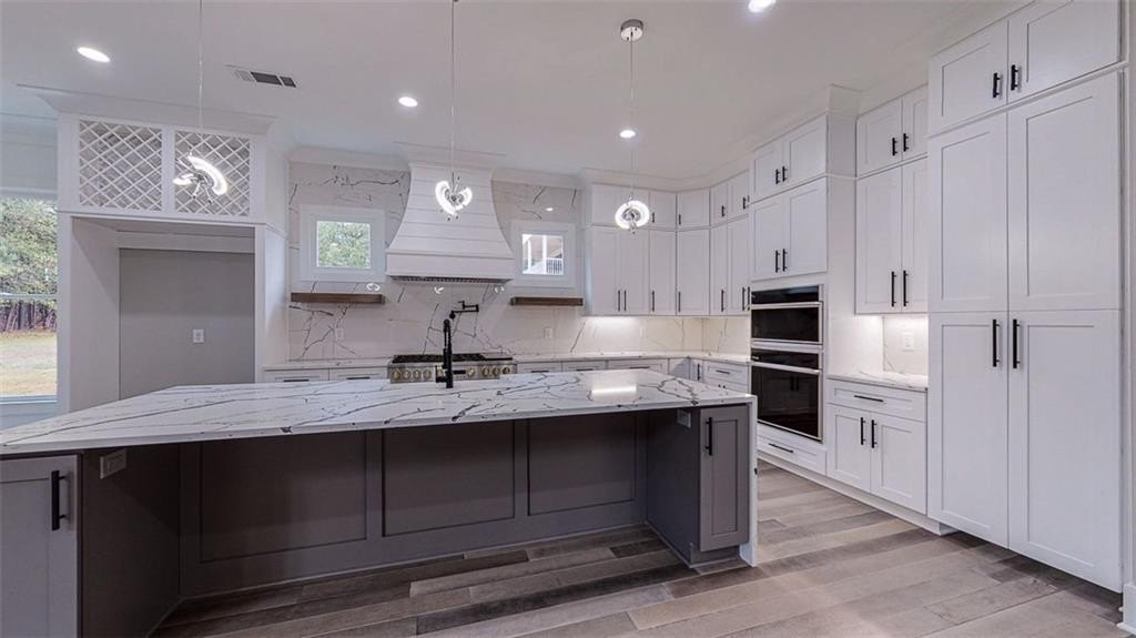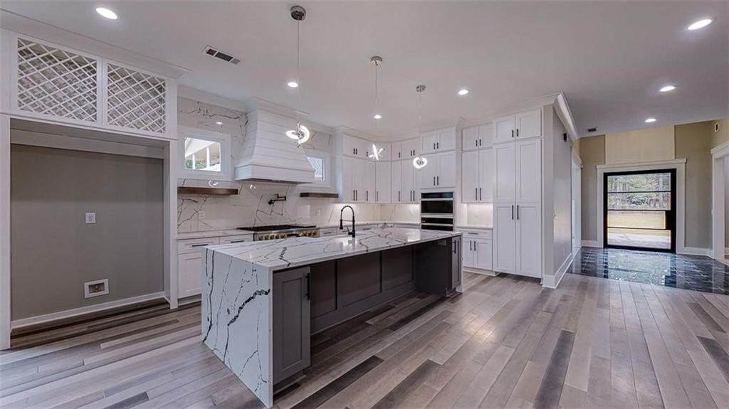 At the epicenter of the home lies the custom chef’s kitchen, a study in both beauty and function. Exquisite bespoke cabinetry, quartz countertops, and a massive sculpted island form its foundation, while professional-grade appliances—including a 48-inch gas range and dual ovens affirm its culinary pedigree. An oversized walk-in pantry and a second full prep kitchen further elevate its sophistication, offering seamless accommodation for grand entertaining.