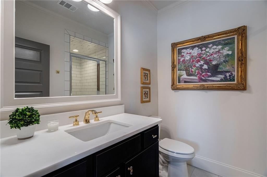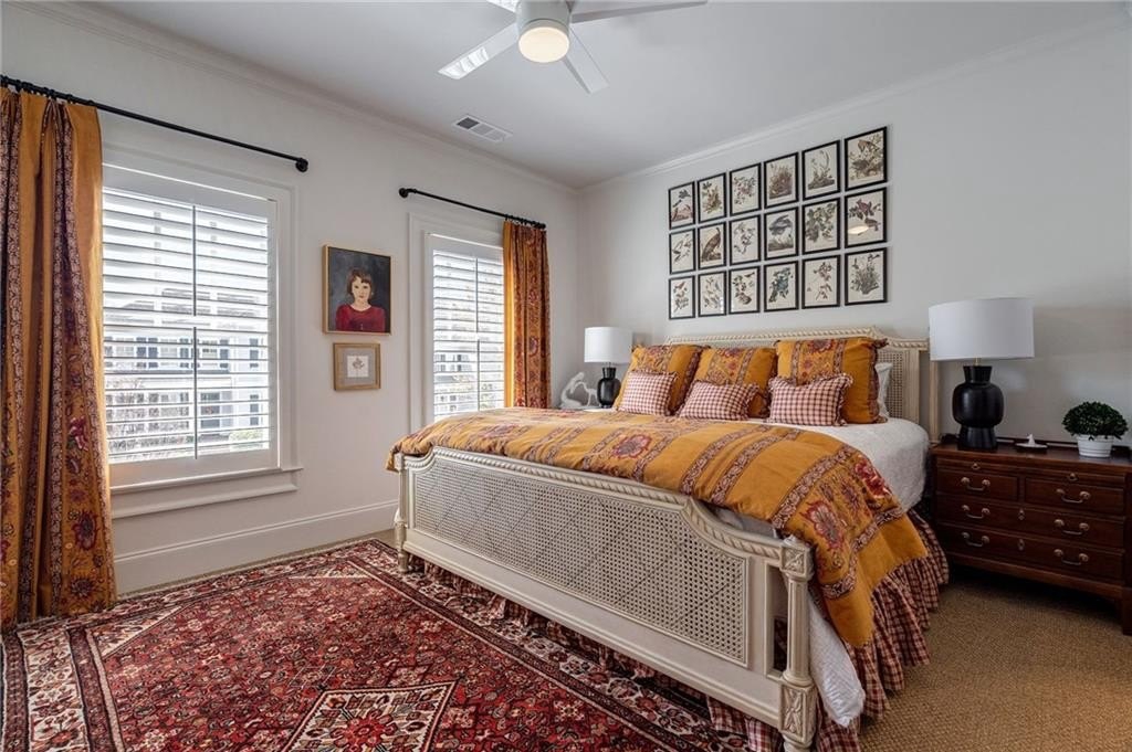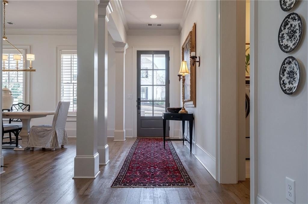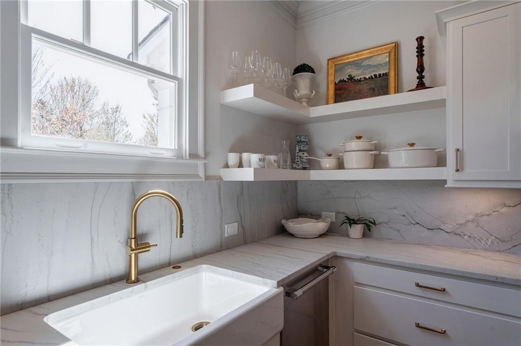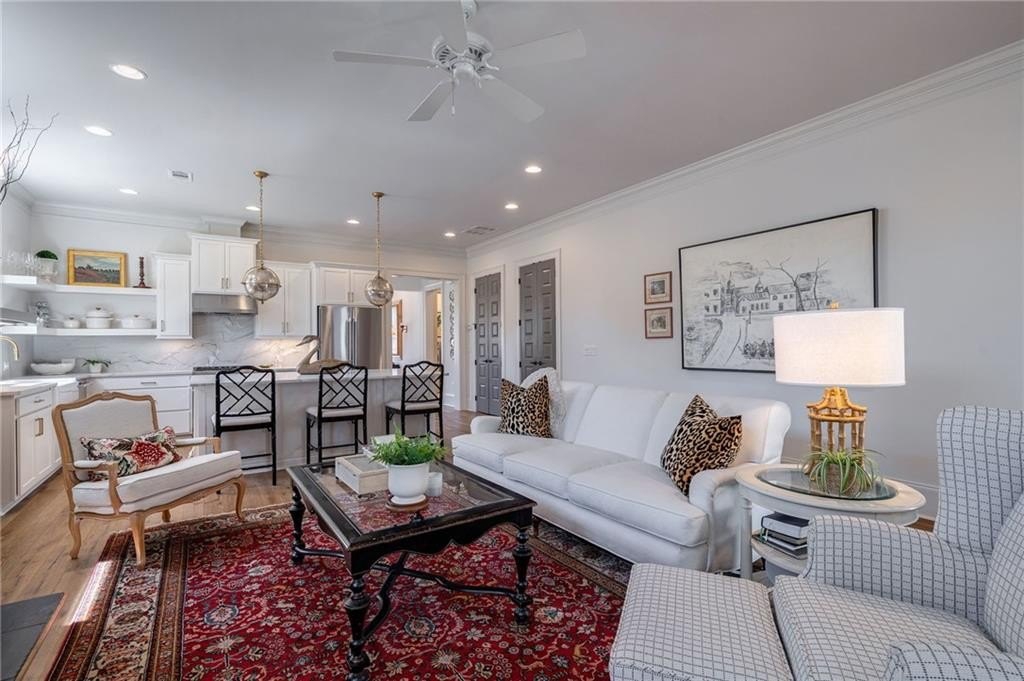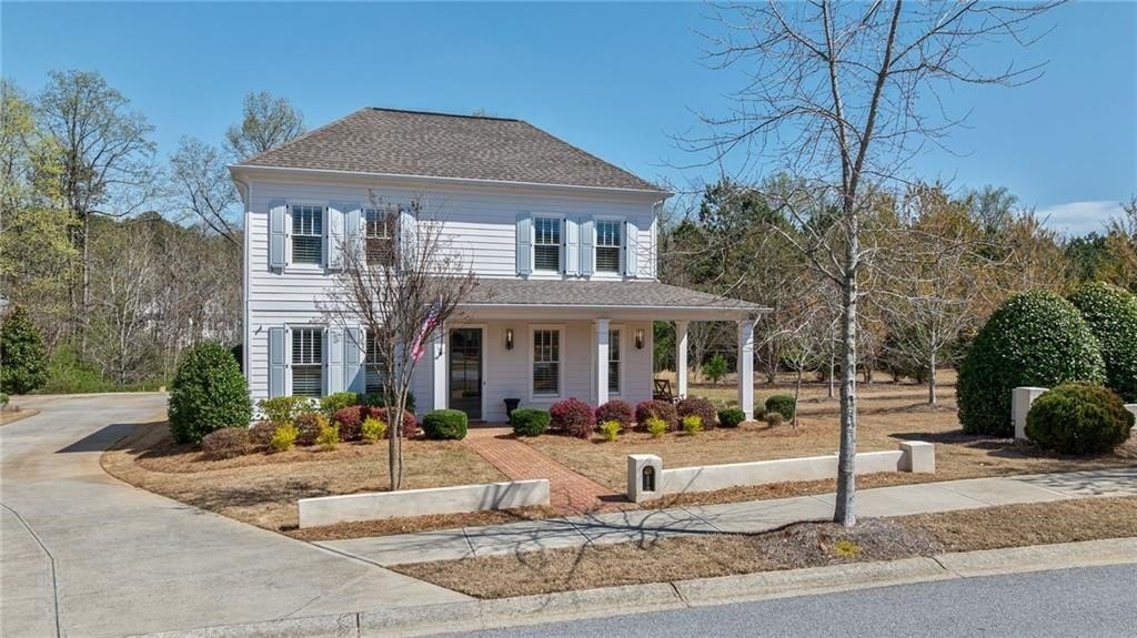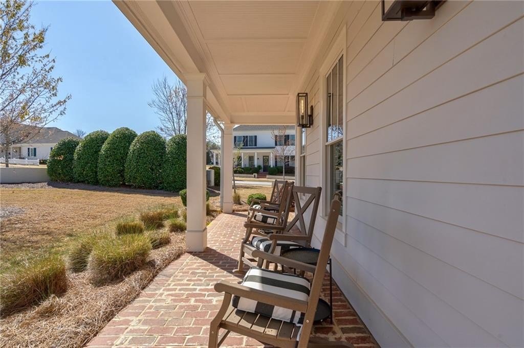 Welcome to 2970 Greenleffe Drive, a picture-perfect Southern charmer nestled in the sought-after Charleston Park neighborhood of The Georgia Club. This beautifully renovated 3-bedroom, 3.5-bathroom home offers 2,380 square feet of thoughtfully curated living space. With timeless curb appeal, a brick walkway, and a wide covered front porch, this home radiates true Southern hospitality. The porch, featuring brick flooring, classic columns, and elegant lighting, offers the ideal setting for morning coffee or evening sunsets while overlooking the tranquil, private greenspace adjacent to the home. Inside, youre greeted by a stunning interior boasting hardwood floors, detailed millwork, and sophisticated finishes throughout. Whether hosting guests or enjoying everyday life, this home delivers the perfect balance of style, comfort, and connection. Step through the front door into a gracious entry hall that immediately sets the tone with its understated elegance. The warm wood flooring and soft neutral palette continue into the formal dining room, where an abundance of natural light streams through plantation-shuttered windows. Ideal for both intimate dinners and lively gatherings, the space offers a timeless layout that adds character just steps from the foyer. The kitchen is truly the heart of this home a beautifully designed space that encompasses both functionality and style. A large center island offers ample seating and storage, while custom milled floating shelves, crisp white custom cabinetry, and dramatic quartzite countertops that extend to the backsplash, elevate the overall aesthetic. A Kohler farmhouse sink and top-of-the-line Thermador stainless-steel appliances including a gas range and French door refrigerator ensure a premium culinary experience. Designer curated Visual Comfort lighting add the perfect finishing touches to the space. Open to the kitchen, the living room provides a relaxed yet sophisticated setting for everyday living or entertaining. Light drifts in, giving the space a bright and airy feel that accentuates the hardwood floors and crown molding. A cozy gas fireplace anchors the space, creating a welcoming focal point topped with a mantle ideal for artwork or a mounted TV. This open-concept layout fosters effortless flow and connection. The main-level primary suite is a true retreat, offering spacious comfort with refined touches. The spacious bedroom boasts stunning hardwood floors and is filled with natural light. The luxurious ensuite bath features dual vanities, a dedicated makeup station, sleek gold fixtures and Visual Comfort lighting. The oversized tiled shower includes both a rain shower head and a slider bar hand shower, and a built-in bench for added comfort. A generously sized walk-in closet with custom closet system connects directly to the laundry room, creating unmatched convenience. Upstairs, two additional bedrooms and a loft space provide flexibility for guests, family, and home office needs. One bedroom includes its own en-suite bath, while a second full bathroom is easily accessed from the hallway. Each space is designed for comfort and practicality, with tasteful finishes and ample storage. Outside, a private courtyard awaits complete with a covered patio, easy-care turf grass, and a beautifully lit privacy wall. This inviting space is perfect for outdoor dining, entertaining, or simply relaxing. Ceiling fans and Visual Comfort sconces enhance both comfort and ambiance, while direct access to the oversized two-car garage adds ease to everyday living. Dont miss the opportunity to call 2970 Greenleffe Drive home. With its thoughtful design, luxurious details, and prime location in The Georgia Club, this Southern beauty offers a lifestyle of elegance, warmth, and ease.