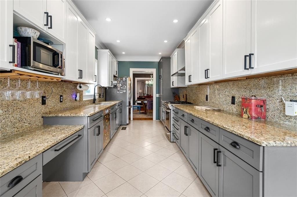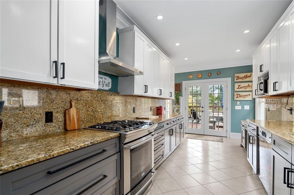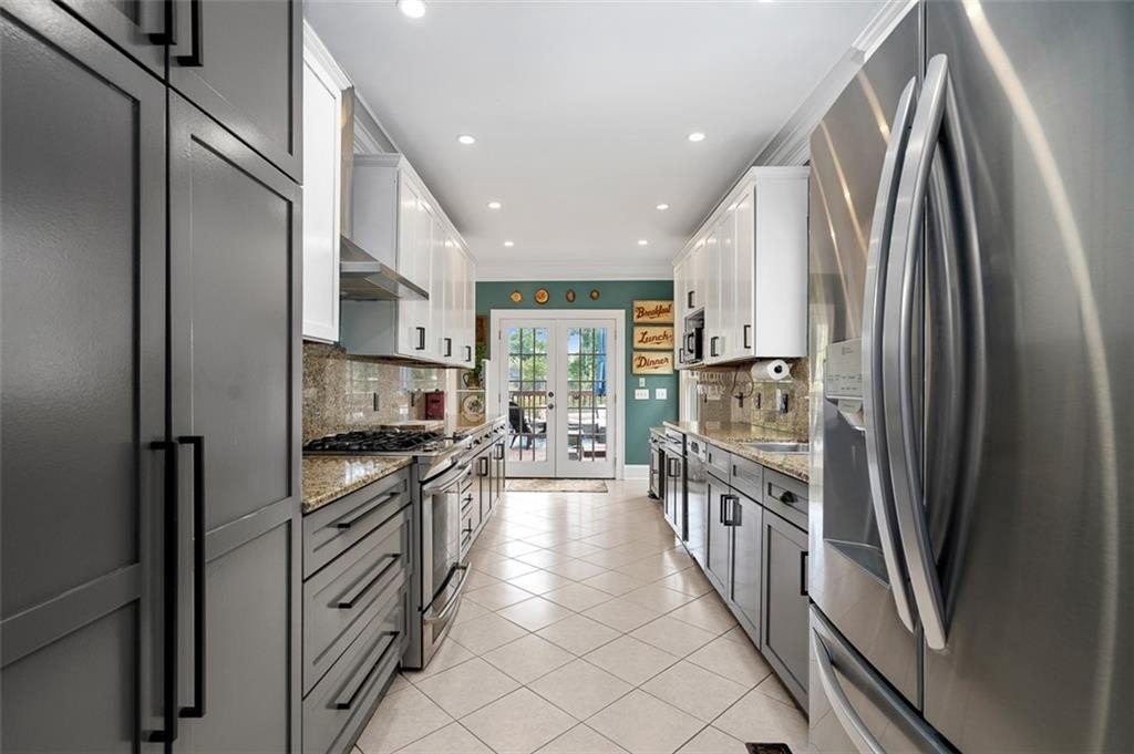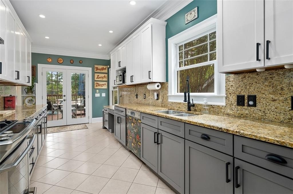 Step inside to find hardwood floors throughout, a gas fireplace, and a bright, open layout ideal for entertaining. The renovated kitchen features stainless-steel appliances, granite countertops, gas cooktop, two-tone cabinetry, and under-cabinet lighting. A set of French doors opens to a spacious deck and fenced backyard with mature trees, flagstone patio, firepit seating, and a koi pond — perfect for year-round enjoyment.