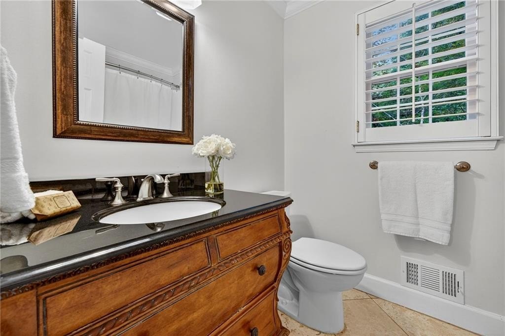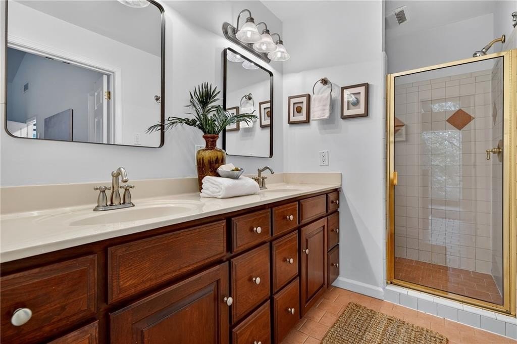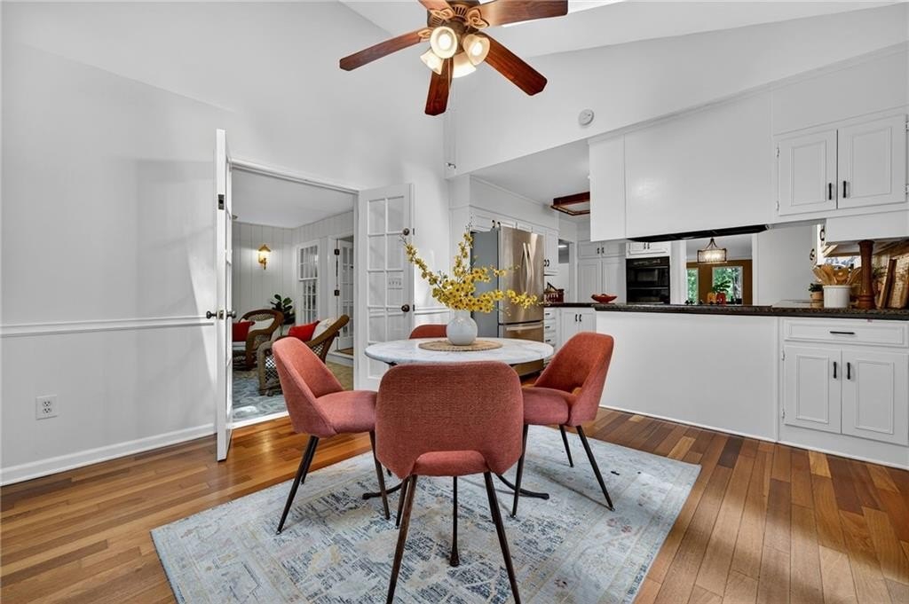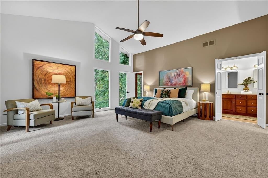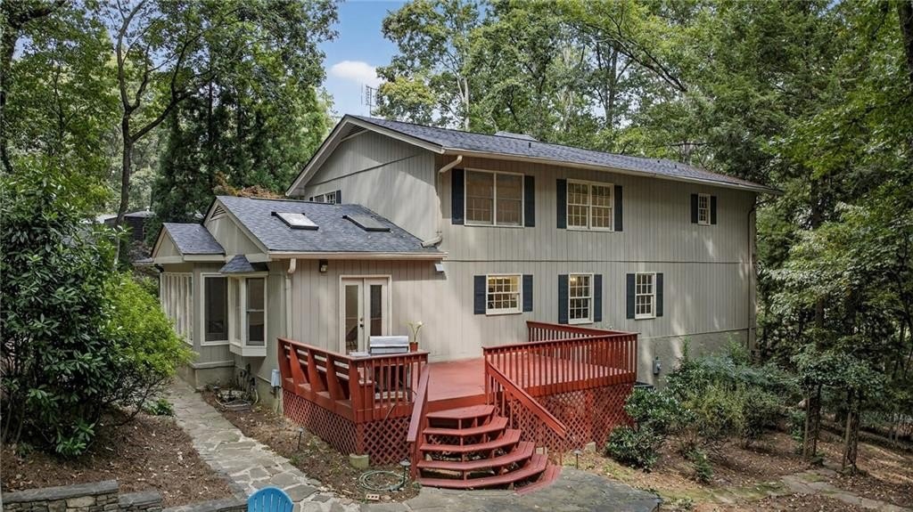 Nestled on a private 1-acre lot across from Dunwoody Country Club Golf Course, this timeless modern residence offers the perfect balance of serenity, privacy, and refined design. Ideally situated just minutes from shopping, dining, and GA-400, the home showcases exceptional craftsmanship with vaulted ceilings, floor-to-ceiling windows, and a beautiful year-round sunroom with casement windows. The main level welcomes you with a gracious foyer, formal dining room, private office or sitting room, and expansive family and living rooms, all with breathtaking views of nature and the golf course. A private guest suite with full bath provides comfort and convenience. The chef’s kitchen combines function and style, featuring stone countertops, white cabinetry, breakfast bar, and a sunlit eat-in area overlooking the tranquil koi pond and waterfall. Outdoor living shines with an expansive deck, ideal for entertaining, al fresco dining, or quiet relaxation. Upstairs, the owner’s suite is a true retreat with vaulted ceilings, a private covered porch, large walk-in closet, and spa-inspired bath with tongue-and-groove ceiling, skylights, whirlpool tub, and double vanity. Two additional bedrooms, a full bath, and a versatile office or exercise room complete the upper level. The lower level offers a side-entry garage, workshop, and ample storage. Surrounded by lush landscaping, mature trees, and the calming backdrop of the golf course, this property delivers a rare blend of natural beauty, privacy, and convenience, just minutes from top-rated schools, parks, and all that Dunwoody has to offer.