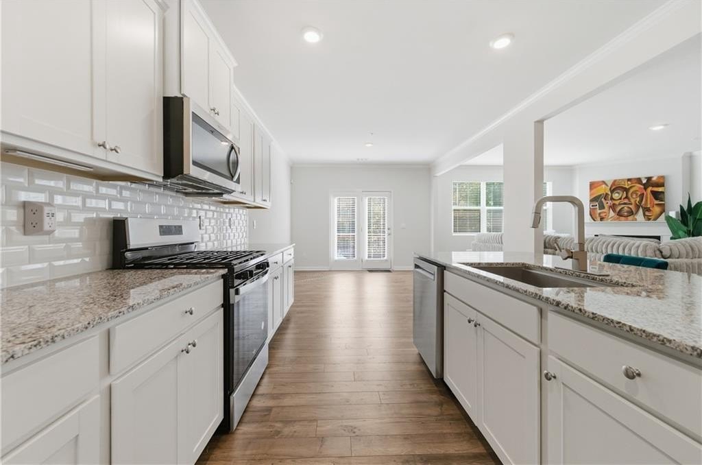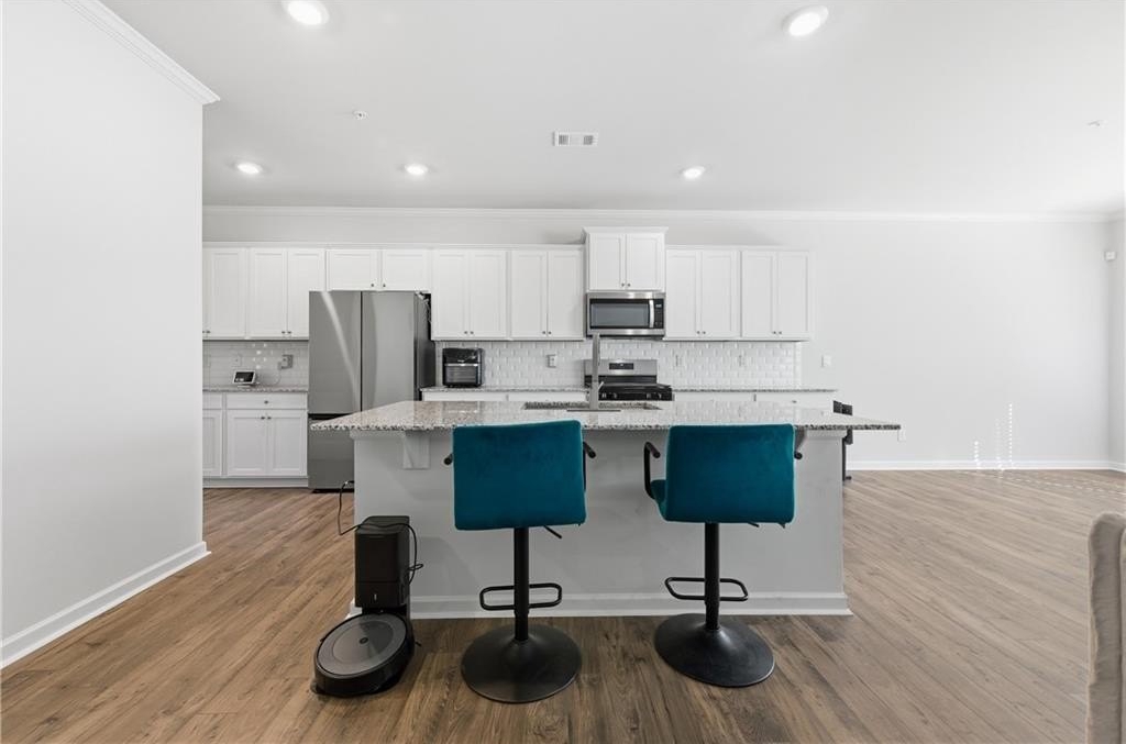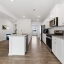 countertops, gray cabinetry, a tiled backsplash, center island, walk-in pantry, and a designated coffee bar or flex living area. All stainless