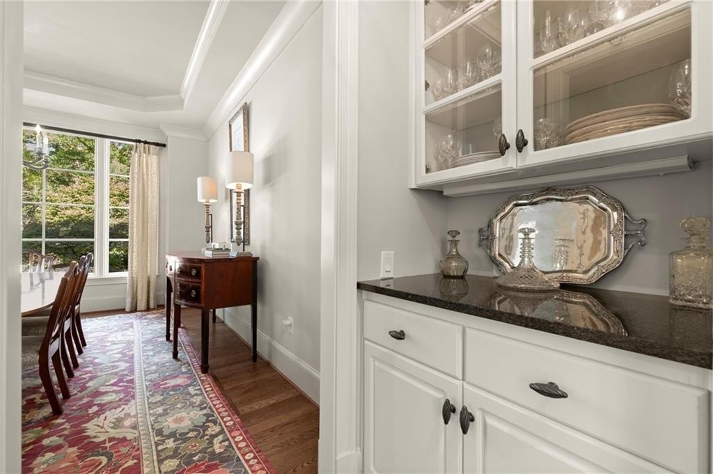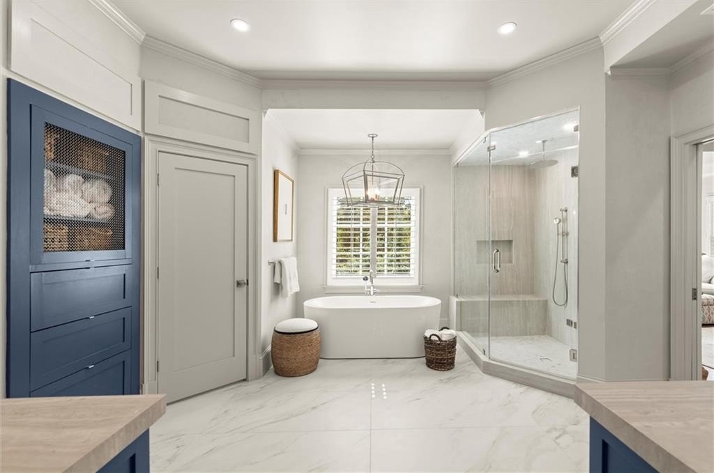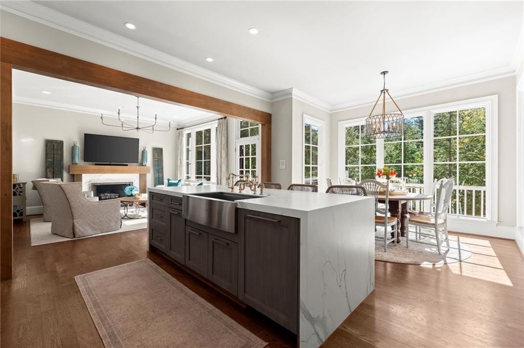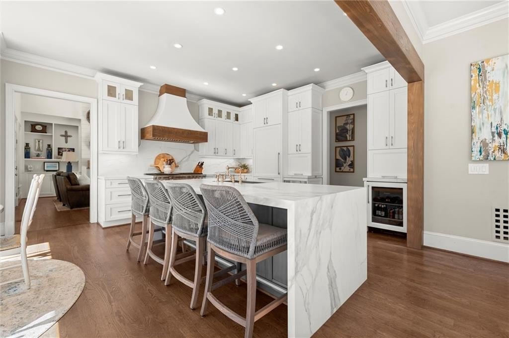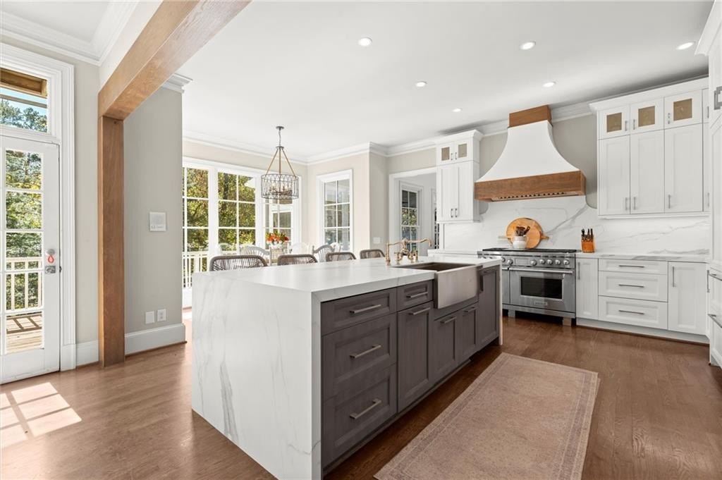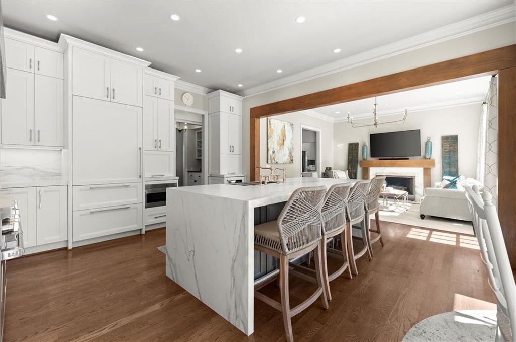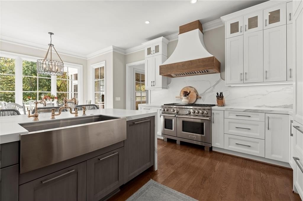 The designer chef’s kitchen is truly show-stopping, featuring a bespoke vent hood, expansive waterfall island, premium stainless-steel appliances, and abundant custom cabinetry with impeccable finishes and materials. The kitchen flows effortlessly into the keeping room with a beautiful fireplace and out to the entertainers’ deck, overlooking the lush, level, and impeccably manicured grassy backyard. A walk-in laundry room and a sophisticated powder room with bar area complete the main level. Three car garage also on this level.