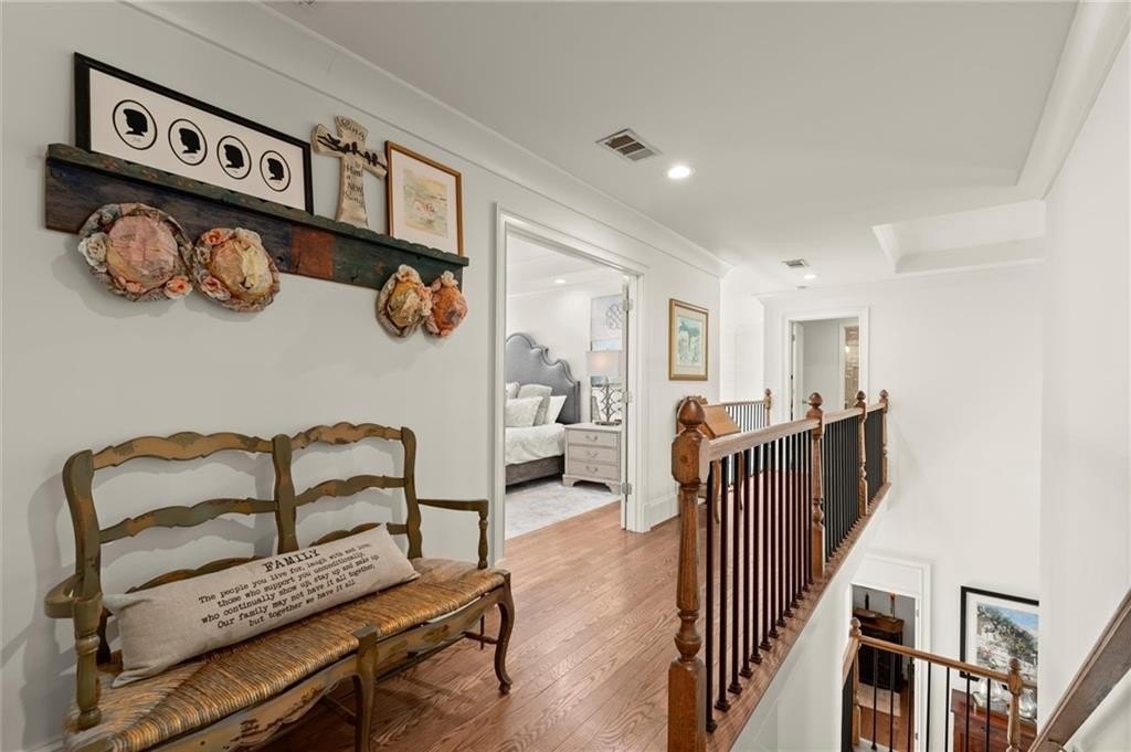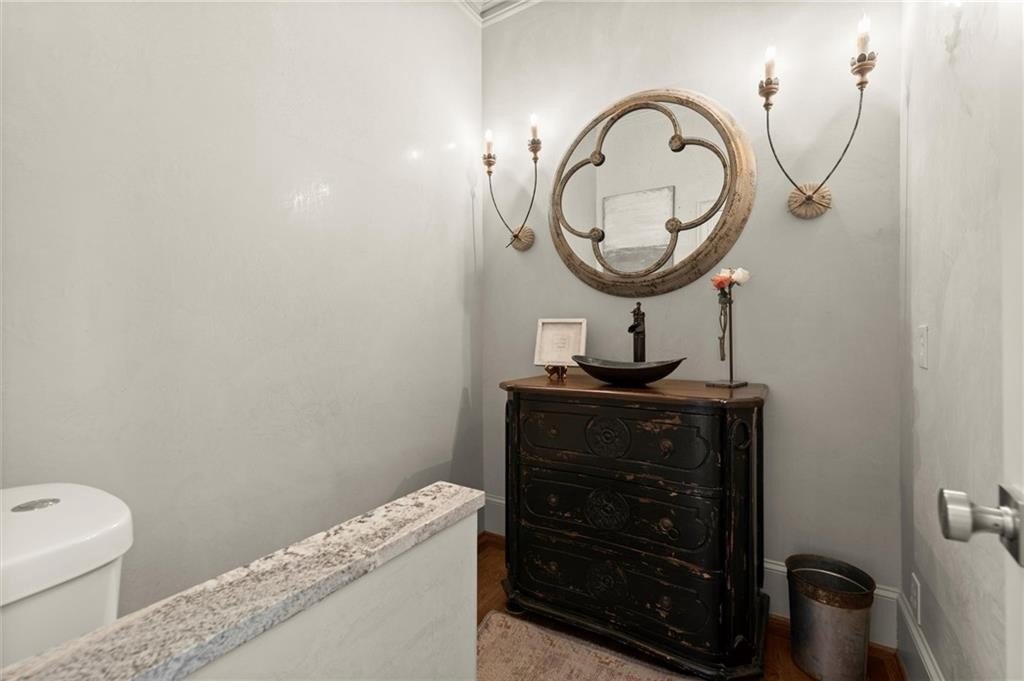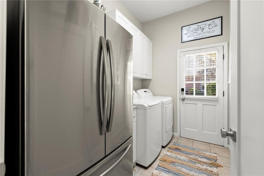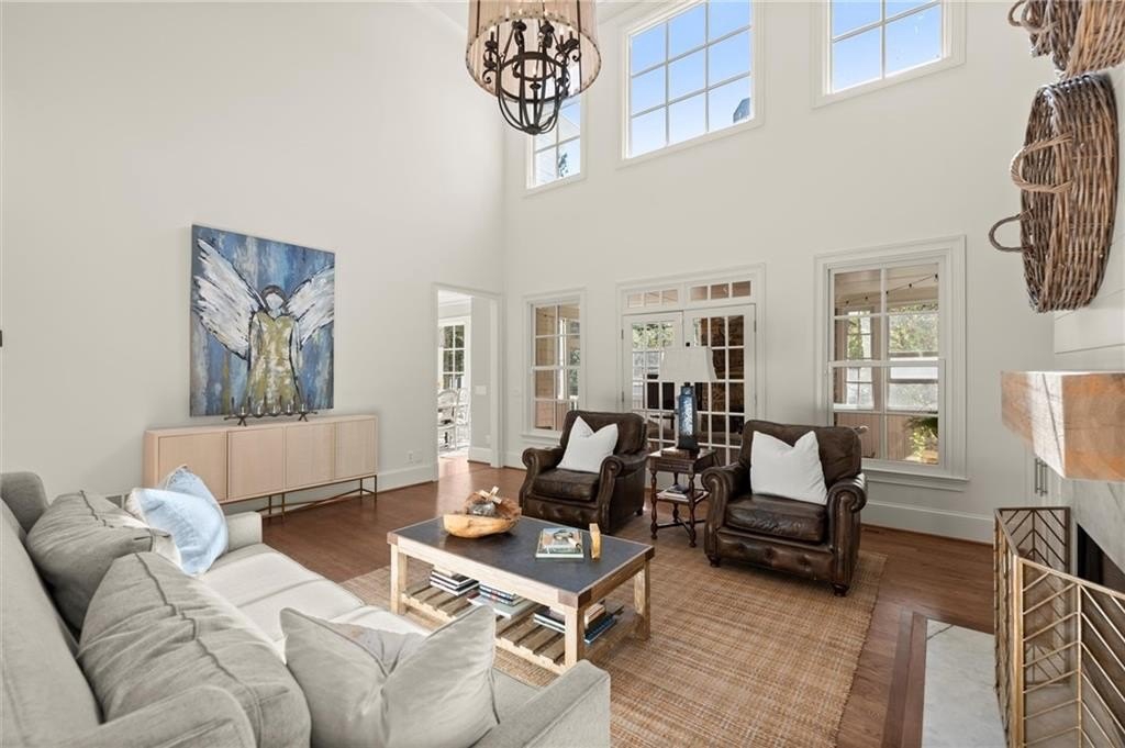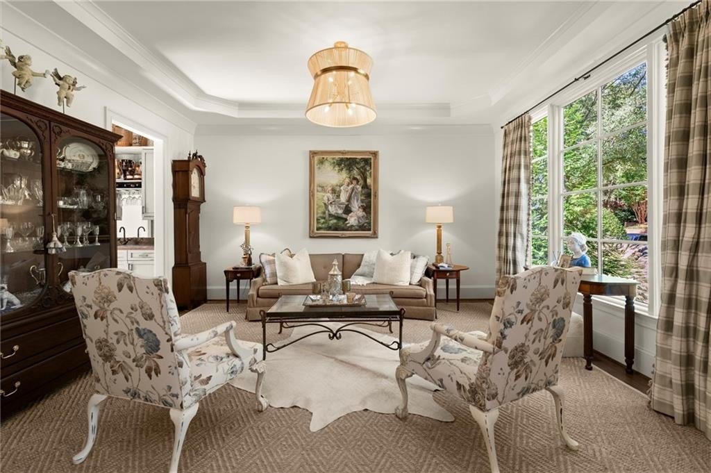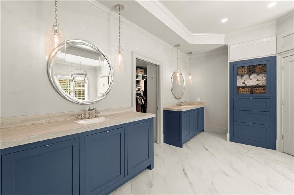The designer chef’s kitchen is truly show-stopping, featuring a bespoke vent hood, expansive waterfall island, premium stainless-steel appliances, and abundant custom cabinetry with impeccable finishes and materials. The kitchen flows effortlessly into the keeping room with a beautiful fireplace and out to the entertainers’ deck, overlooking the lush, level, and impeccably manicured grassy backyard. A walk-in laundry room and a sophisticated powder room with bar area complete the main level. Three car garage also on this level.