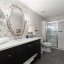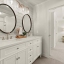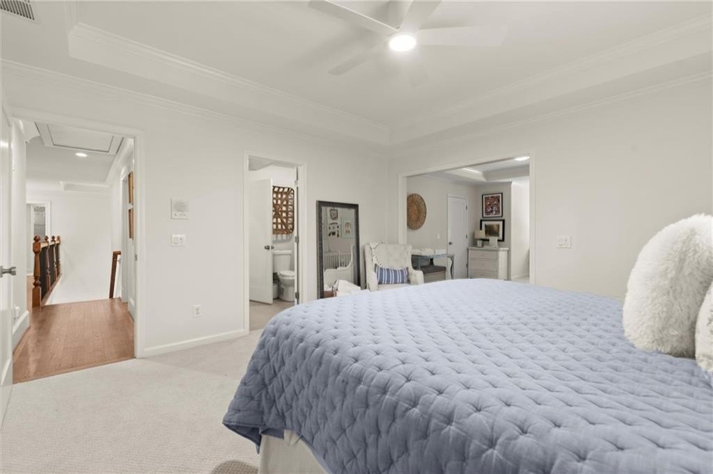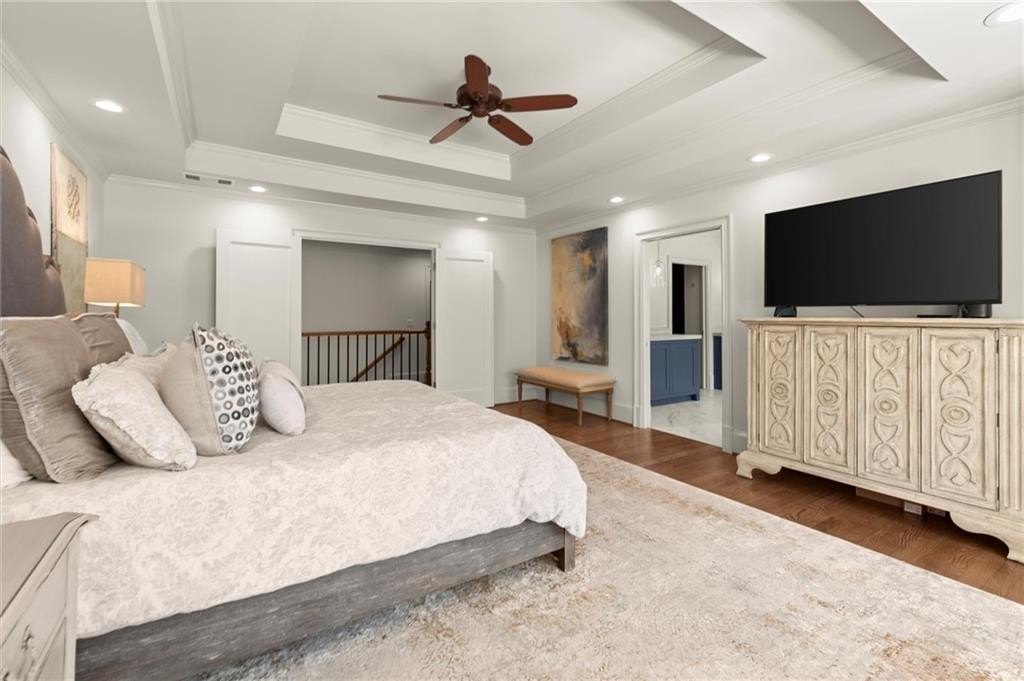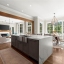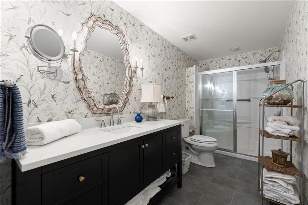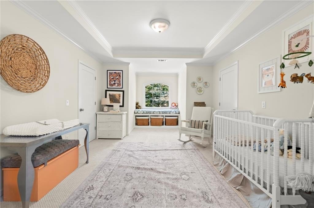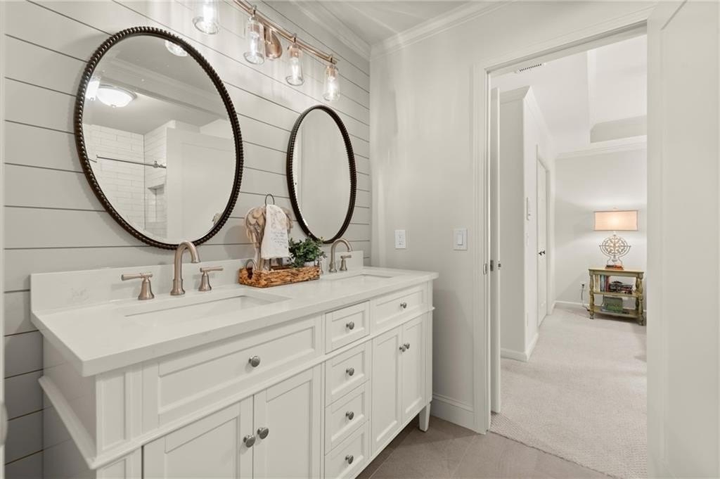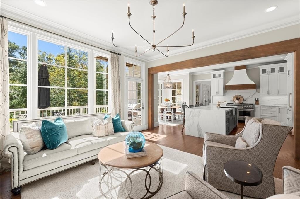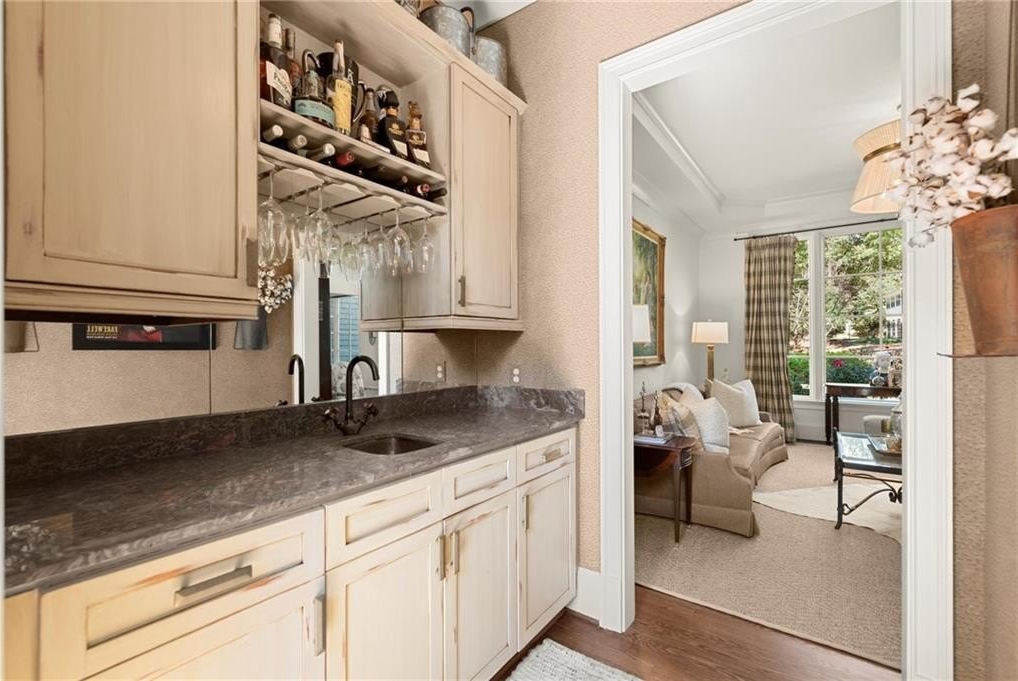 The designer chef’s kitchen is truly show-stopping, featuring a bespoke vent hood, expansive waterfall island, premium stainless-steel appliances, and abundant custom cabinetry with impeccable finishes and materials. The kitchen flows effortlessly into the keeping room with a beautiful fireplace and out to the entertainers’ deck, overlooking the lush, level, and impeccably manicured grassy backyard. A walk-in laundry room and a sophisticated powder room with bar area complete the main level. Three car garage also on this level.