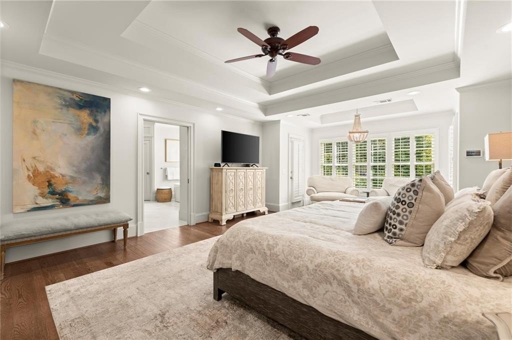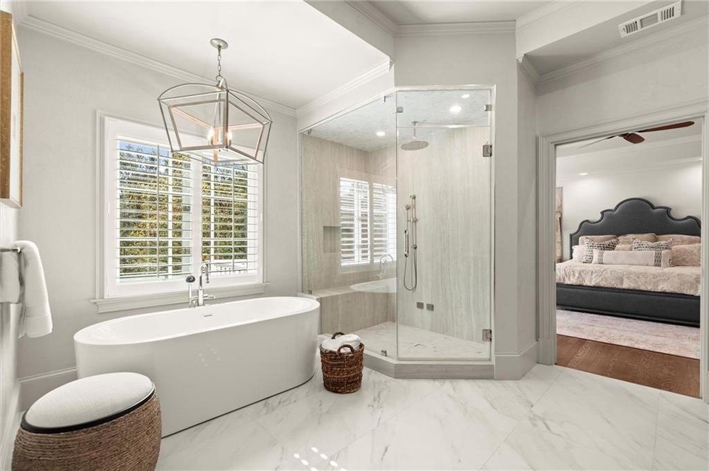 Upstairs, the primary suite is a serene sanctuary with a private sitting area, a lavish spa-inspired bath with steam shower, separate soaking tub, custom vanities, and a custom-designed walk-in closet. Three additional bedrooms complete the upper level — one with an ensuite bath and two connected by a Jack-and-Jill bath with dual vanities.