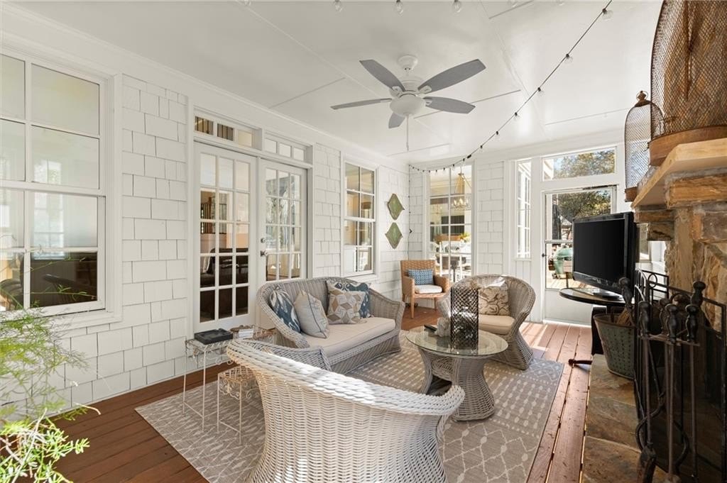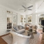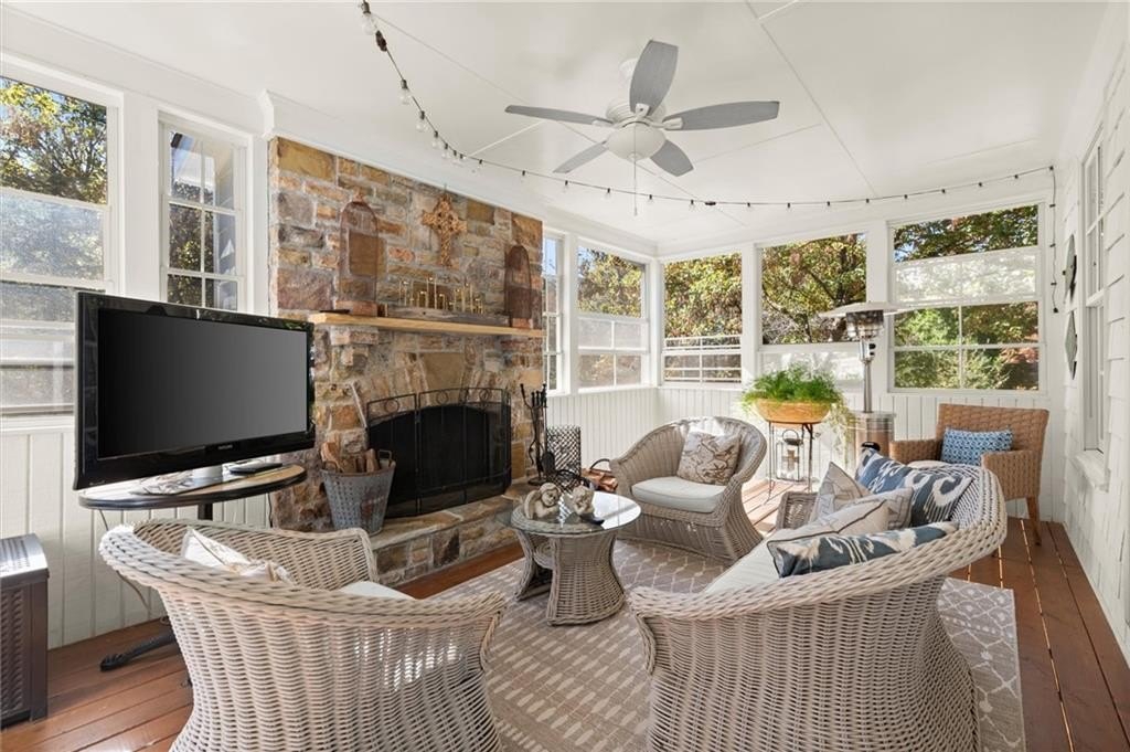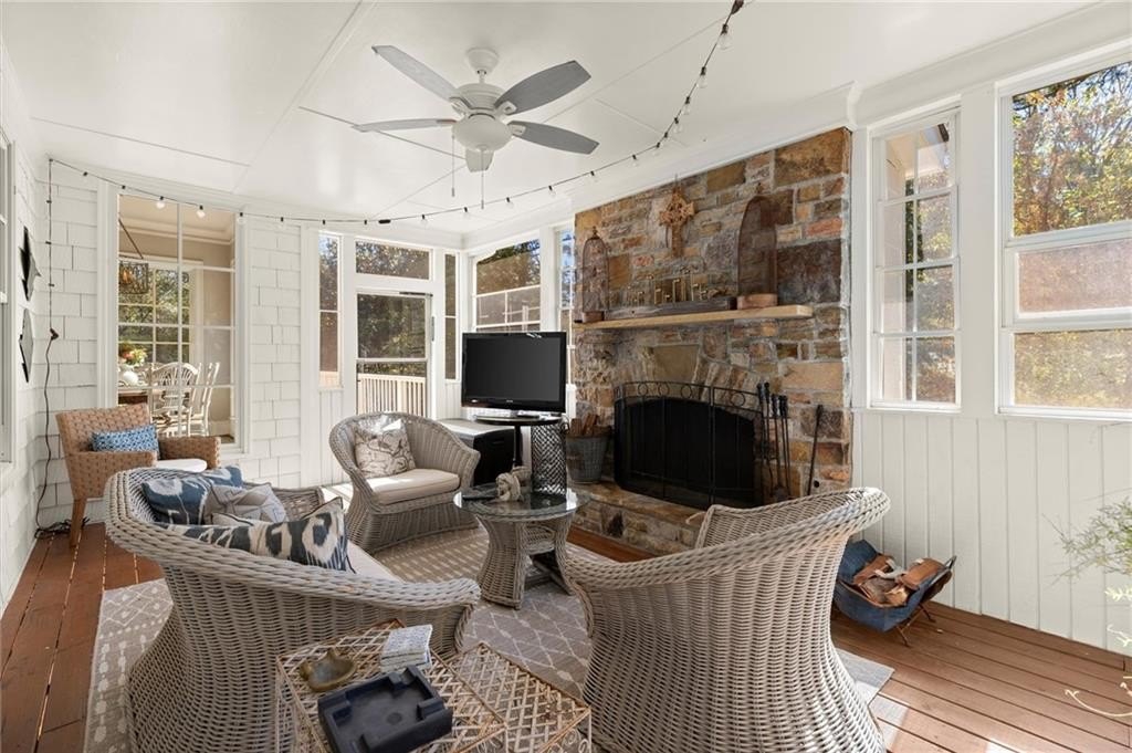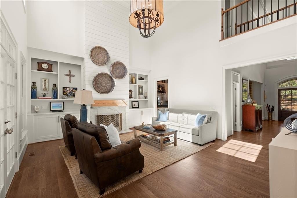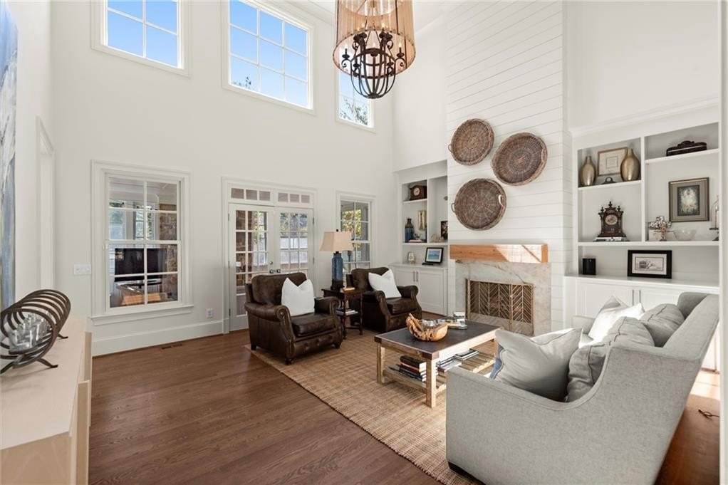 At the heart of the home, a dramatic two-story great room showcases custom built-ins, a shiplap fireplace, and seamless access to the enchanting screened veranda, complete with a second fireplace — ideal for year-round gatherings or quiet evenings by the fire.