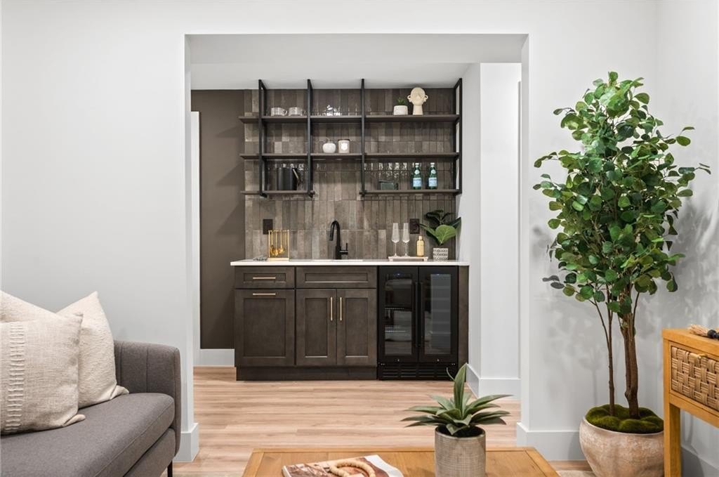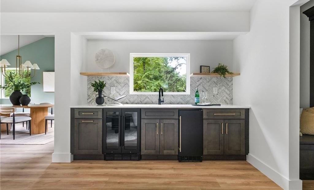 Inside, the open kitchen is a showstopper, with a slick FORNO appliance package, elegant waterfall counters, a timeless herringbone backsplash, smooth sight lines, and soft-close cabinetry—all designed for both style and function. You’ll love how the kitchen cohesively stretches out with the coffee bar with an additional sink, ice maker and wine cooler. This is how you design to entertain. You’ll also appreciate the matching laundry cabinetry, wet sink and an extra powder bath for your guests.