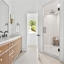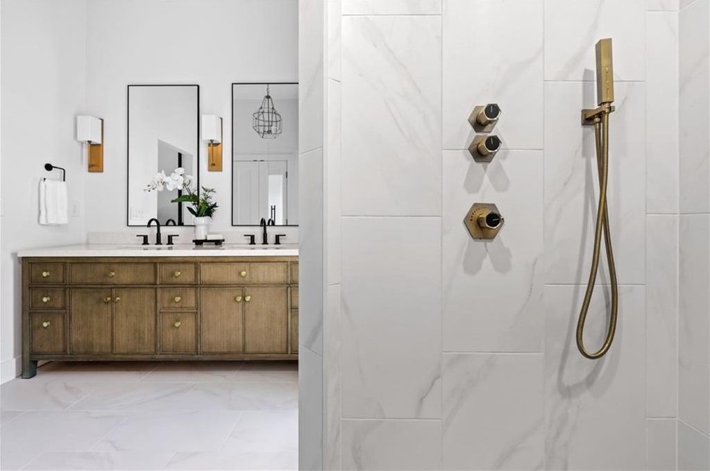 The elegant primary suite rests on the main floor, offering a spa-inspired retreat with a large walk-in shower, custom vanities and hardware, and a thoughtfully designed, walk-in closet system. Just down the hall, a beautiful guest suite with its own full bath ensures comfort and privacy for visitors.