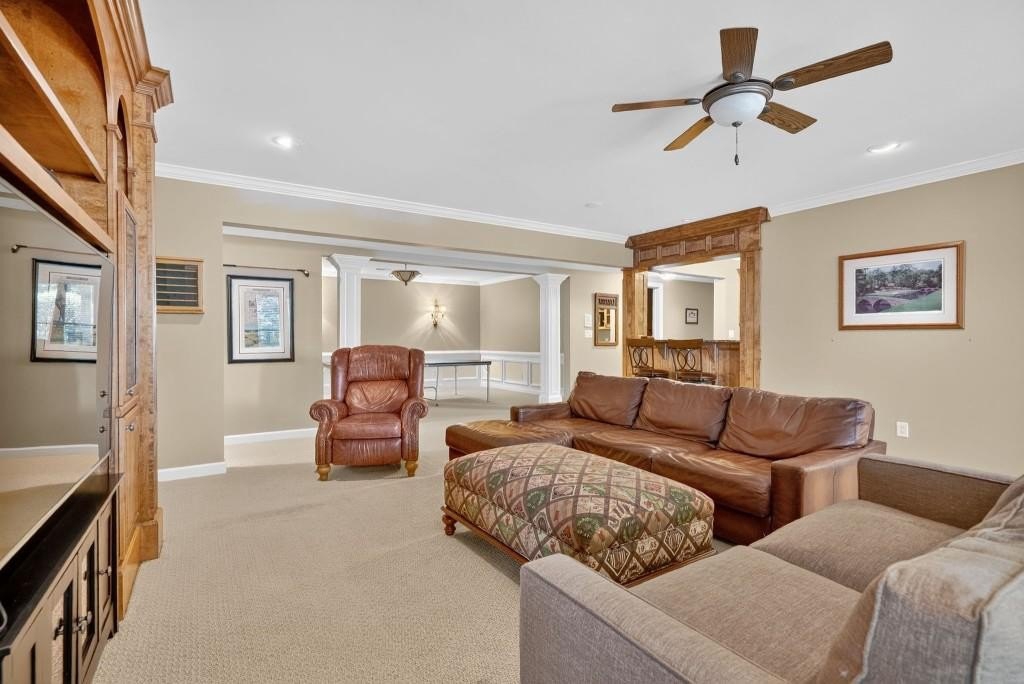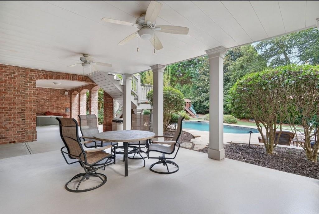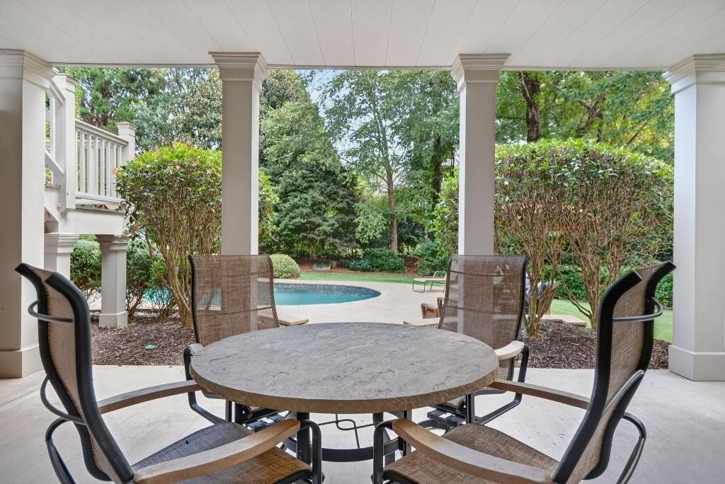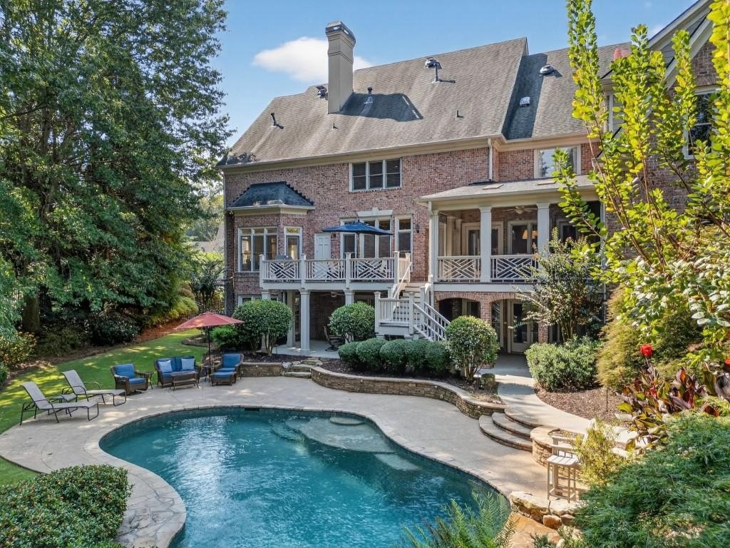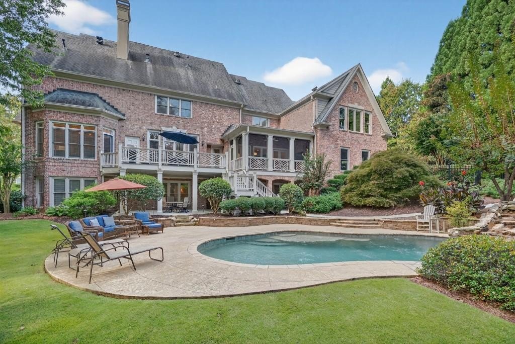 Experience resort-style living in this elegant estate on a private cul-de-sac in the highly sought-after community Winfield on the River, a one-of-a-kind gated neighborhood nestled on the serene banks of the Chattahoochee River. With its timeless brick architecture and natural landscaping, this home is a special retreat with luxurious amenities and exceptional indoor-outdoor living on +/- 0.70 acres. Step inside to a grand two-story foyer flanked by a formal dining room and a flexible office/library/den space-perfect for both elegant entertaining and everyday living. The expansive ceilings and wall of windows in the family room flood the space with natural light, while the open-concept layout flows seamlessly into the gourmet kitchen, complete with high-end appliances, abundant cabinetry, and an entertainer's island. Just off the kitchen, a spacious screened porch and deck overlook your private and spacious backyard oasis. Outside, your own backyard paradise awaits, featuring a stunning saltwater pool with a waterfall, framed by lush, manicured landscaping for maximum privacy and relaxation. The main level owner's suite is a peaceful retreat with a spa-like ensuite and serene views. Upstairs are three spacious bedrooms, three bathrooms, and a versatile bonus room-ideal for a playroom, teen suite, or additional living space. A large unfinished space with a private entry also has the potential to be an additional private suite for guests or multigenerational living. The daylight terrace level is a versatile space for everyday entertainment or hosting guests, offering a full pool bath, tiled playroom with closet, expansive rec room, gym, private office or 5th bedroom with full bath, fireside family room with wet bar, workshop, and extensive storage. Off the terrace level is an additional large covered patio space. Bordering a beautiful river across from a national park with recreation space and hiking trails, the neighborhood feels private and secluded, yet boasts proximity to premier shopping and dining at The Forum and top-rated public and private schools, including Johns Creek High School, Autrey Mill Middle School, Medlock Bridge Elementary School, Perimeter Christian School, and the Wesleyan School. The Atlanta Athletic Club is just minutes away. This home truly combines classic elegance with modern luxury in one of Johns Creek's most desirable gated communities.