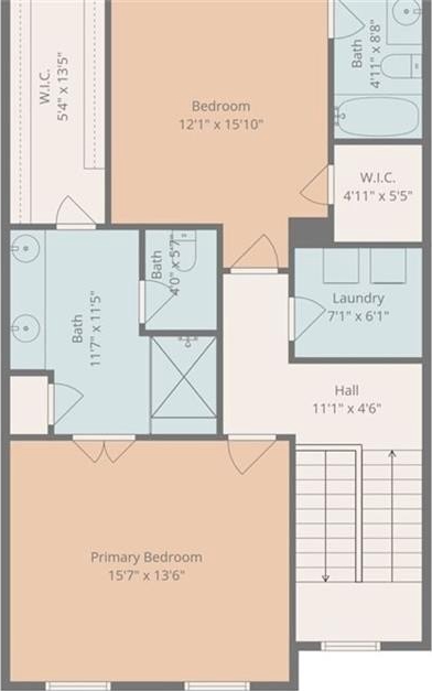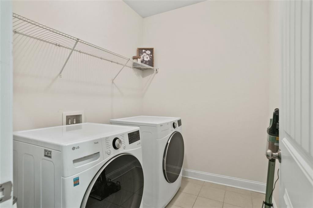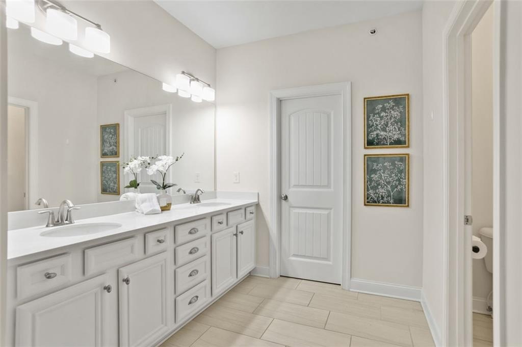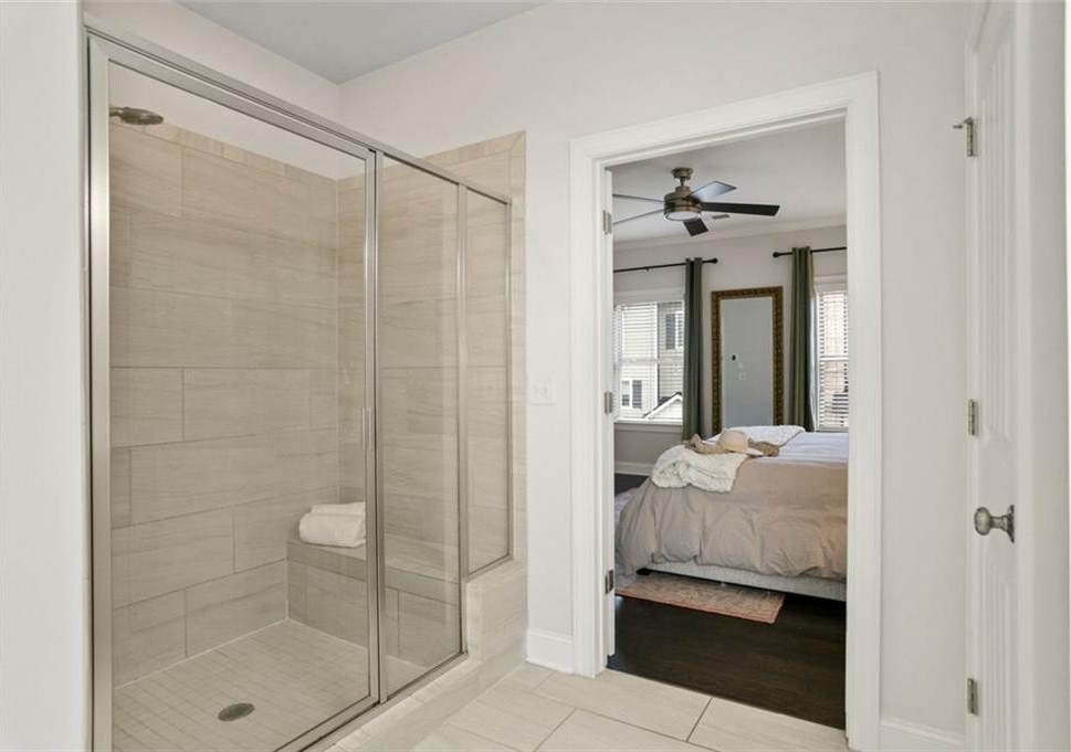 Upstairs, the roomy owner’s suite features a walk-in closet, double vanities, and a walk-in shower. A secondary bedroom with its own full bath and a convenient laundry room are also on this level.