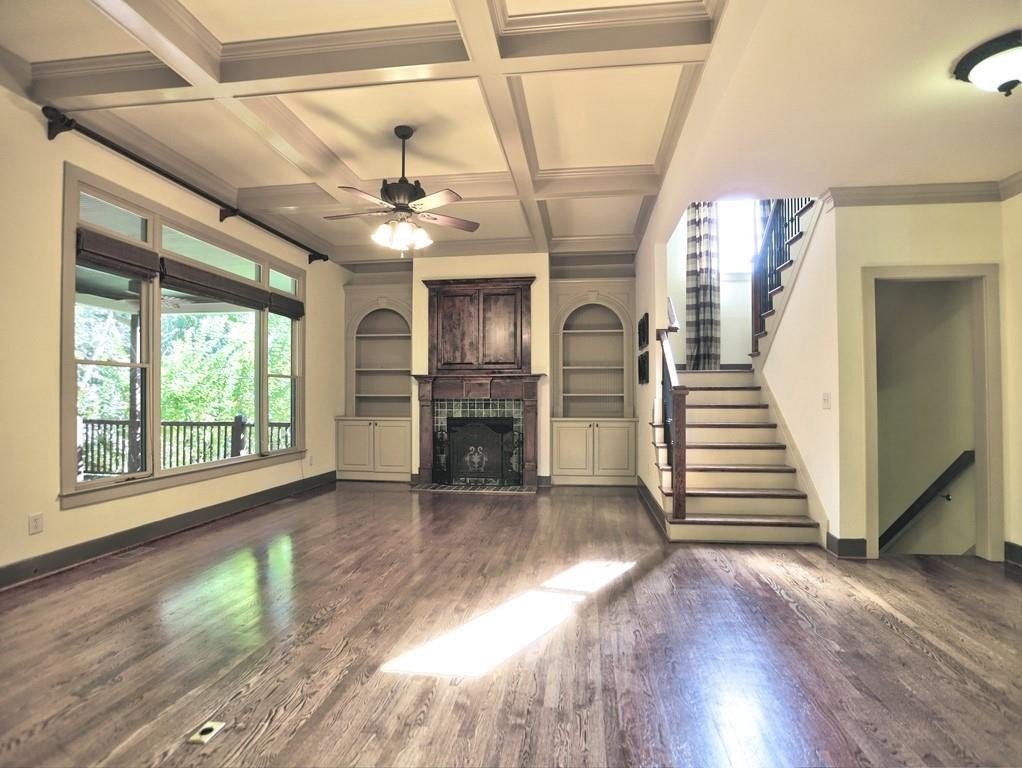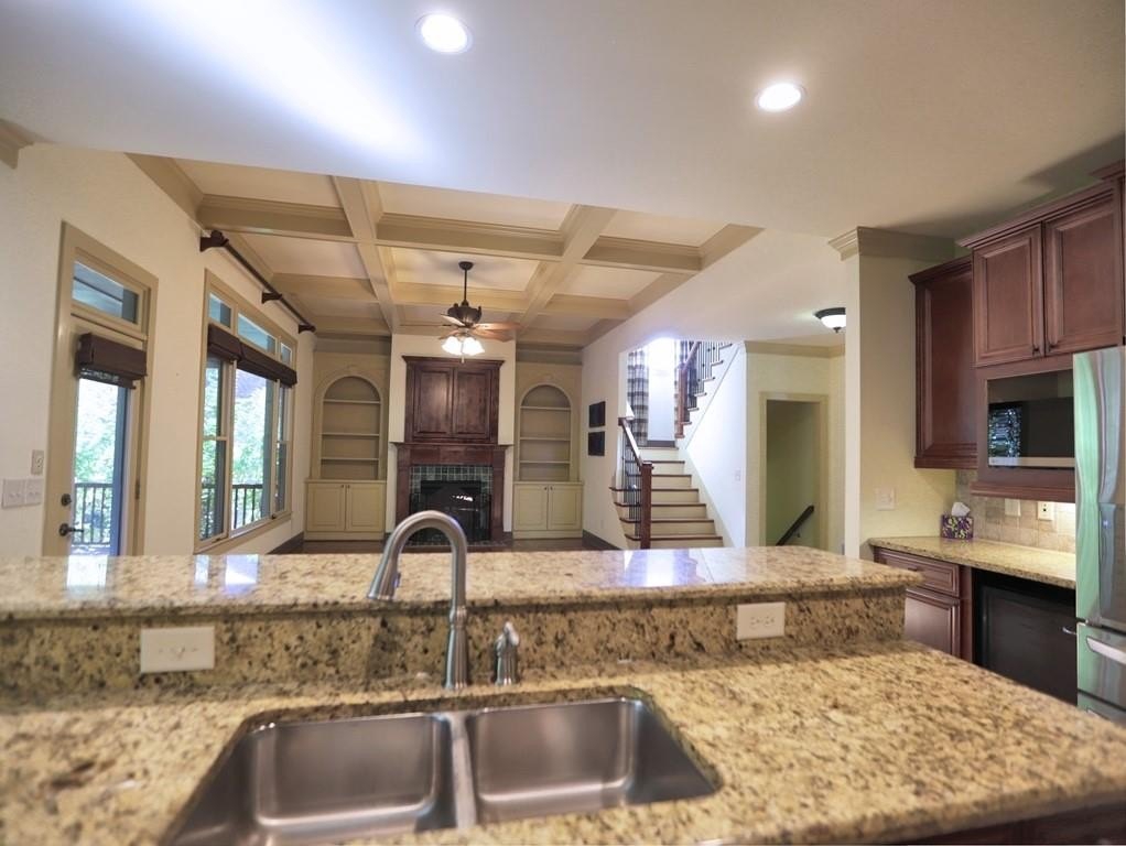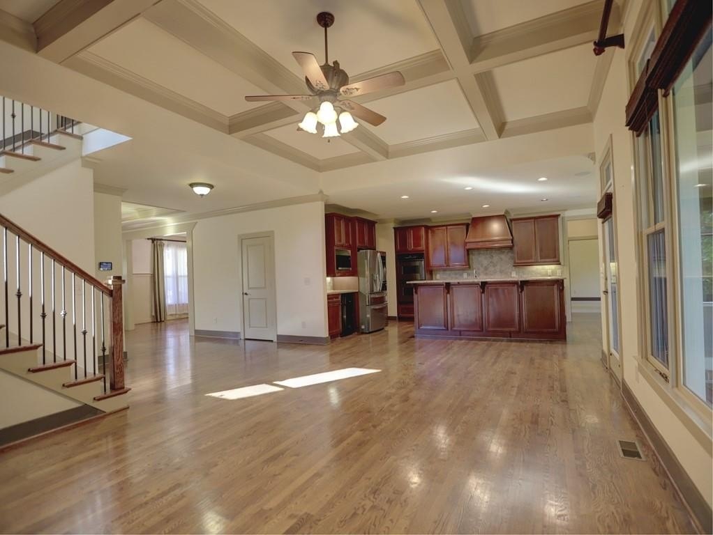 floorpan opens to the Family Room with Coffered Ceiling & Wall of Windows overlooking the
