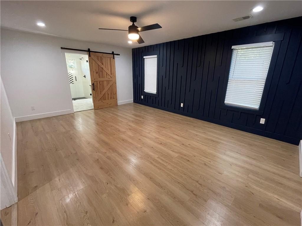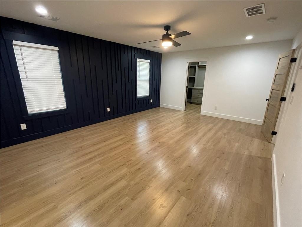 family room with an amazing custom fireplace. The owner’s suite is super spacious with a beautiful accent wall and a