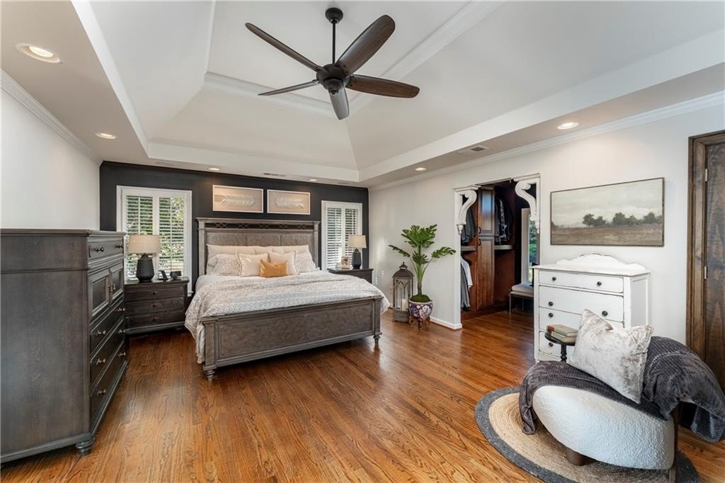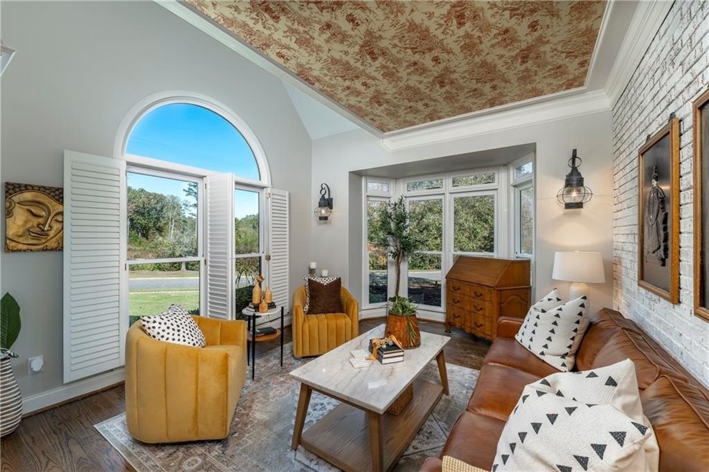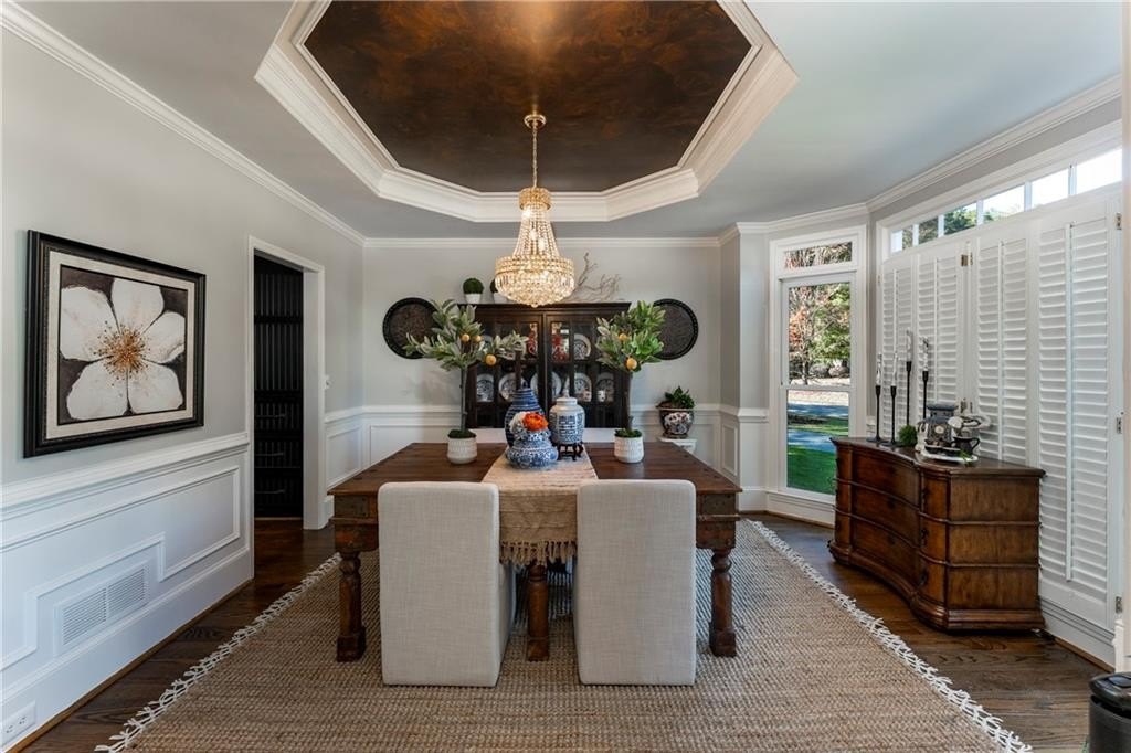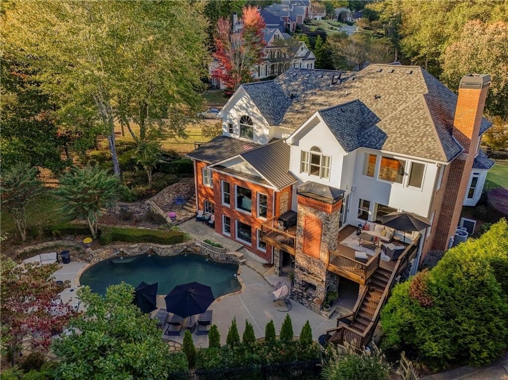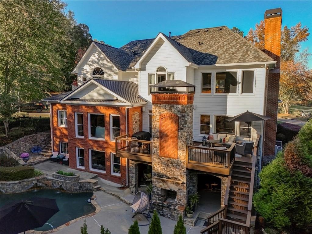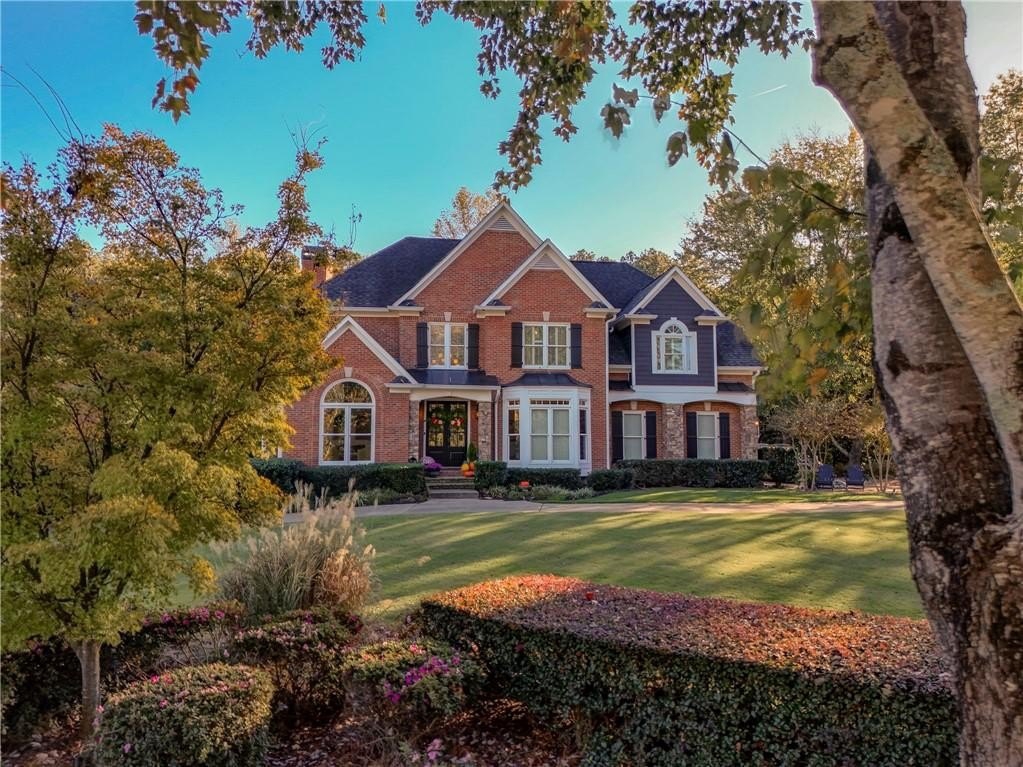 Welcome to this stunning and elegant four-sided brick home in the highly desirable Bradshaw Farm community. The semi-circular driveway, beautifully manicured yard, and three-car garage make a grand first impression, while the home’s timeless architecture and thoughtful design invite you to come in and stay awhile. Inside, a two-story foyer opens to a great room with soaring ceilings and one of the home’s two fireplaces. A formal dining room sets the stage for gatherings and celebrations, while the eat-in kitchen with large keeping room and second fireplace is a dream for any chef—featuring Viking appliances including a six-burner cooktop with griddle, pot filler, warming drawer, ice maker, large farmhouse sink and additional prep sink, plus a walk-in pantry for abundant storage. There is plenty of counter space for any aspiring chef or baker. Don't miss the formal living room where you can sit and watch the golfers out the arched window.
