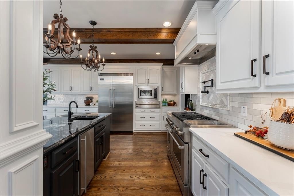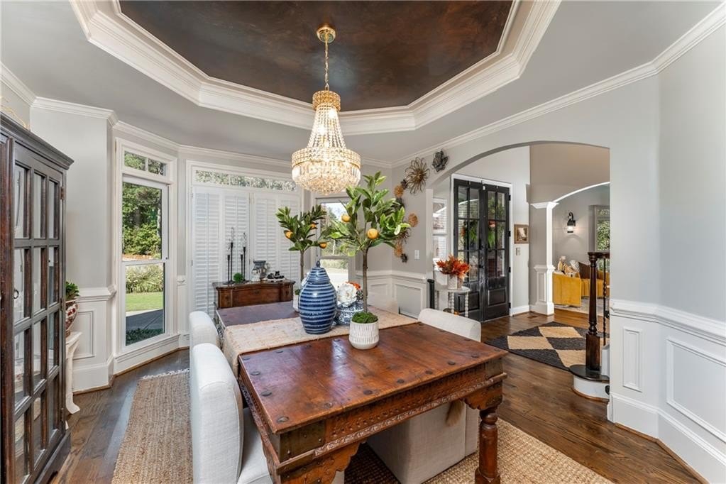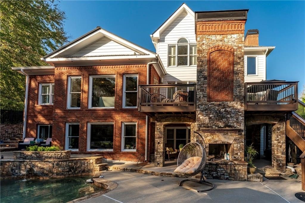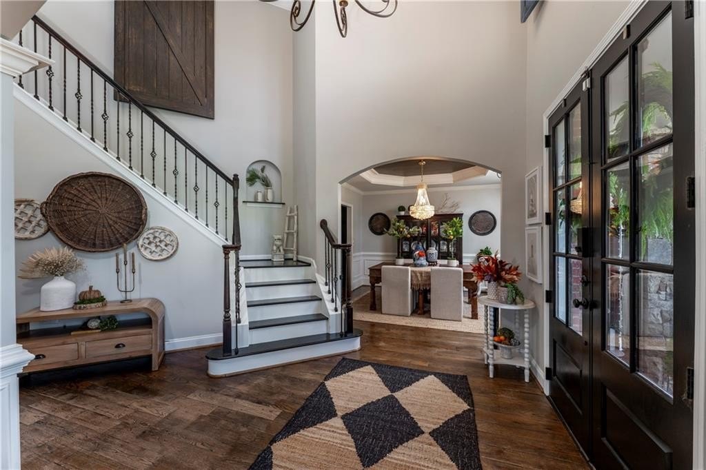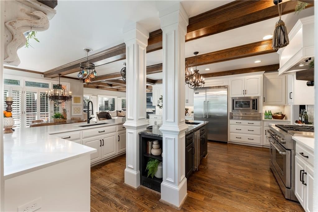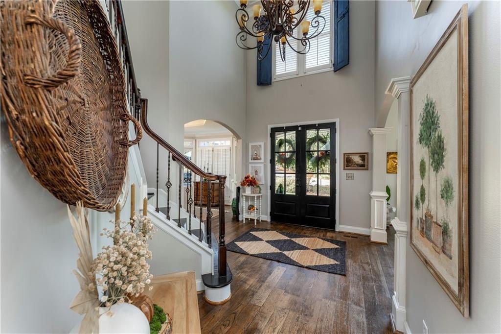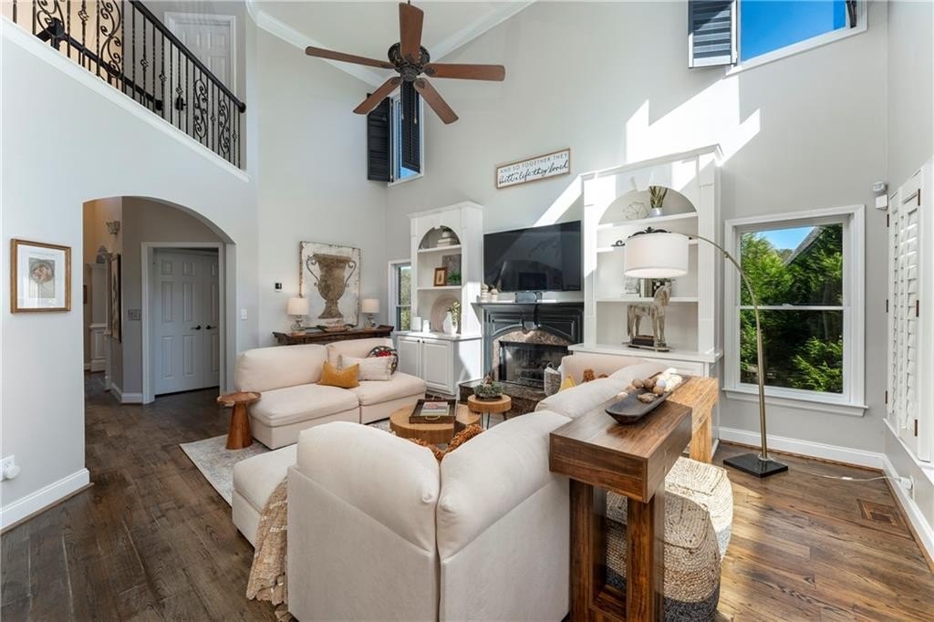 Welcome to this stunning and elegant four-sided brick home in the highly desirable Bradshaw Farm community. The semi-circular driveway, beautifully manicured yard, and three-car garage make a grand first impression, while the home’s timeless architecture and thoughtful design invite you to come in and stay awhile. Inside, a two-story foyer opens to a great room with soaring ceilings and one of the home’s two fireplaces. A formal dining room sets the stage for gatherings and celebrations, while the eat-in kitchen with large keeping room and second fireplace is a dream for any chef—featuring Viking appliances including a six-burner cooktop with griddle, pot filler, warming drawer, ice maker, large farmhouse sink and additional prep sink, plus a walk-in pantry for abundant storage. There is plenty of counter space for any aspiring chef or baker. Don't miss the formal living room where you can sit and watch the golfers out the arched window.
