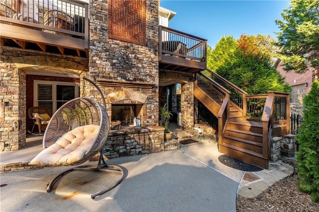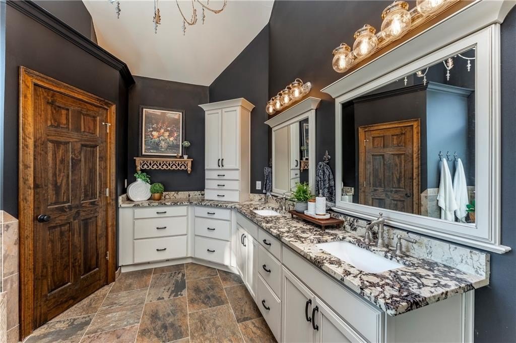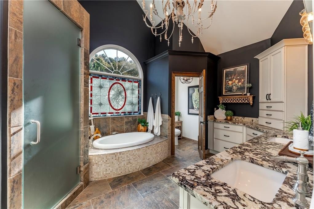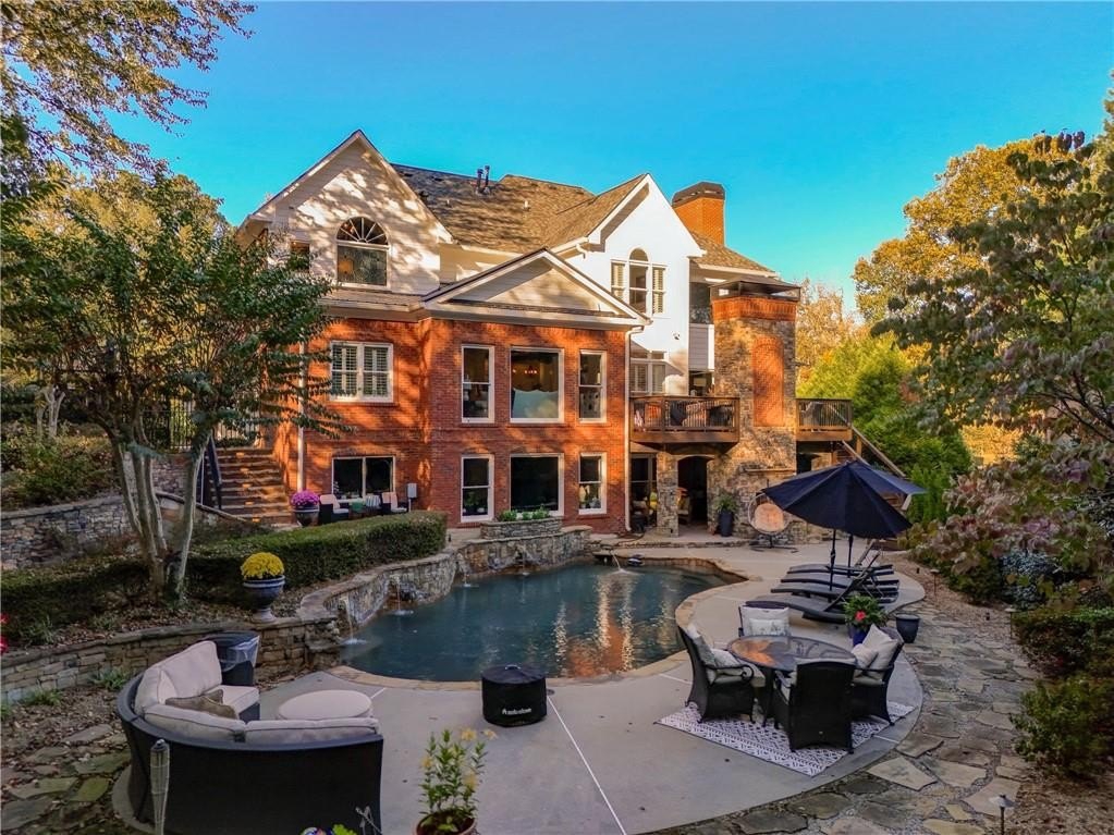 Step outside to your own backyard oasis, complete with a heated gunite pool with an alluring waterfall feature. There are two outdoor fireplaces for cozy evenings. One is double sided and is a real show stopper! The fully fenced back yard even offers a flat area for a play space. The exterior is even more beautiful at night when is it is all lit up with accent and path lighting.